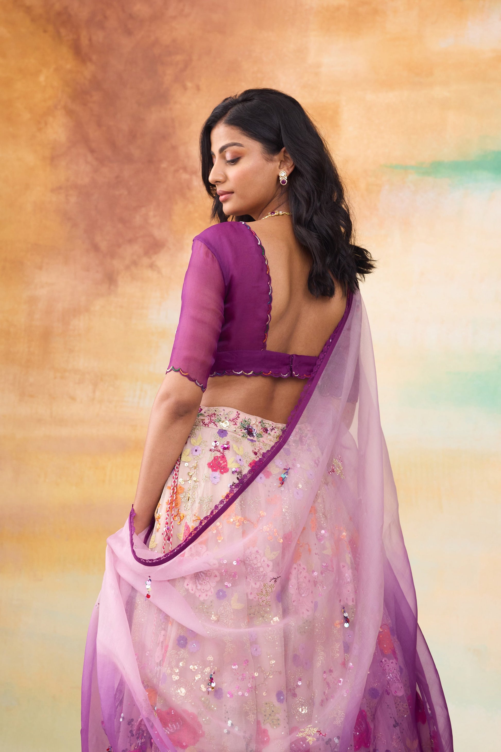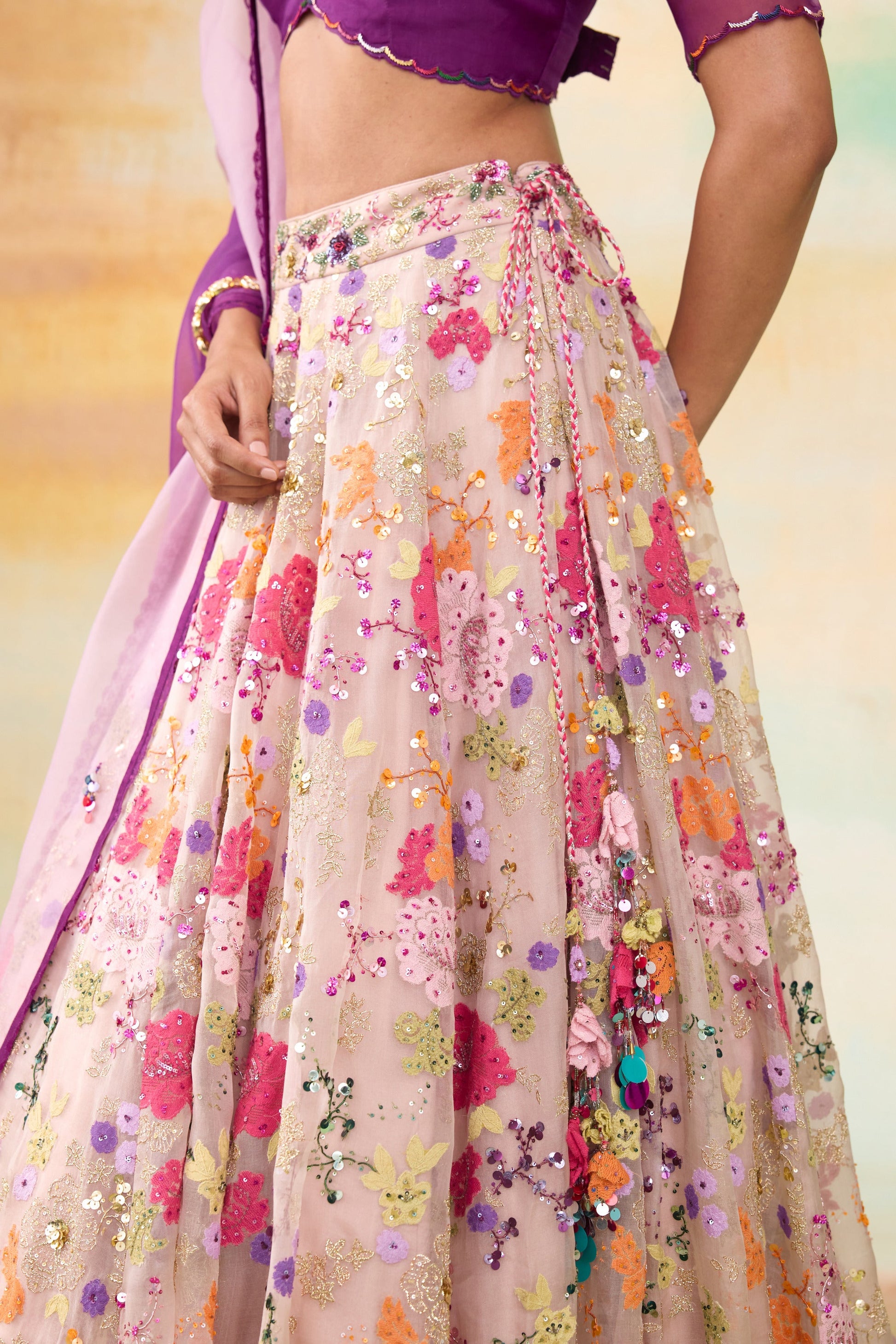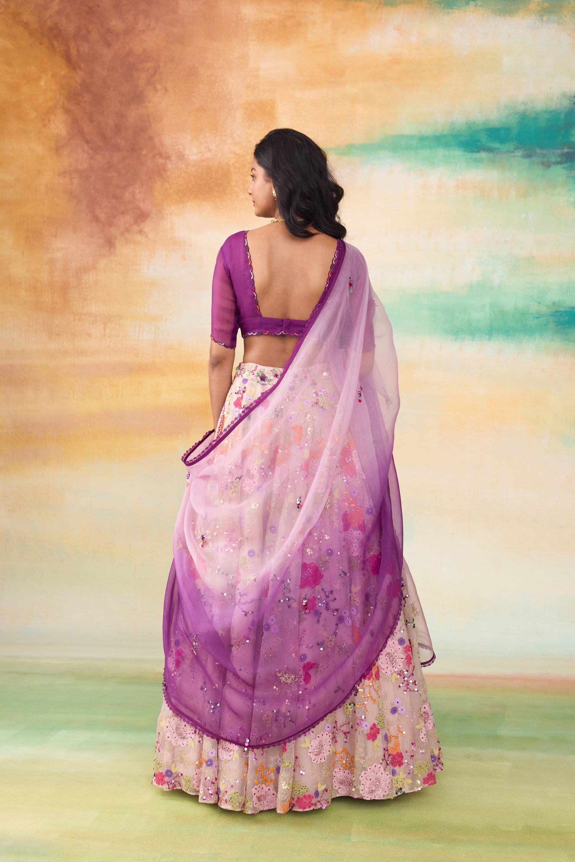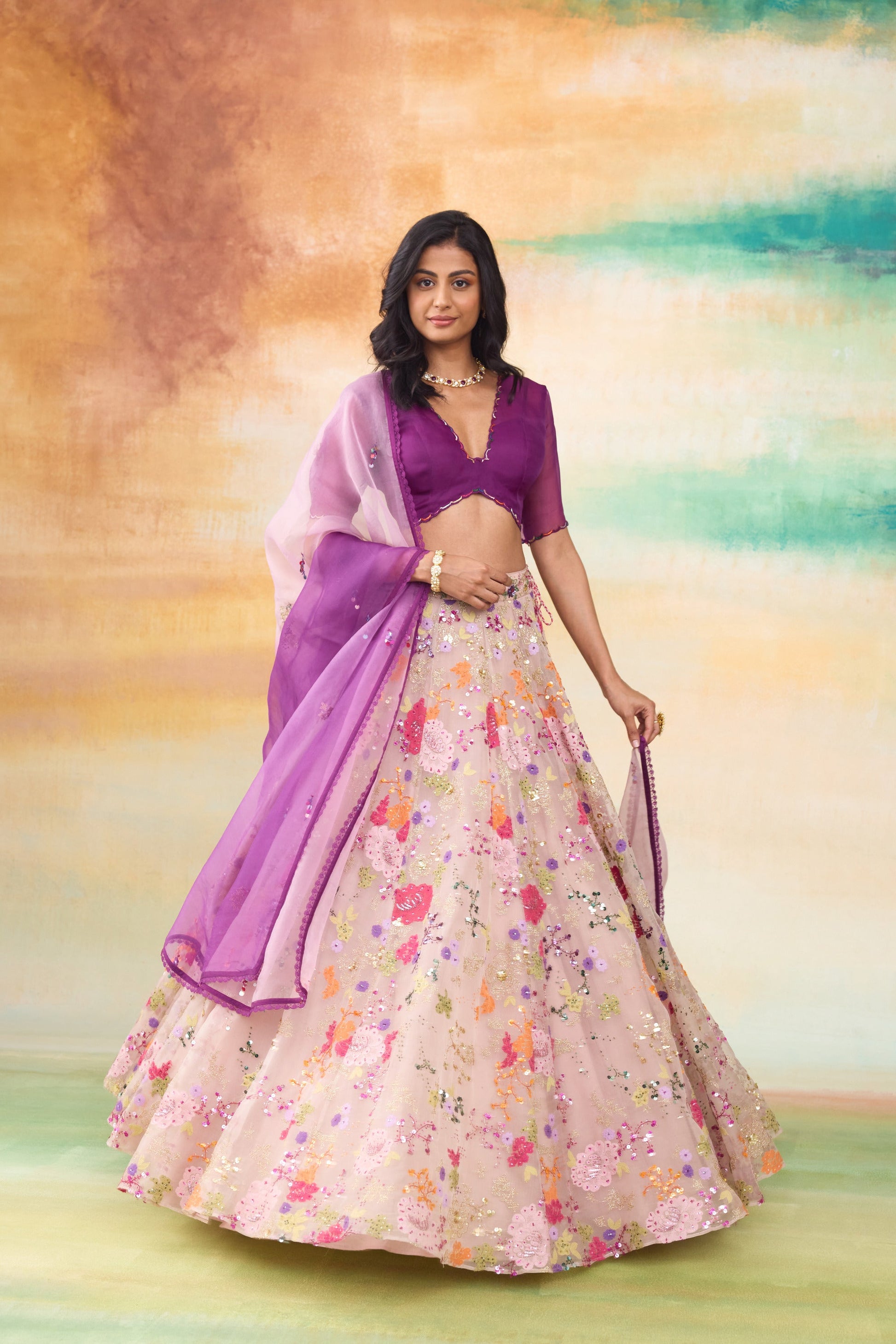 Our vibrant Rangeen lehenga ensemble is a stunning set features a lilac lehenga adorned with intricate colorful lace flower appliques, shimmering sequin details, and elegant zari flower embroidery. Complementing the lehenga is a purple organza blouse, perfectly paired with a dreamy obre organza dupatta that transitions gracefully in hues.