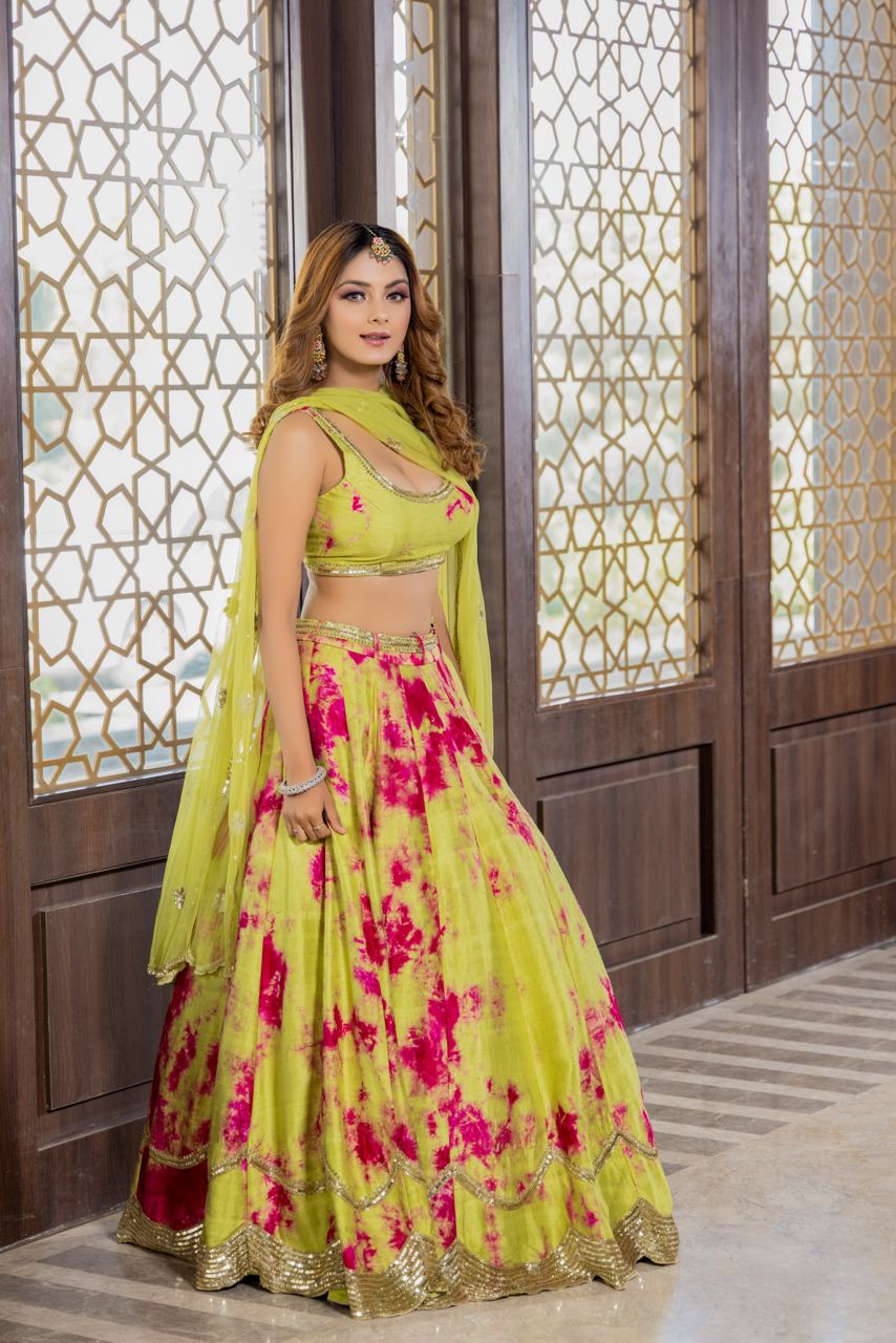 Rani -green tie and dye hand embroidered lehenga set