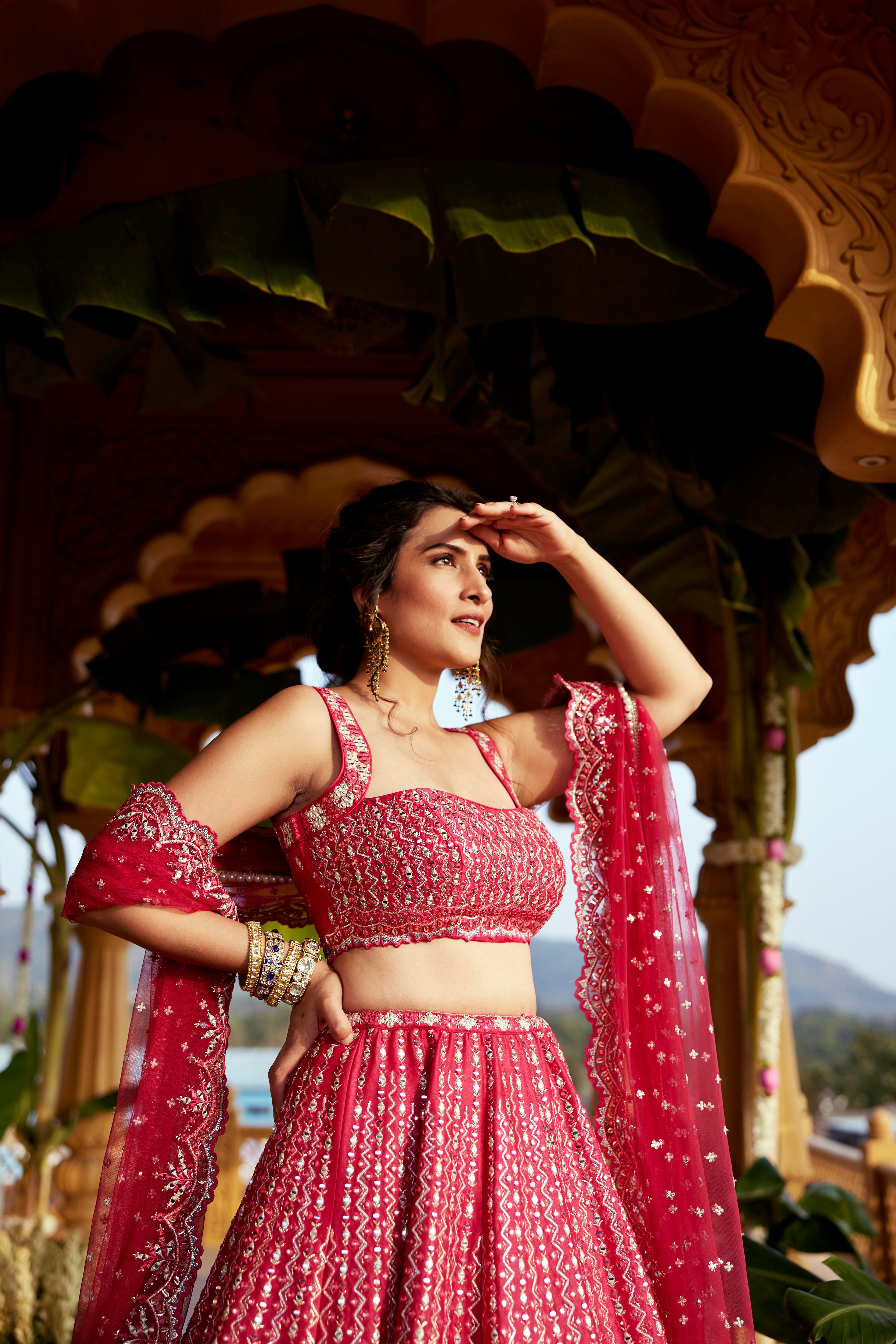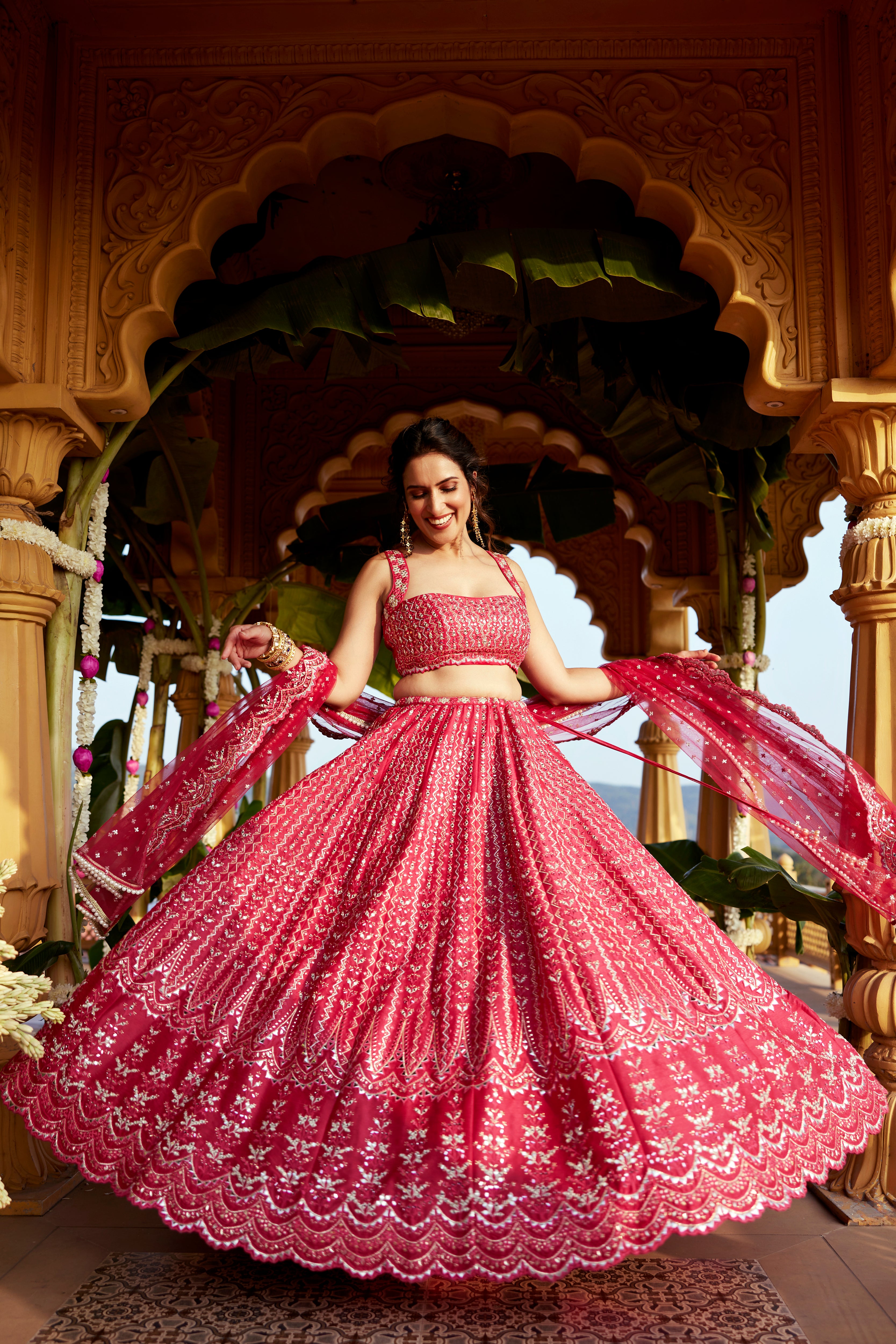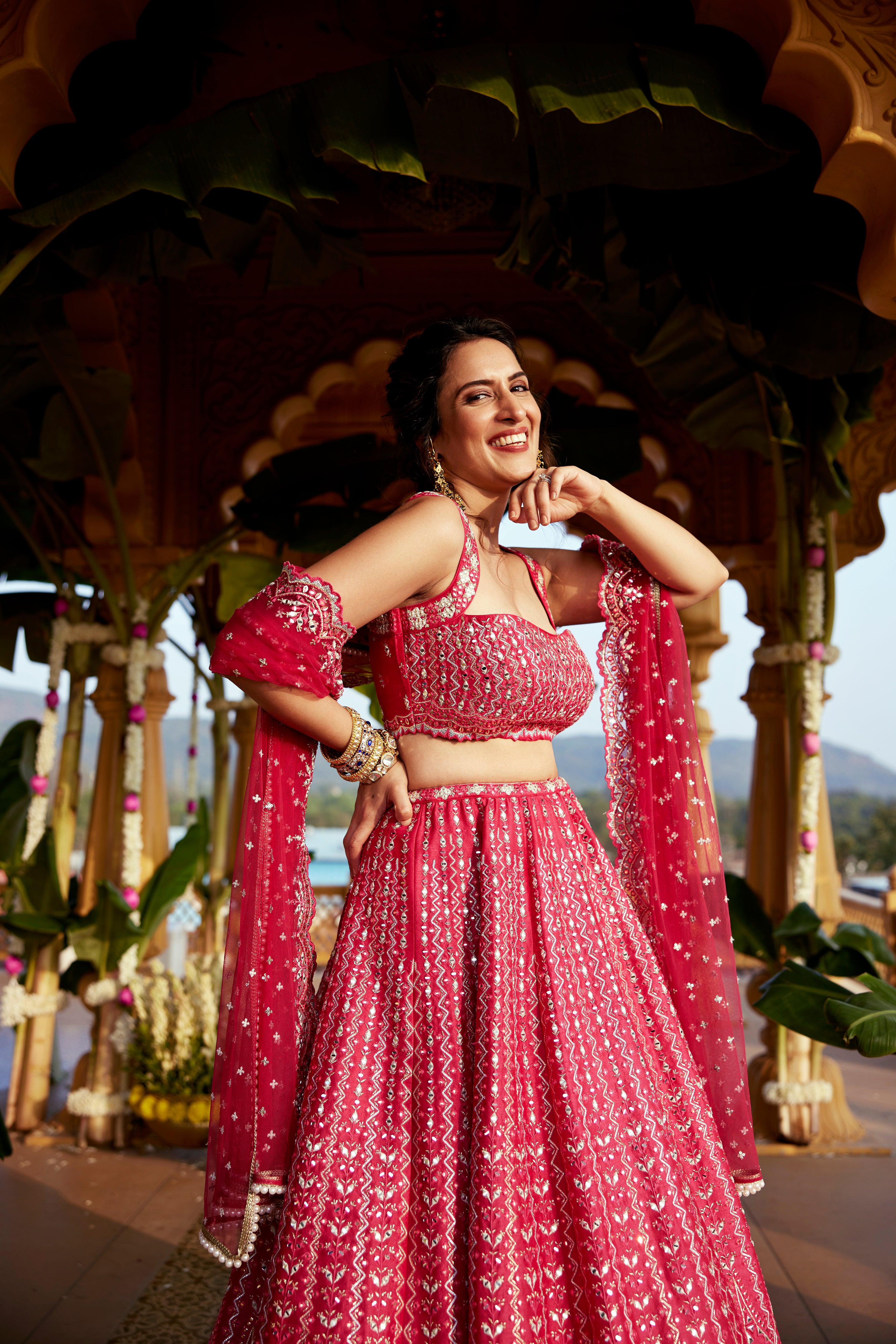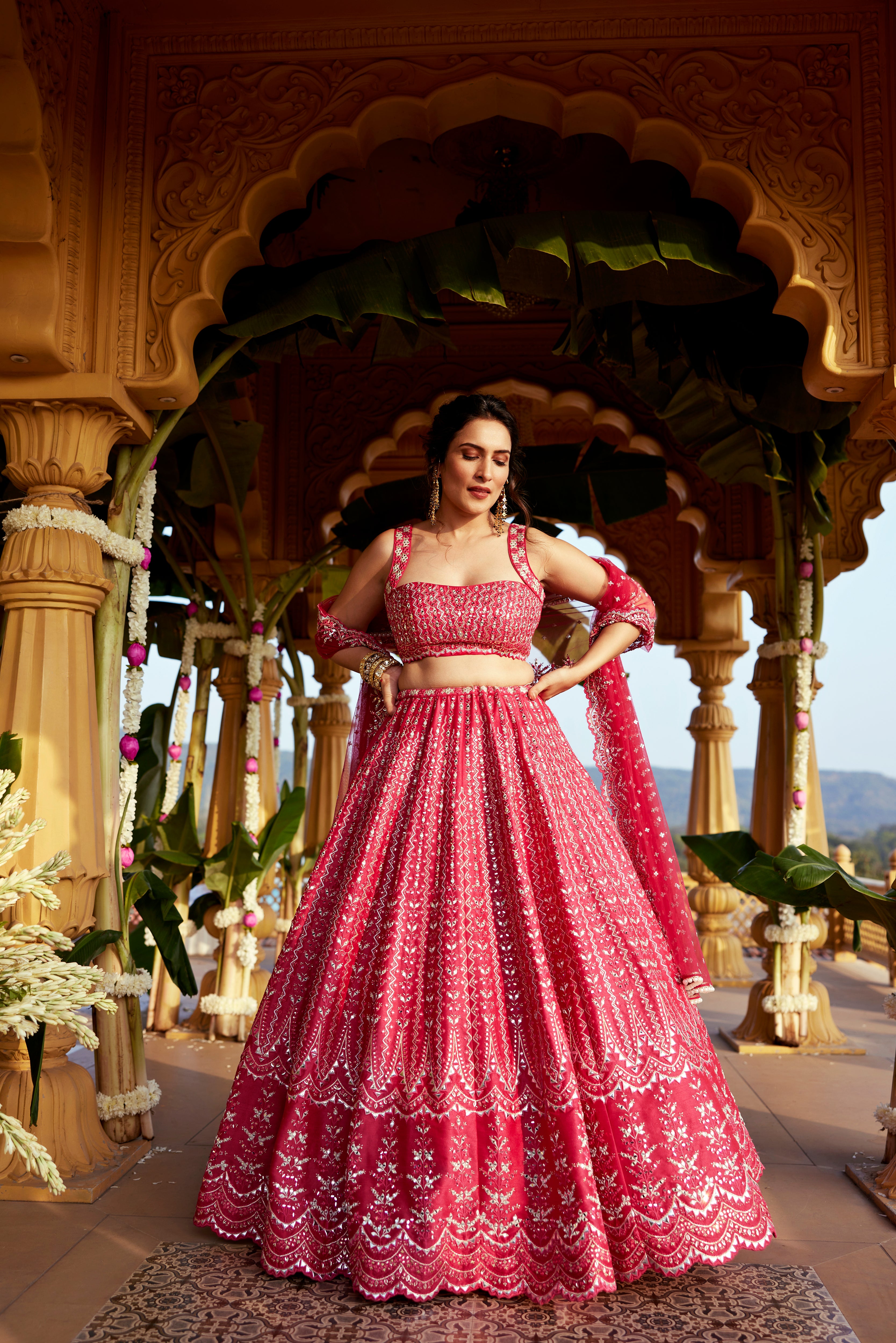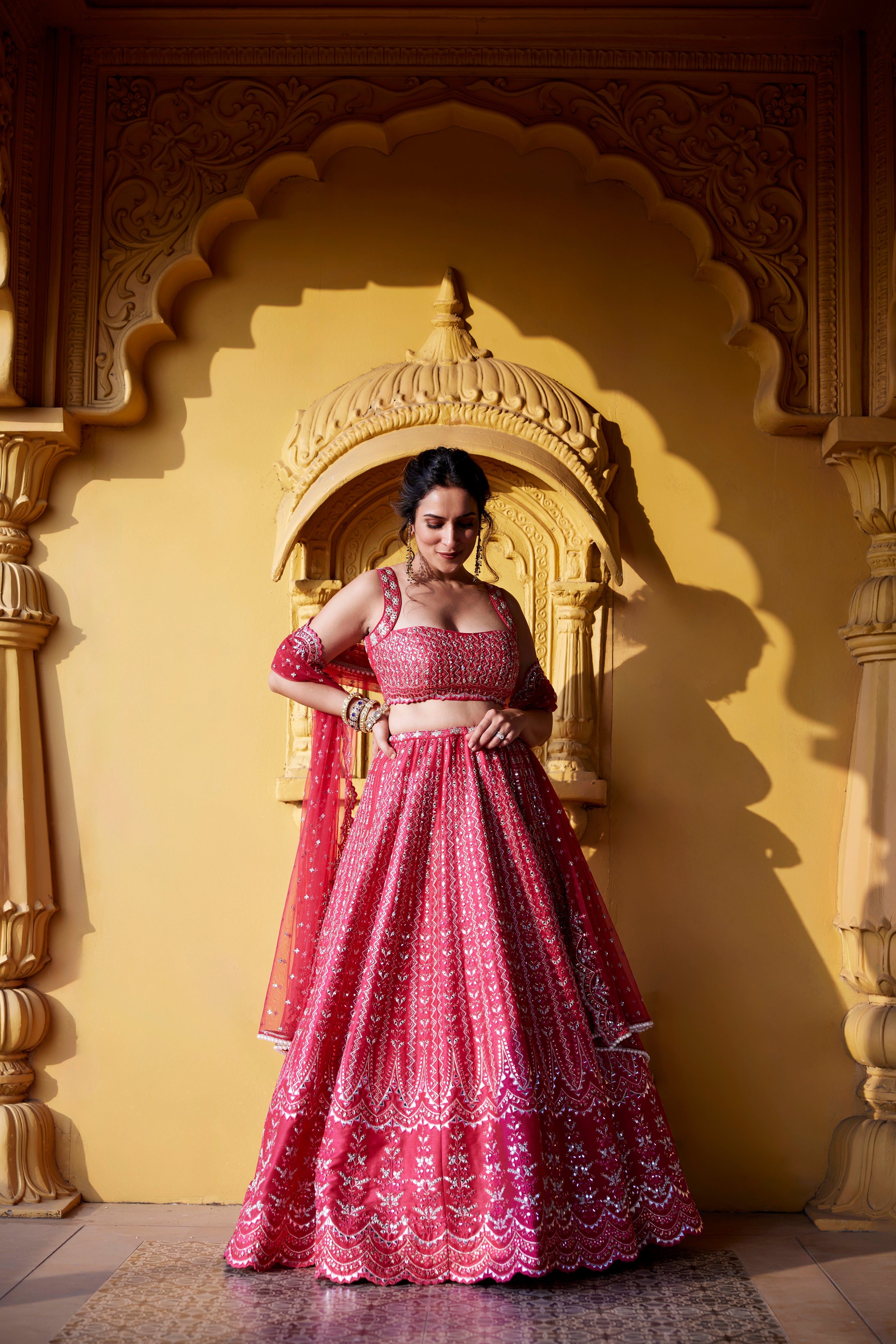Rani pink geometric work scalloped edged lehenga with mirror, leather, resham embroidery paired with embroidered blouse and tulle scallop dupatta.