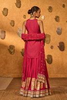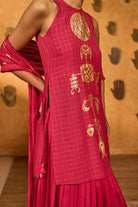 Details: A vibrant raspberry zari checks short kurta, highlighted with a whimsical wishdrop foil print and side slits adorned with delicate dori and tassel details. Paired with a flowing skirt featuring a repeated moonfish print arranged in a captivating circular pattern, complete with a sleek zipper closure. The ensemble is finished with a raspberry heartbeat foil dupatta, tying together artistry and elegance.