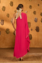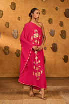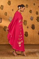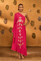 Details: A bold raspberry wishdrop kaftan, designed in a striking one-shoulder silhouette. The neckline and sleeve hem are framed with a foil-printed border, adding a touch of shimmer to its contemporary elegance.