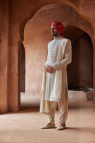Cream Raw Silk Sherwani Embroidered With Resham, Dabka And Beads In An Arabesque Pattern With A Monga Tussar Kurta And Churidar.