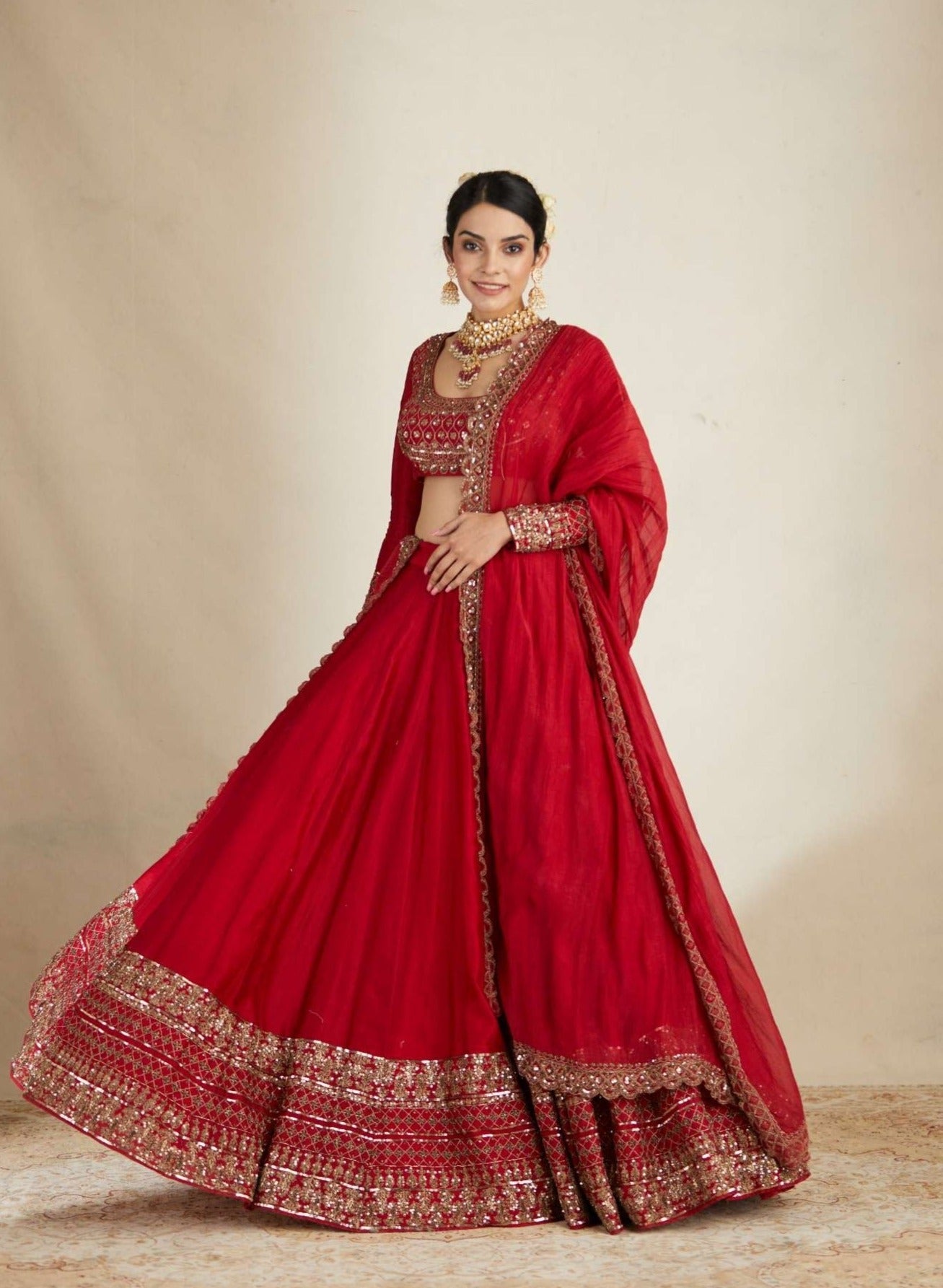 Featuring a Red Chanderi Silk & Crepe Embroidered Lehenga Set in Chanderi.