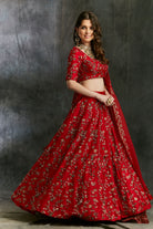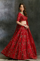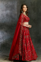 Featuring a RED FLORAL JAAL ZARI LEHENGA IN RAW SILK.