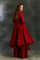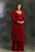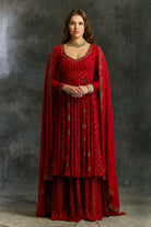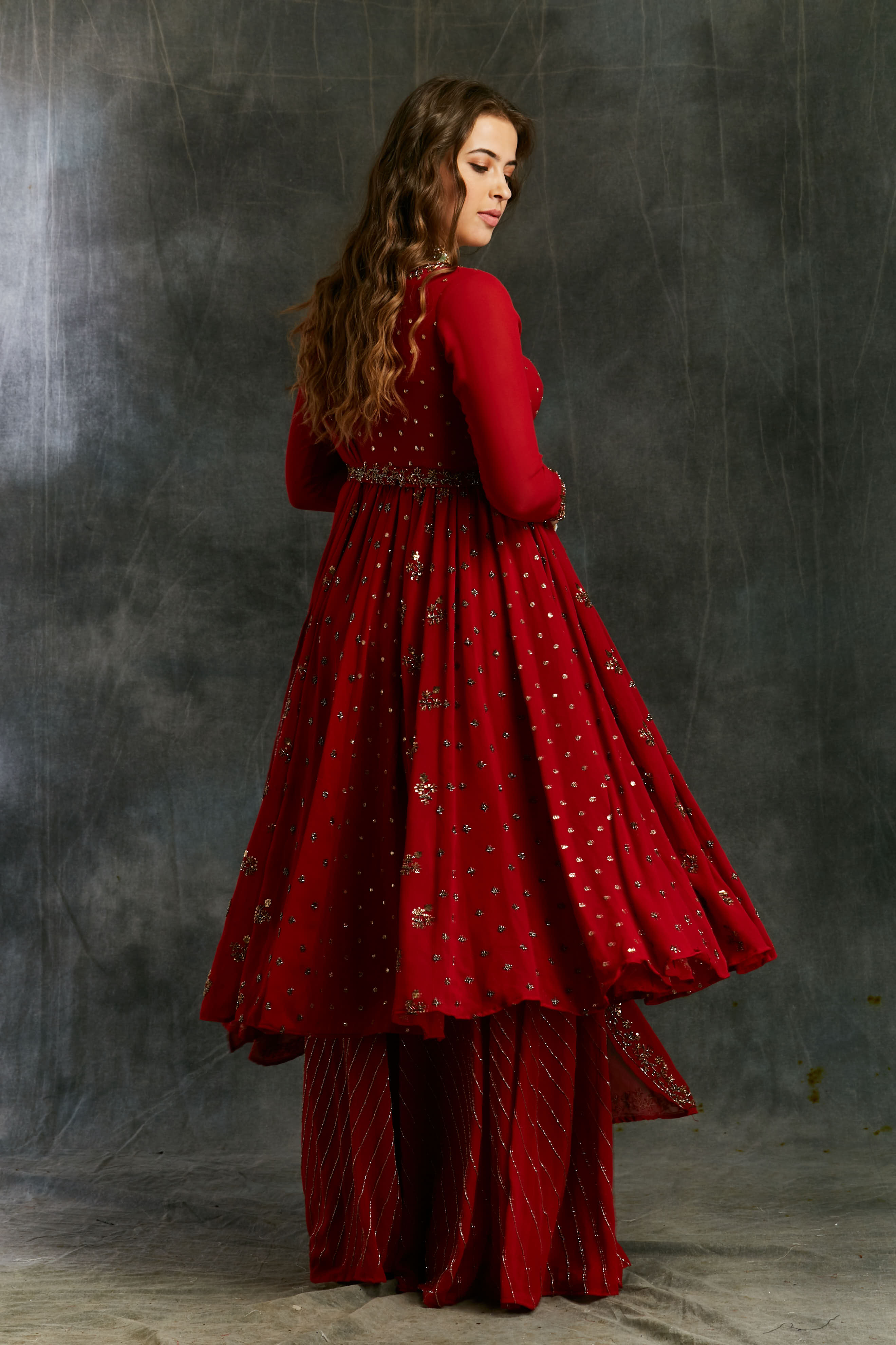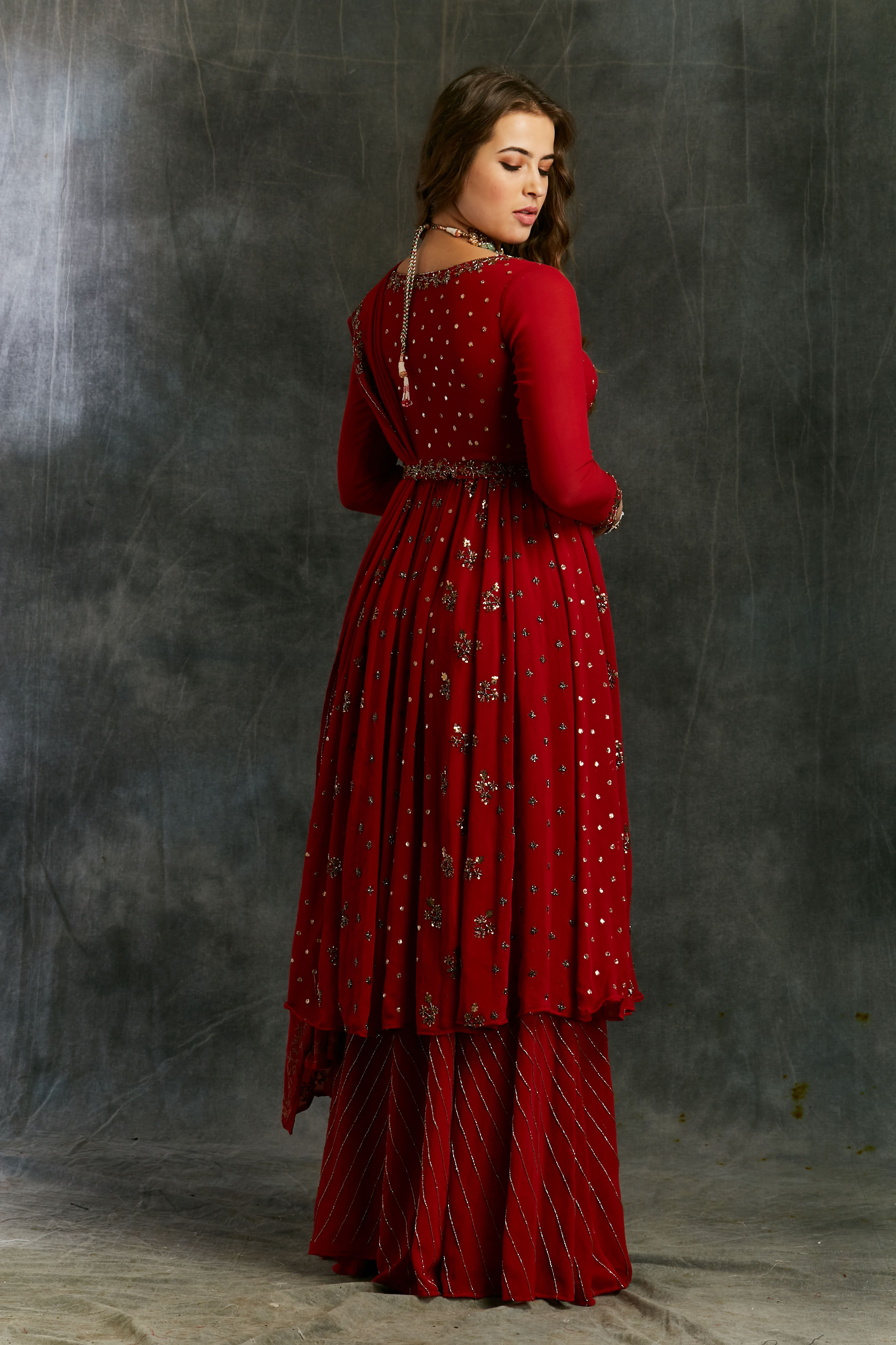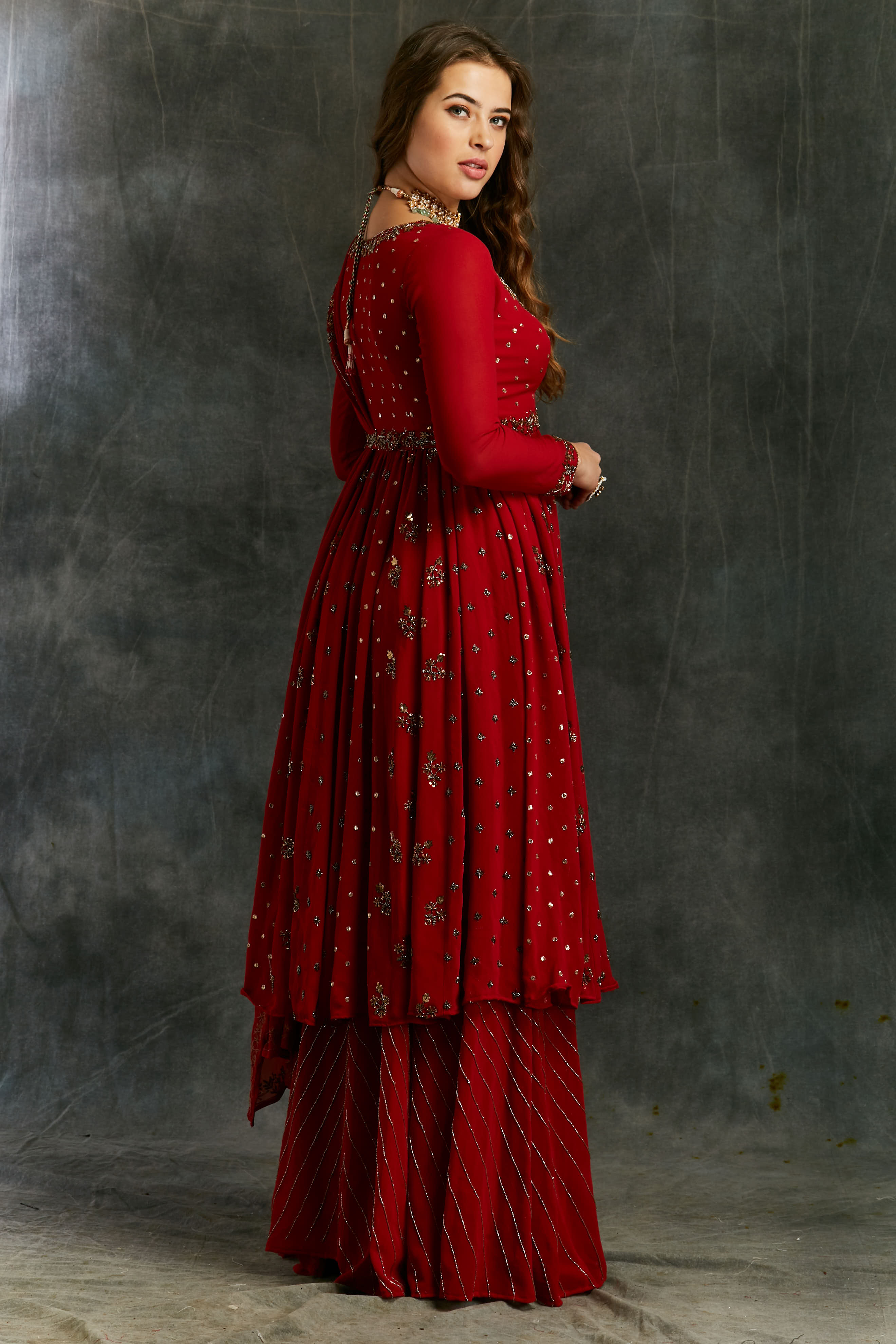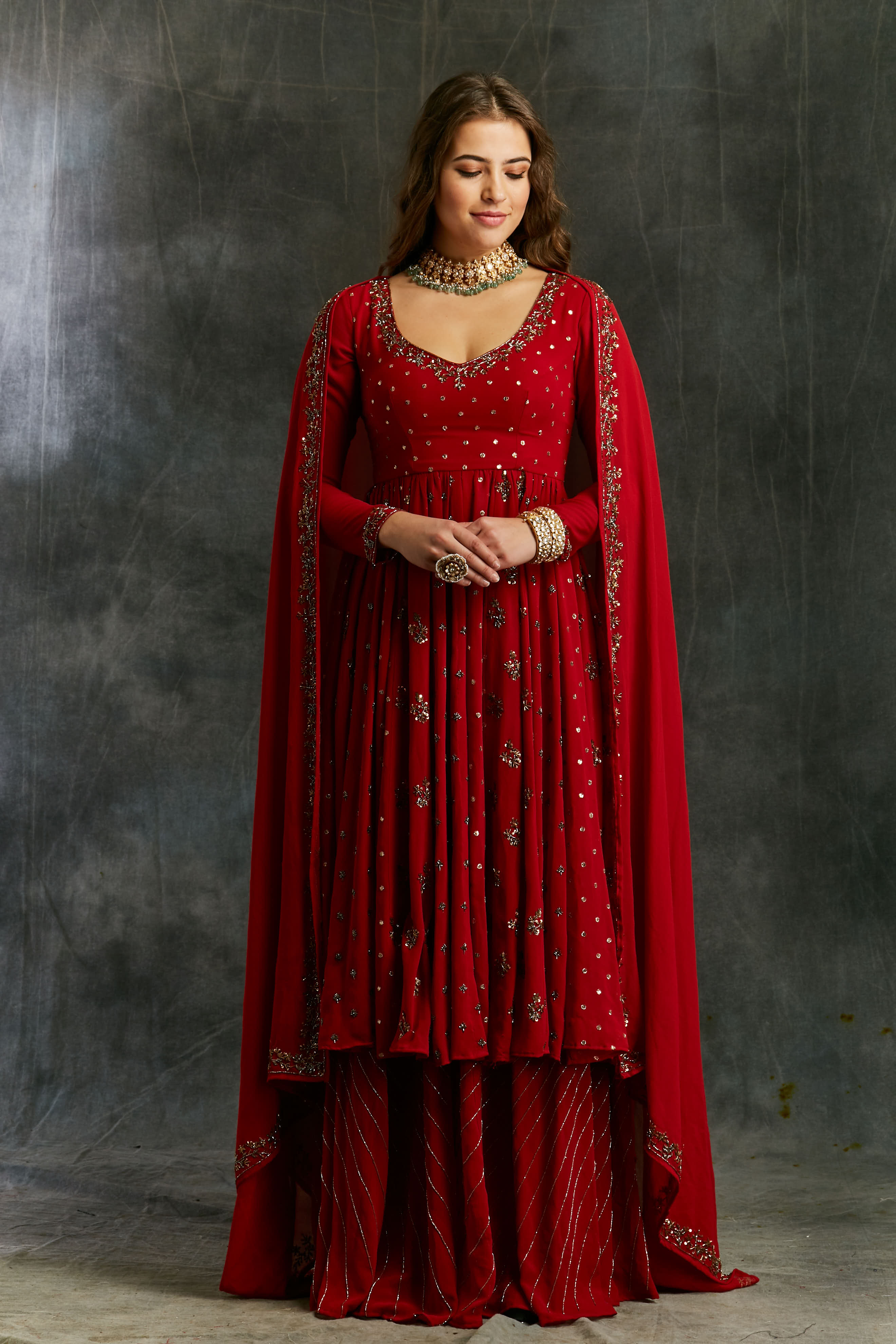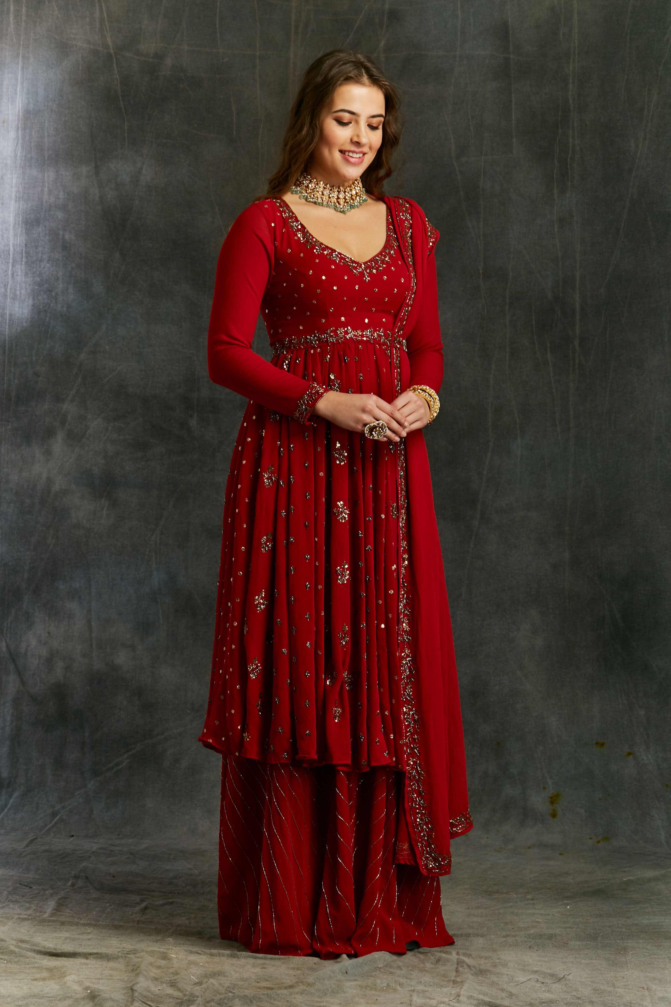 Featuring a RED GEORGETTE ANARKALI WITH SHARARA IN GEORJETTE.