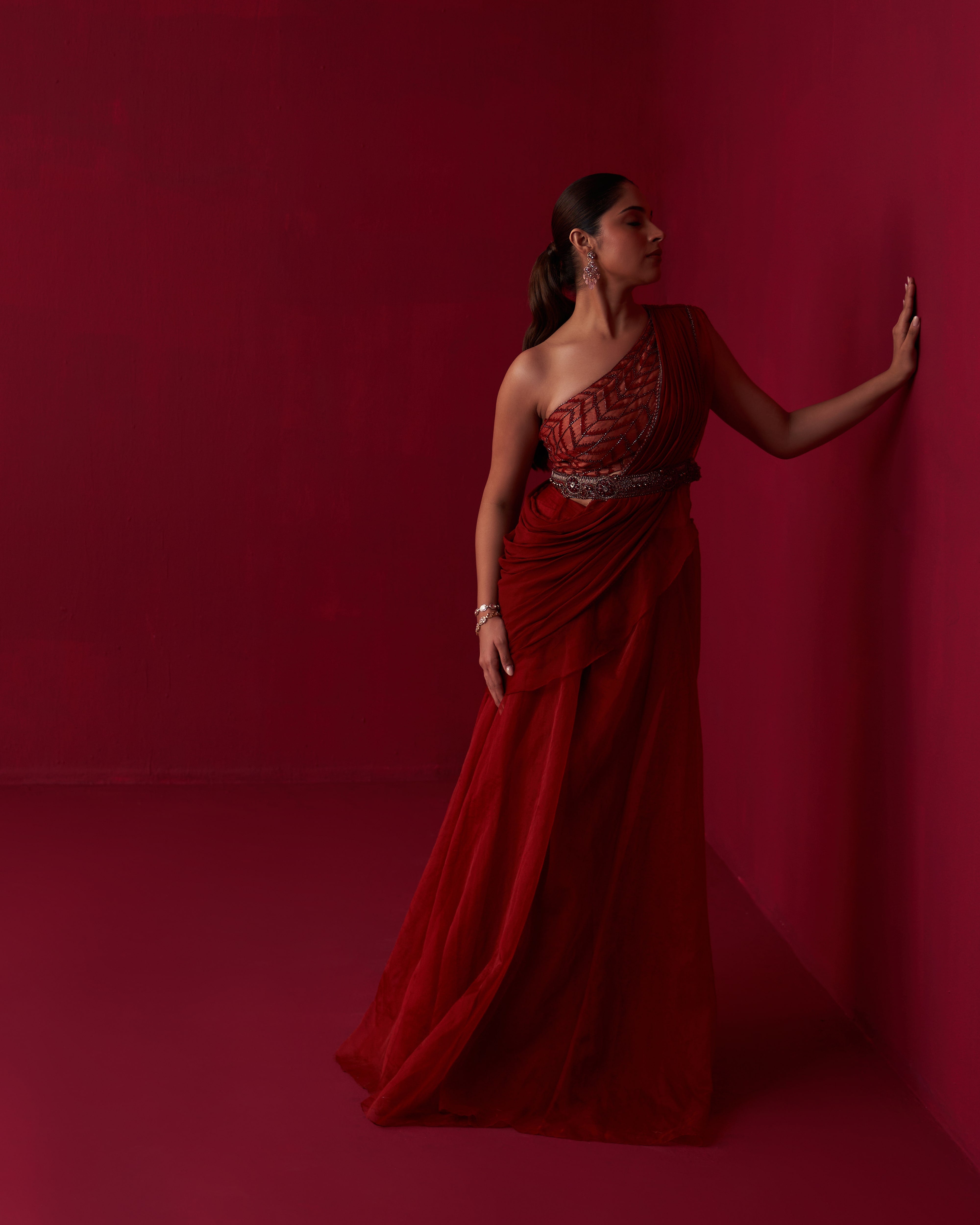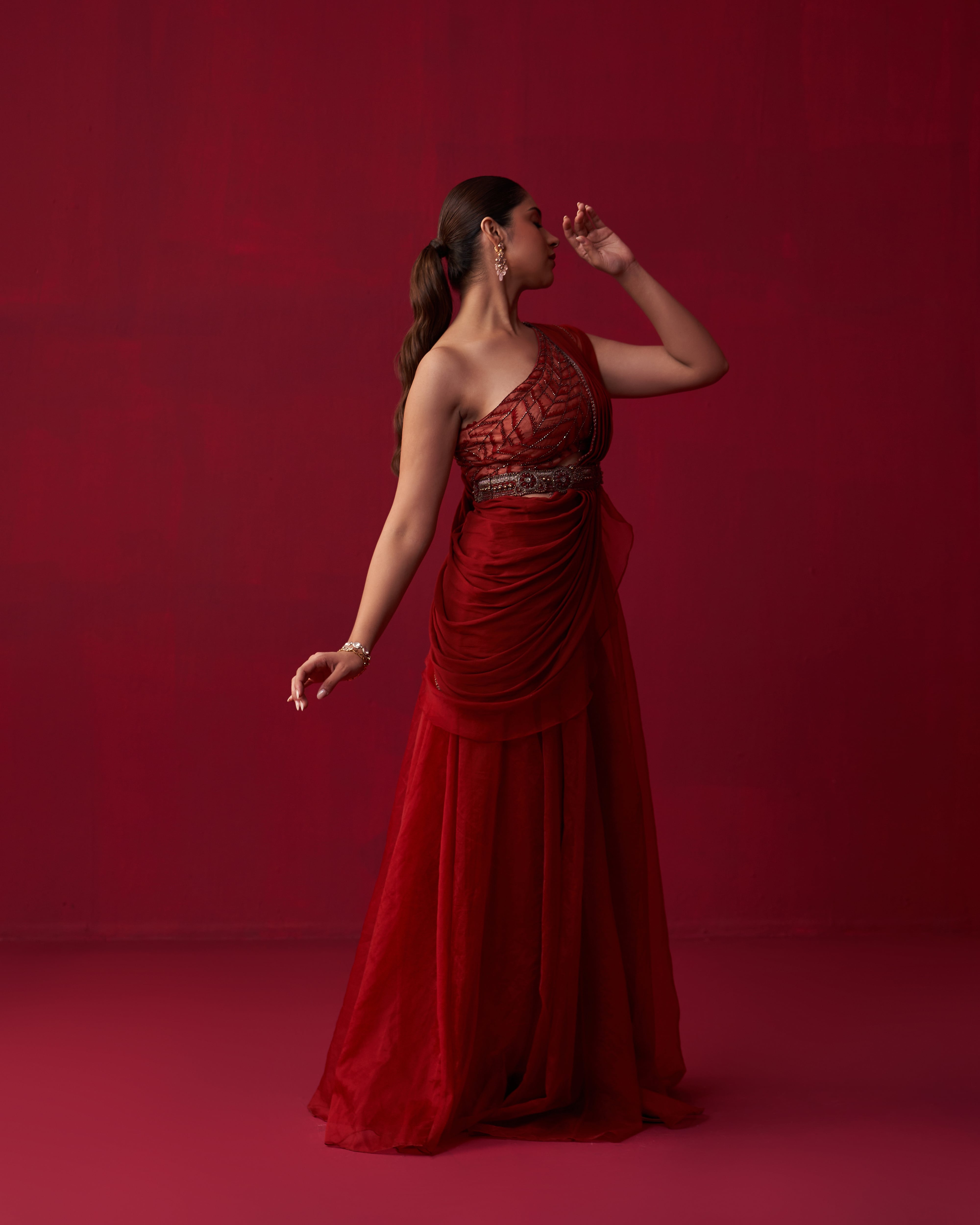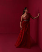 Red georgette draped top with alluring embroidery. Comes with cutdana work belt and organza palazzo