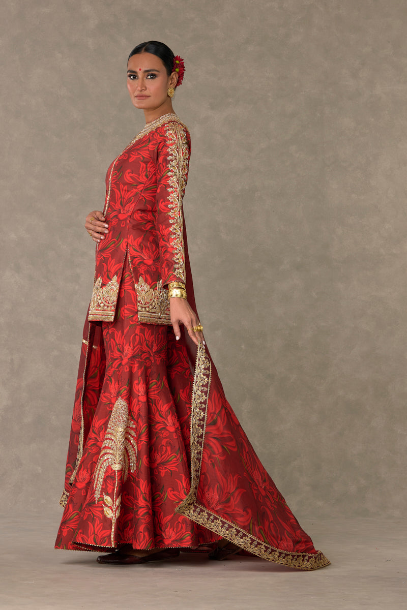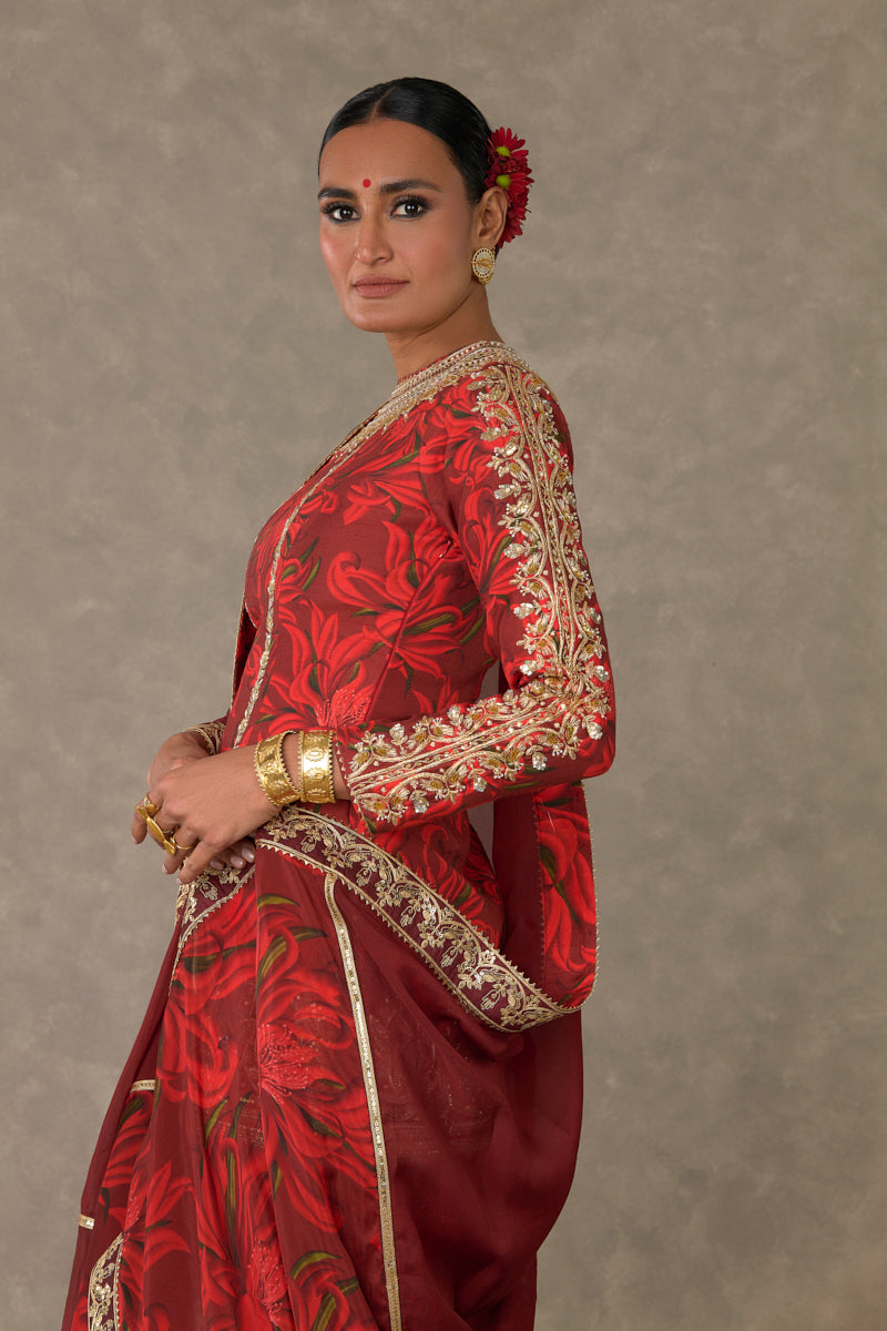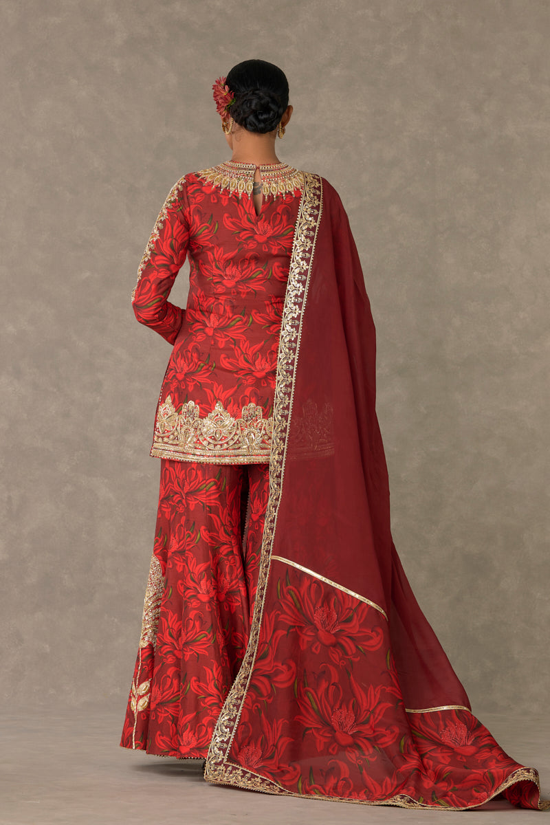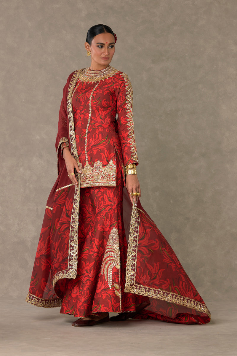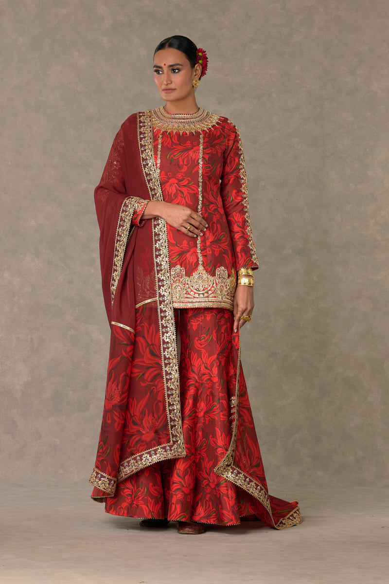 Pair this beautiful Kurta set with a pair of statement earrings, bangles and mojris. Layer it with a beautiful digital printed patchwork organza dupatta and accessories it with a potli bag for the wedding festivities