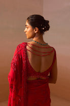 Blood Georgette Saree With Tonal Sequins Beads And Cutdana Work Geometric Jaal With a Stylish Sleeveless Jaal Blouse.
