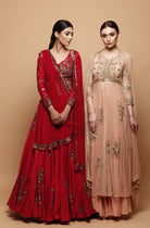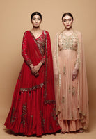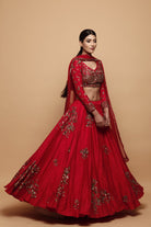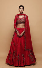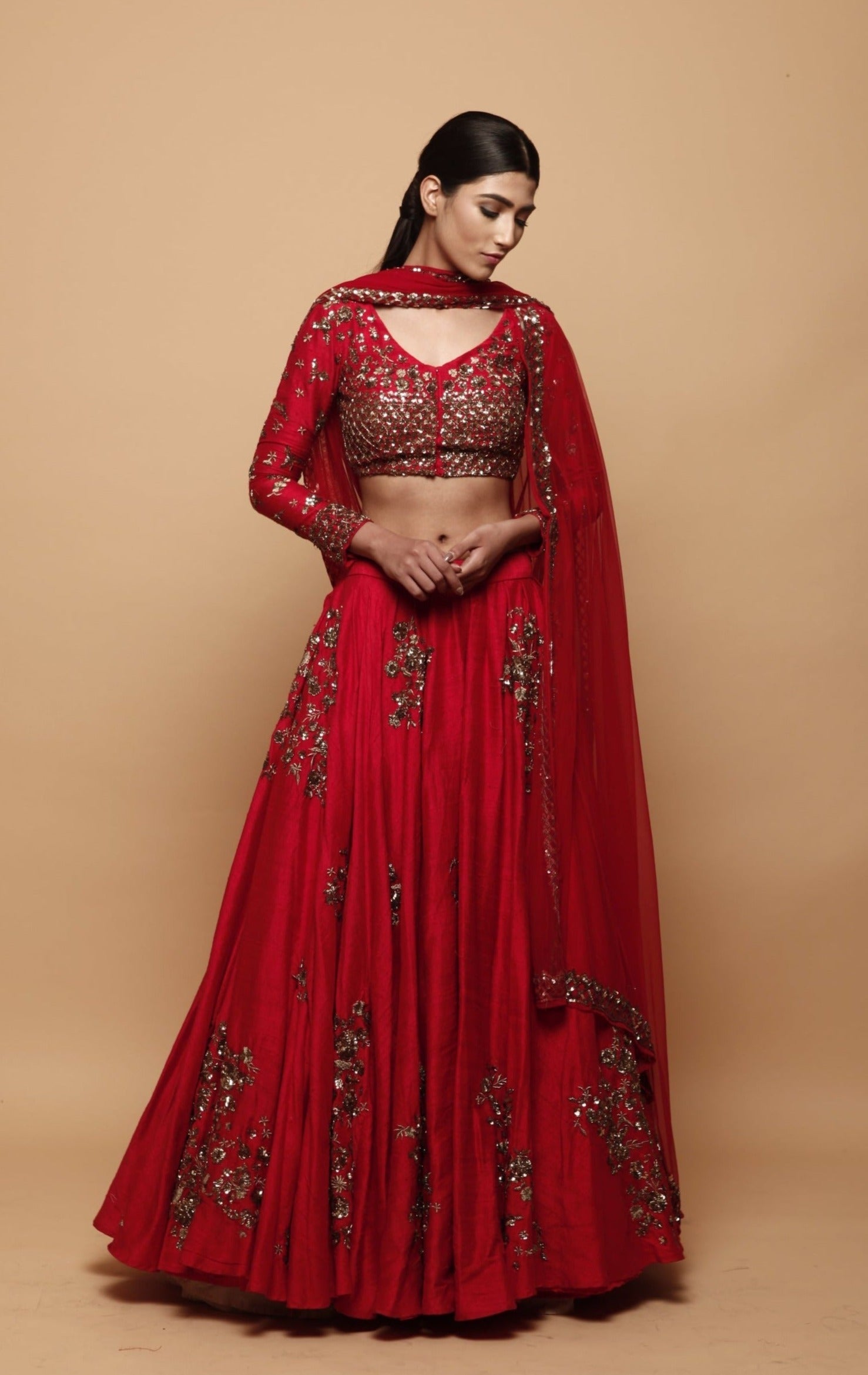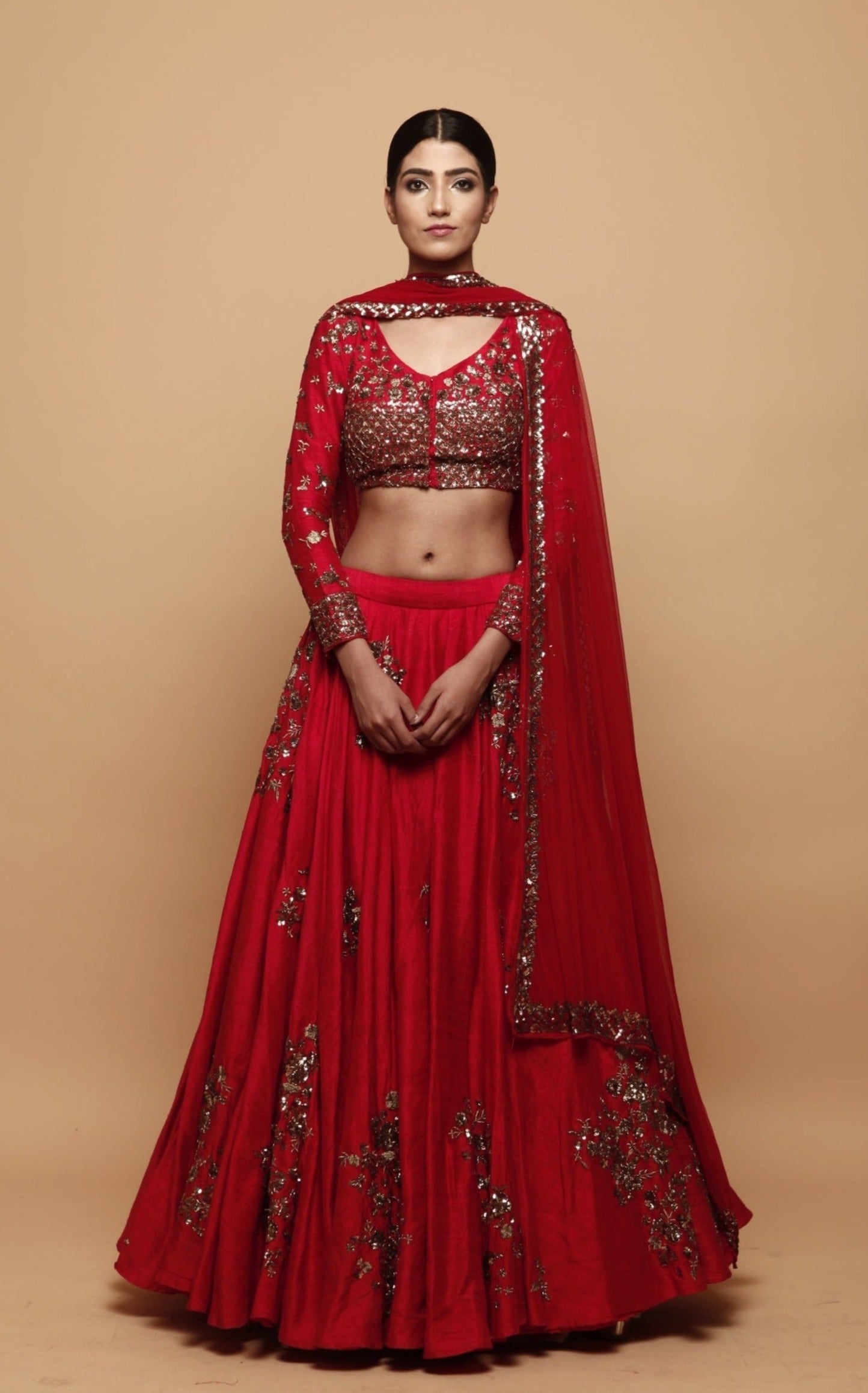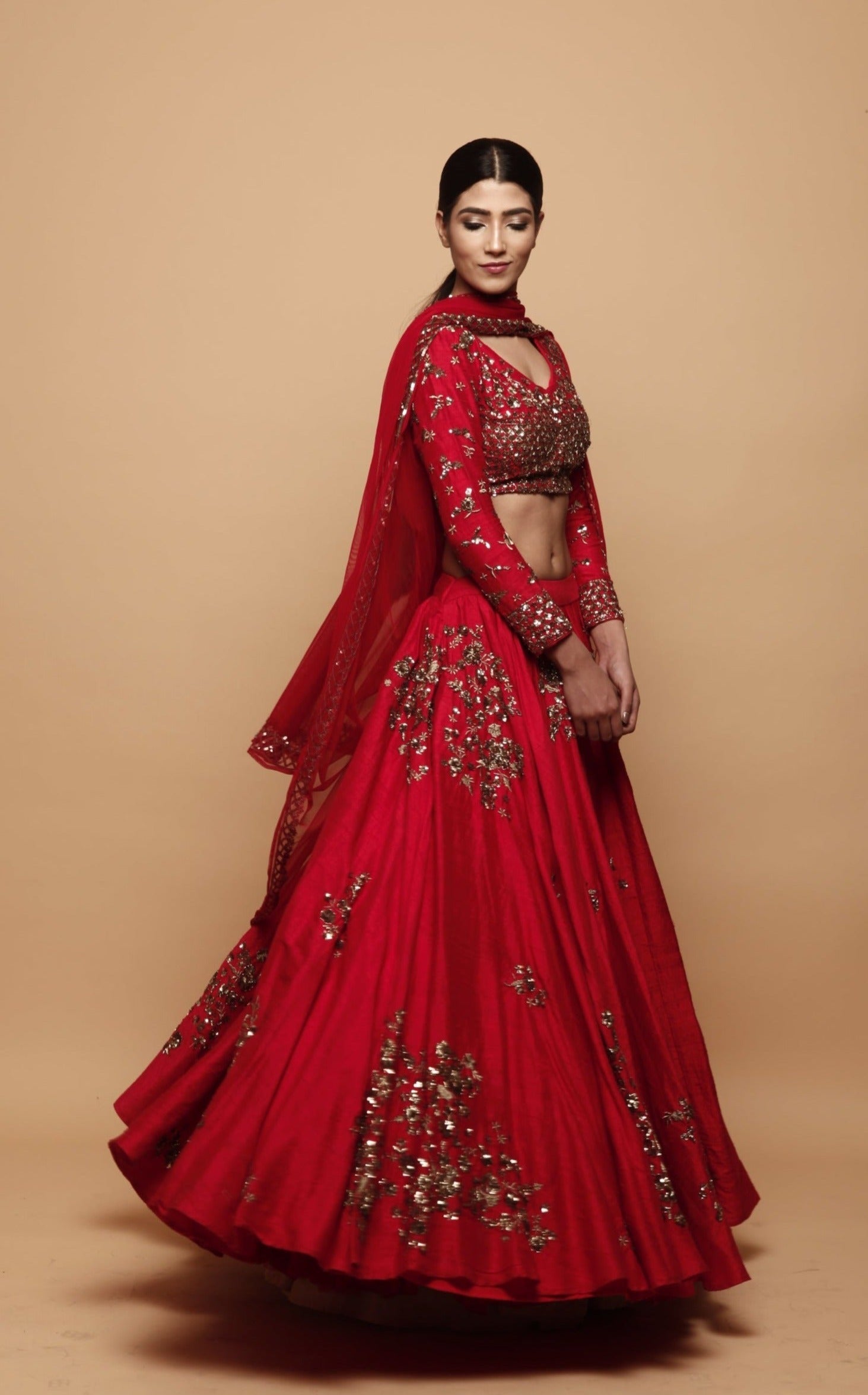 Featuring a RED LEHENGA WITH GOLD FLORAL WORK IN RAW SILK.