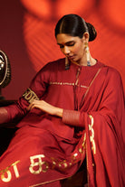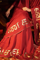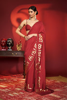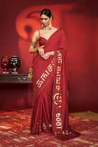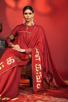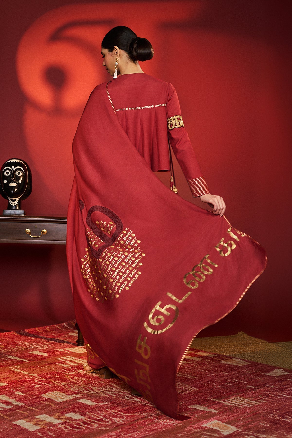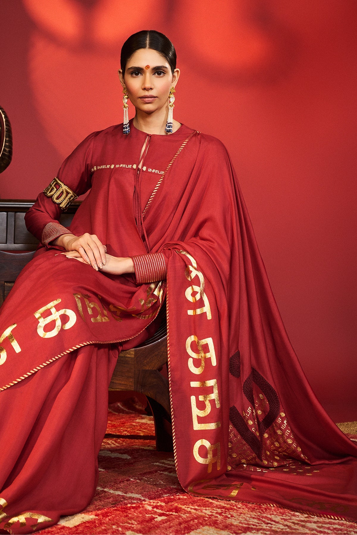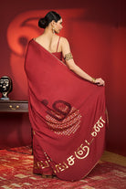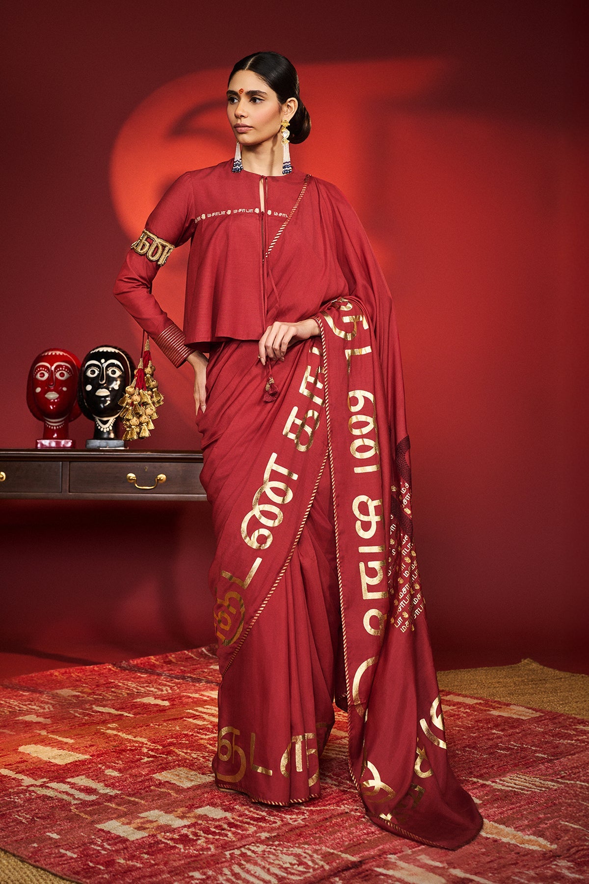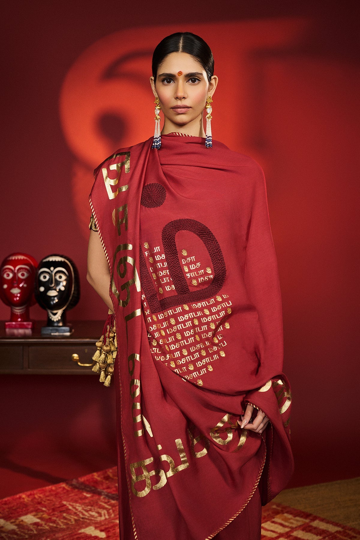 Saree with blouse piece- Red Madras Muse is a statement saree crafted in luxurious mul silk, adorned with opulent gold foil print and hand-embroidered detailing. A bold red Tamil letter commands attention on the palla, while Masaba and Palm motif repeat elegantly in a circular emblem. Foiled Tamil script lines the border like poetry in motion, finished with sharp pinstripes piping and a coordinated mul silk blouse. An ode to heritage, reimagined with contemporary elegance.