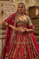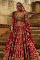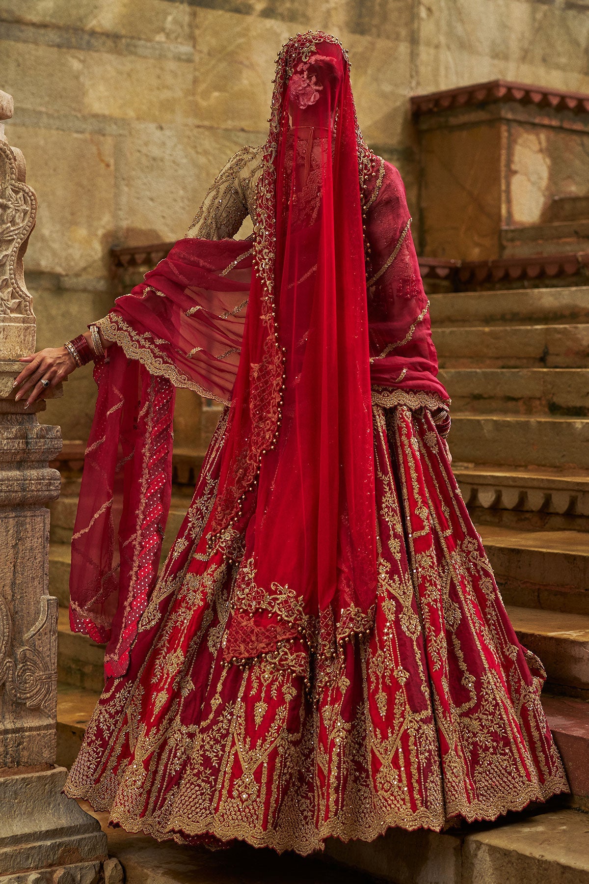 Red-Maroon lehenga set intricately embellished with zari, zardozi, dabka, kundan stones, and beadwork, creating a rich and regal look. Paired with an optional second dupatta for a more elaborate ensemble.