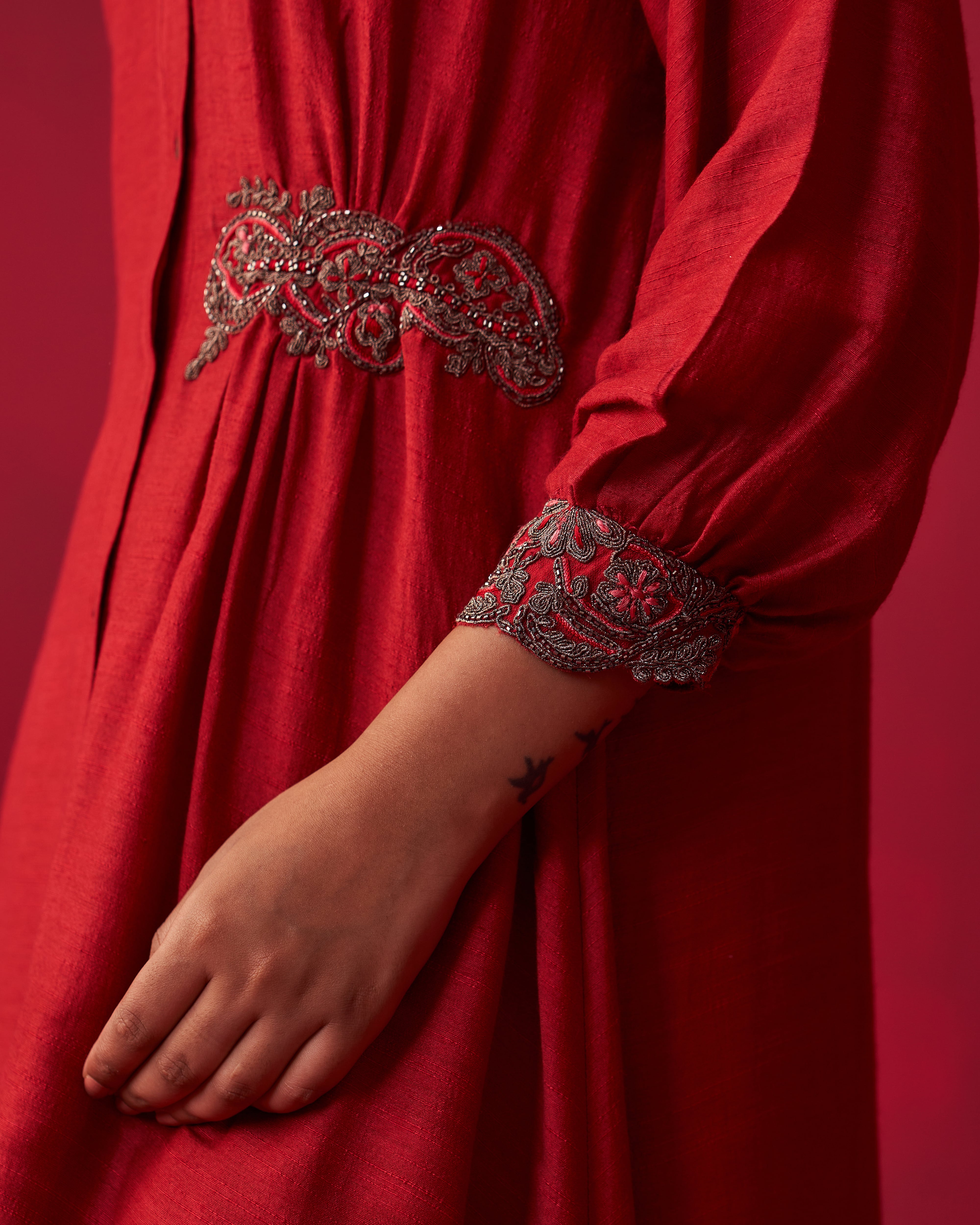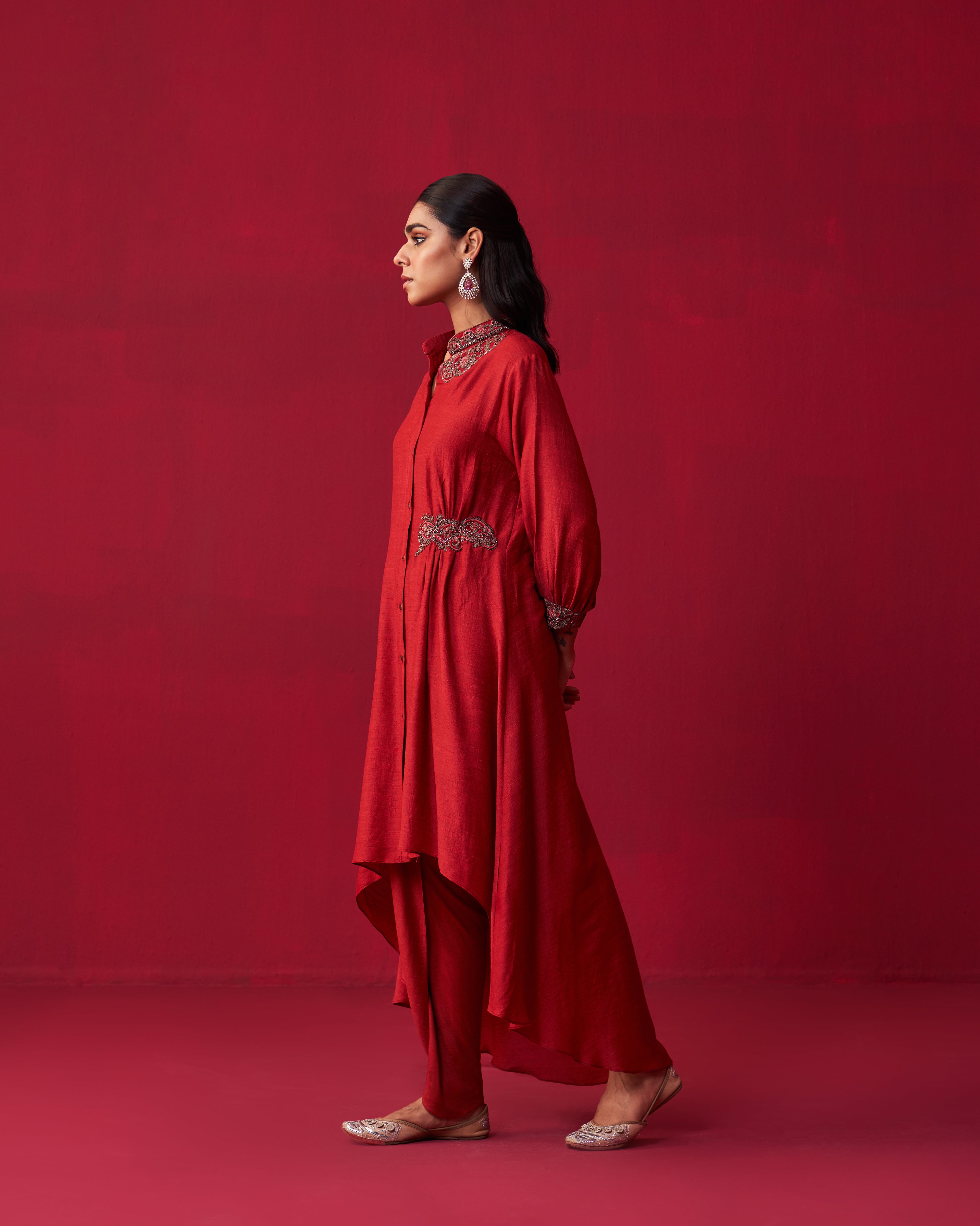 Red Metallic Bliss Shirt Style Tunic, and Dhoti Pants Set