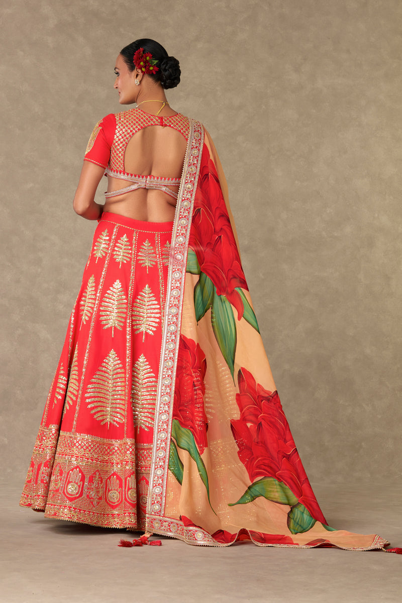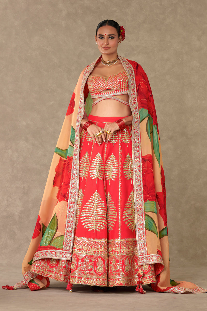 Pair the lehenga with contrasting emerald's and pearl's along with comfortable heels. Style it with our beautiful organza dupatta draped elegantly over one shoulder for a timeless and classic look