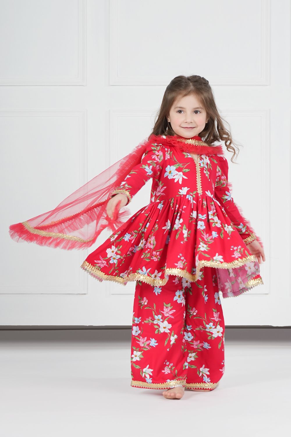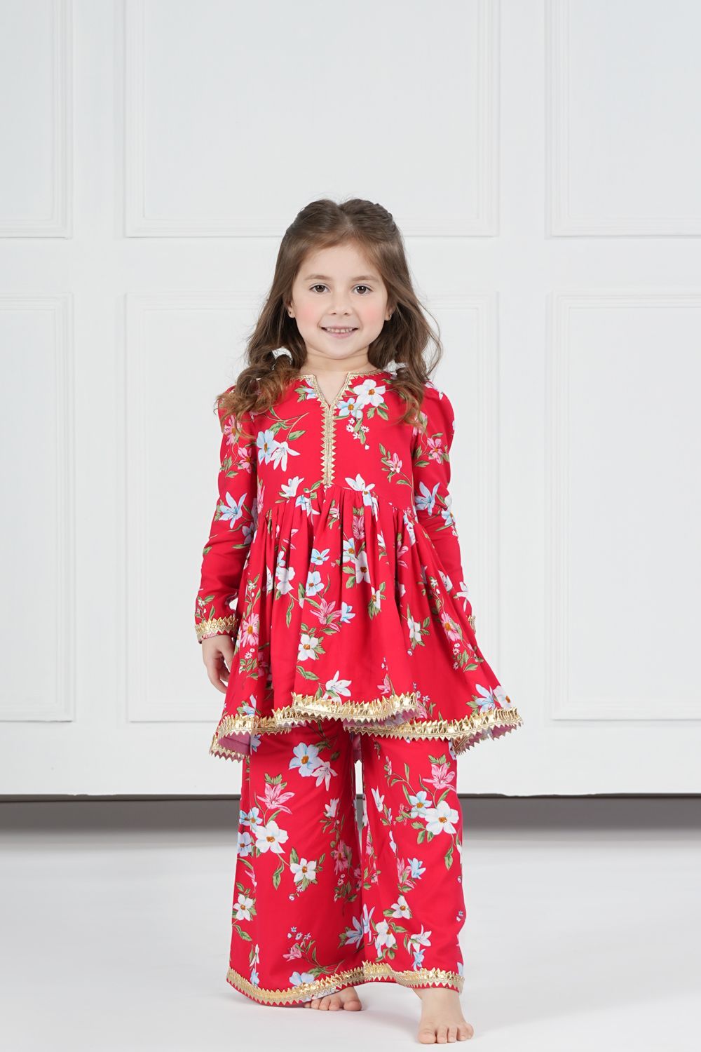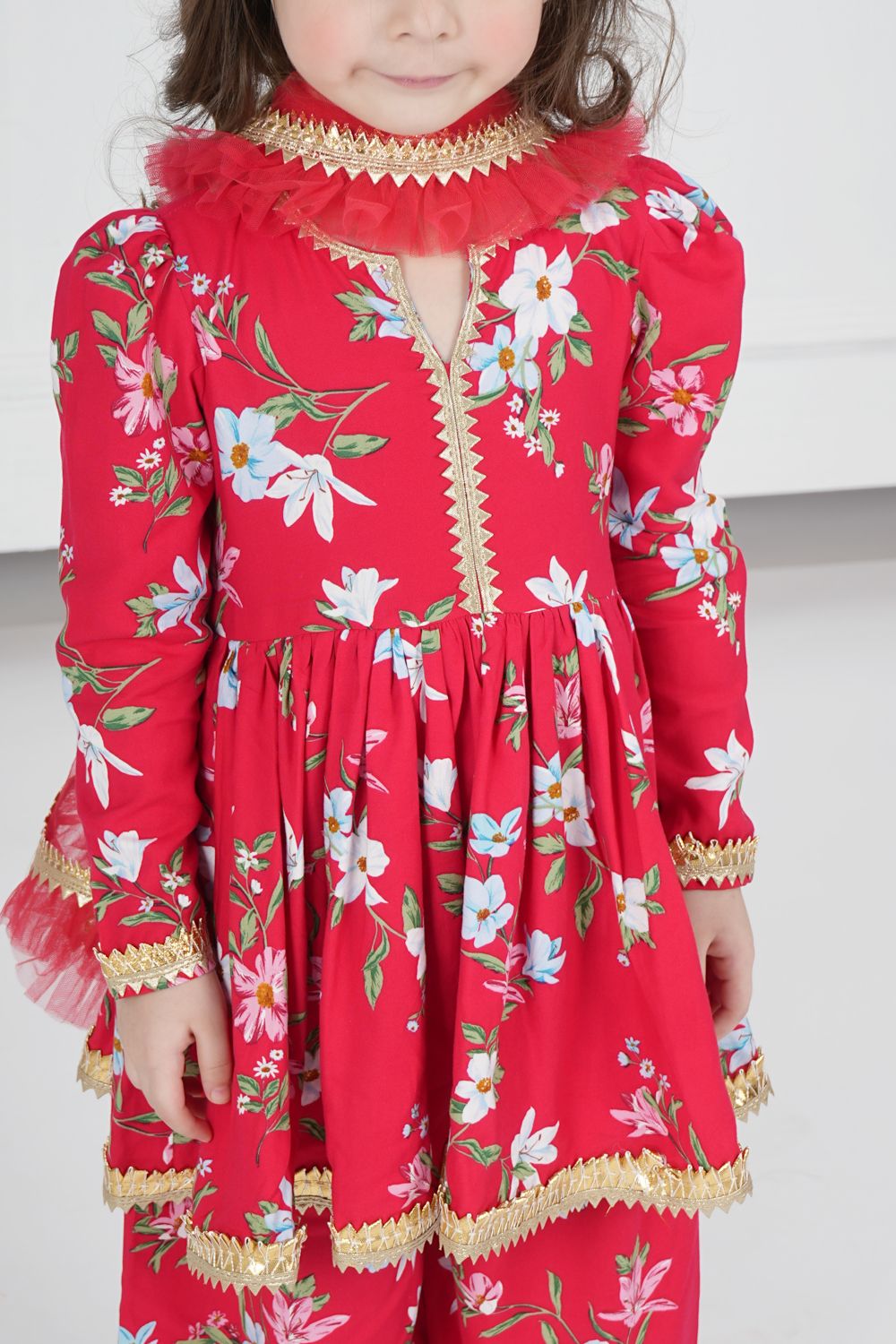 - RED FLORAL PATTERN EMBELLISHED WITH GOLDEN GOTA
