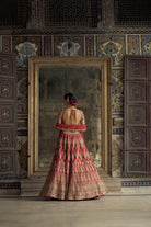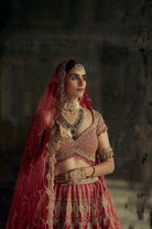 Red raw silk lehenga choli with tissue applique and doriwork , highlighted with dabka beads, crystals and sequins. It has a heavy all over embroidered net dupatta and an optional worked belt that can be ordered separately.