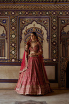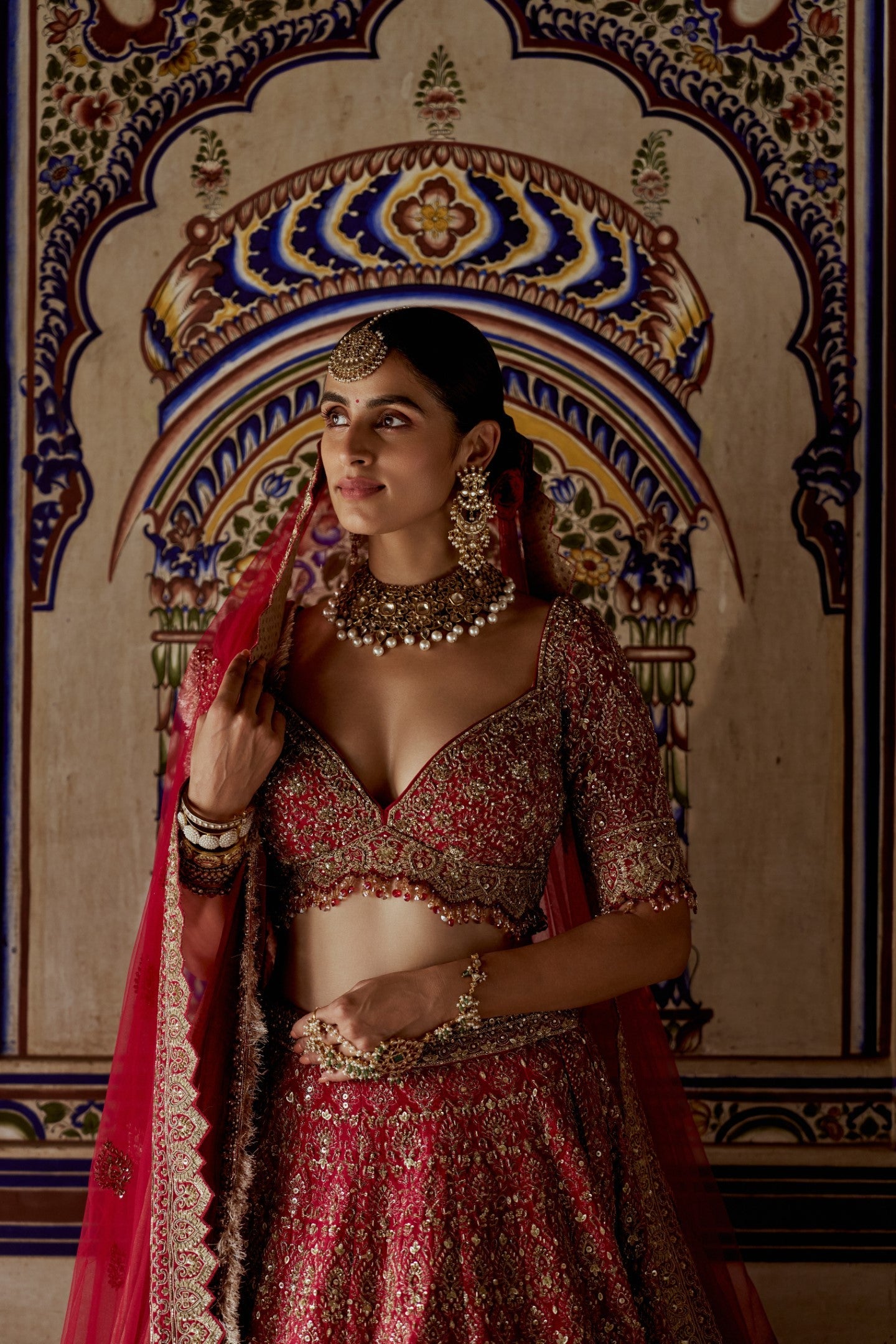 Red raw silk lehenga choli with net dupatta embroidered in an all over pattern in kasab highlighted with dabka, beads, sequins and crystals. It comes with an optional second tissue dupatta which can be ordered separately.