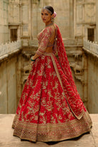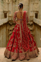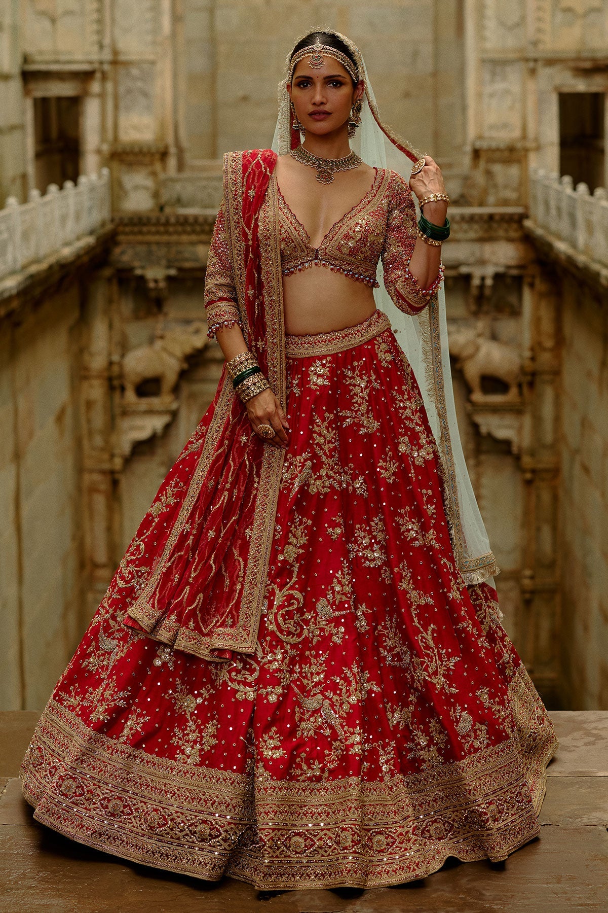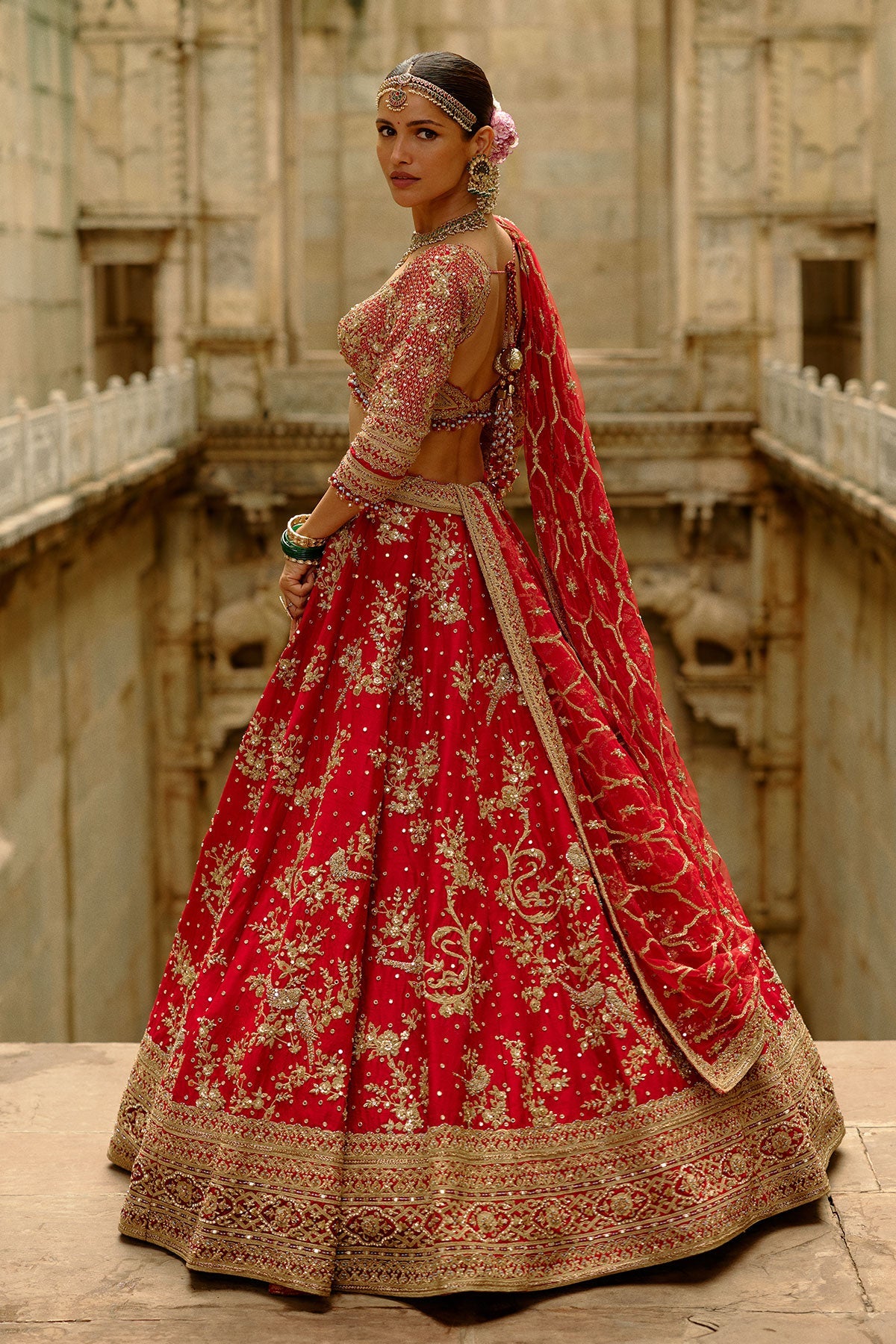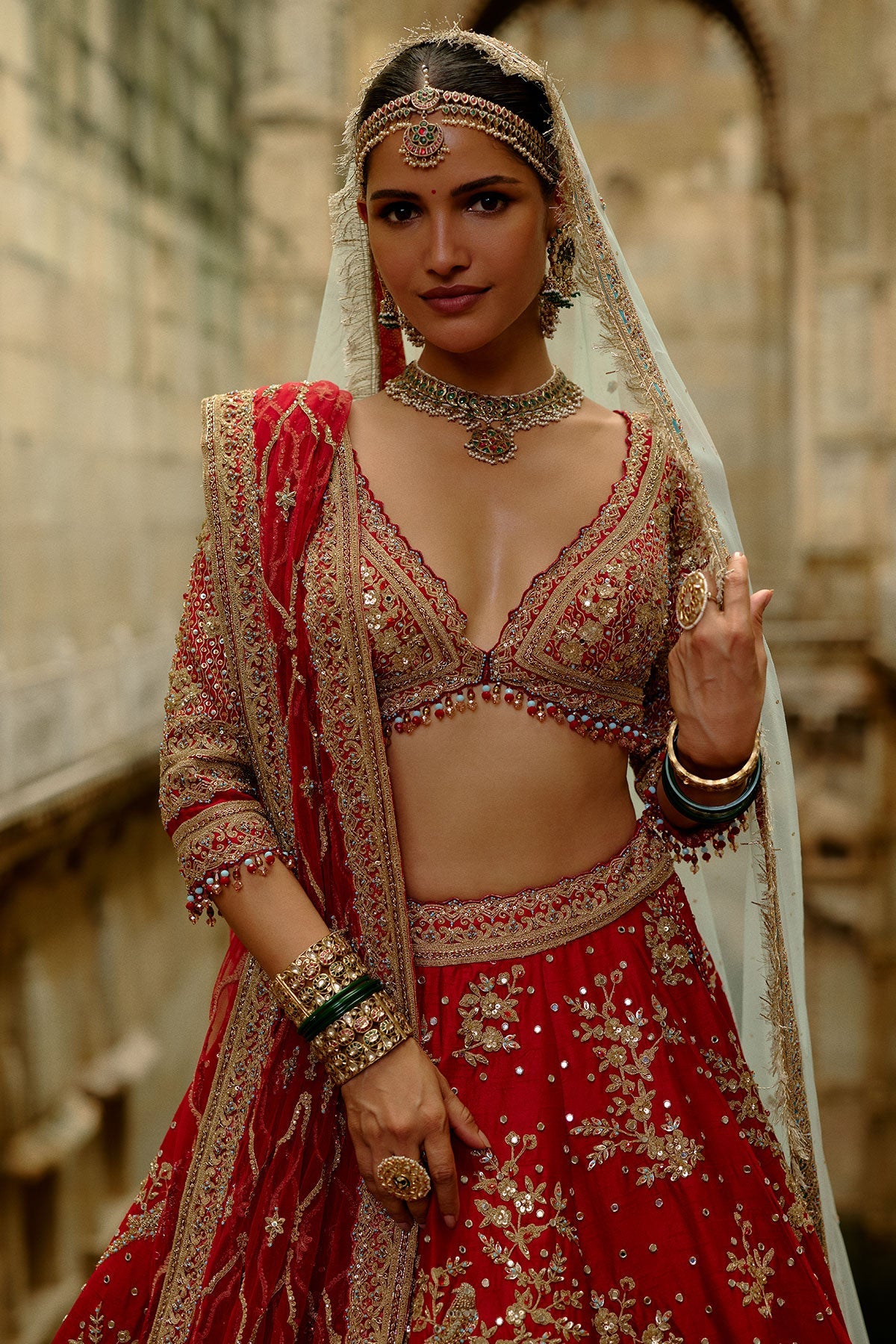 Red raw silk lehenga with detailed bead, zari, dabka, zardozi, sequin and kundan work. Comes with a matching choli dupatta and an optional second dupatta.