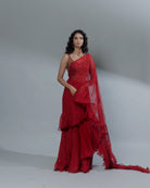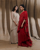 Featuring a RED THREAD RUFFLE SAREE WITH EMBELLISHED BLOUSE SET IN CHIFFON.