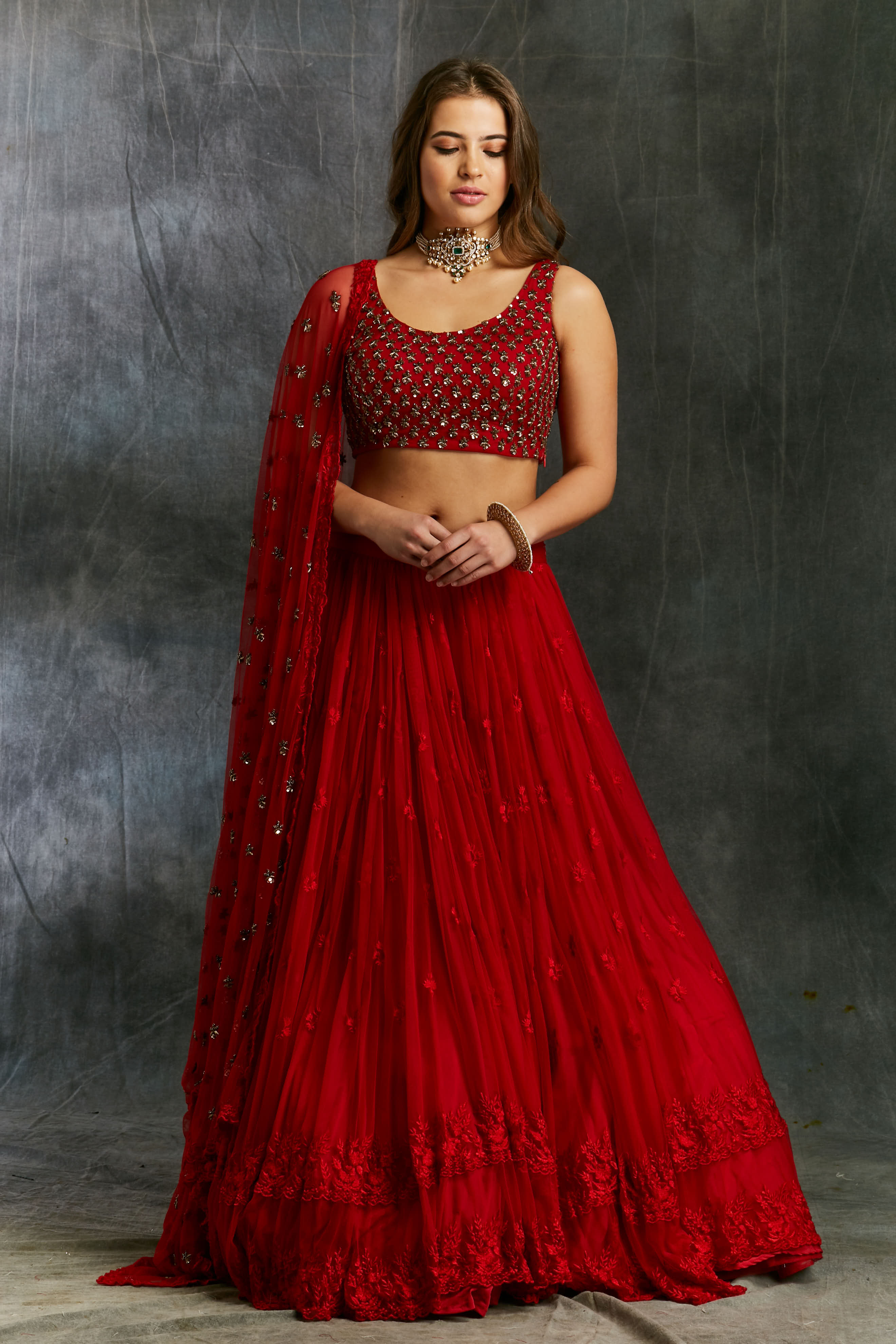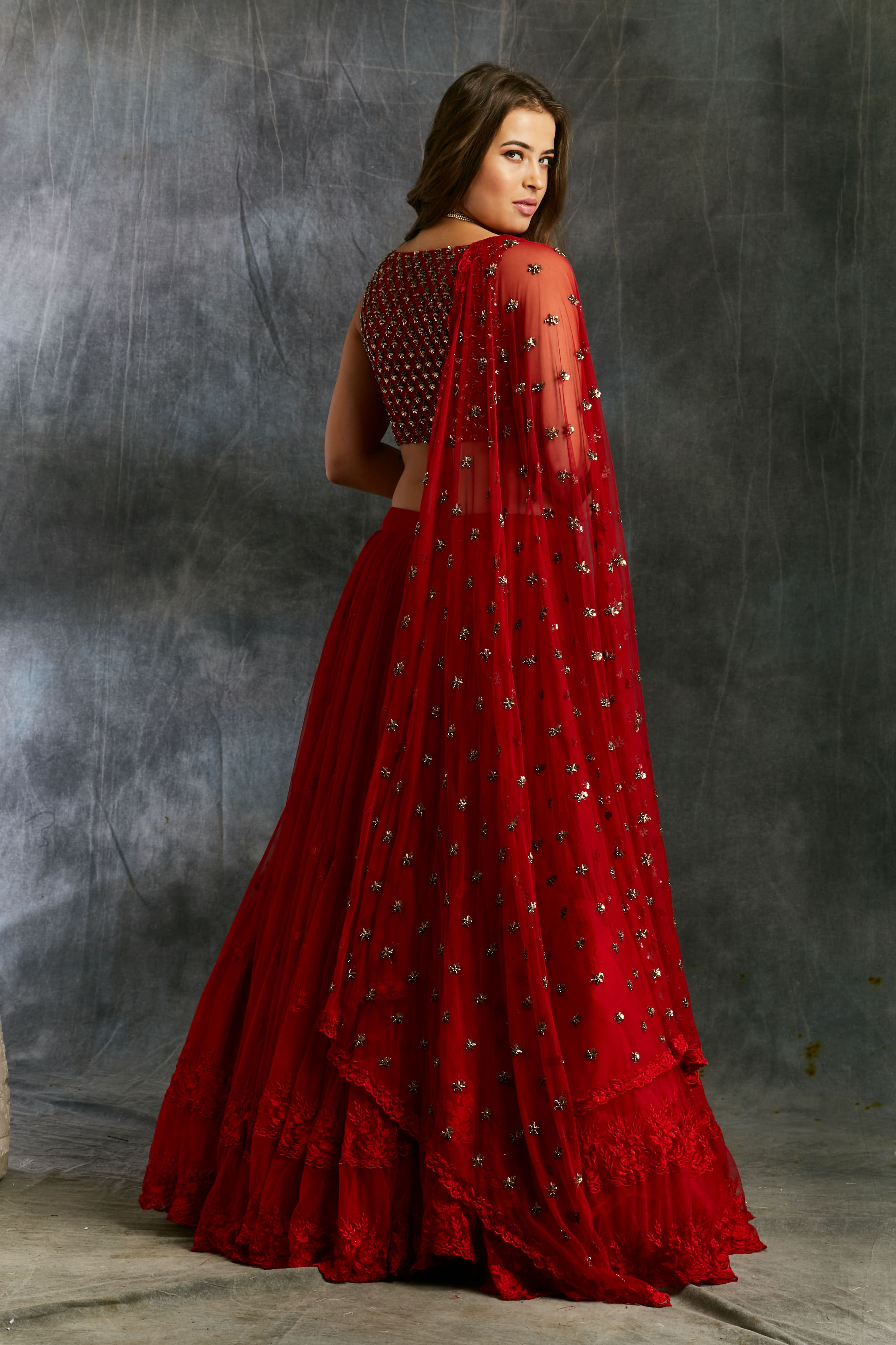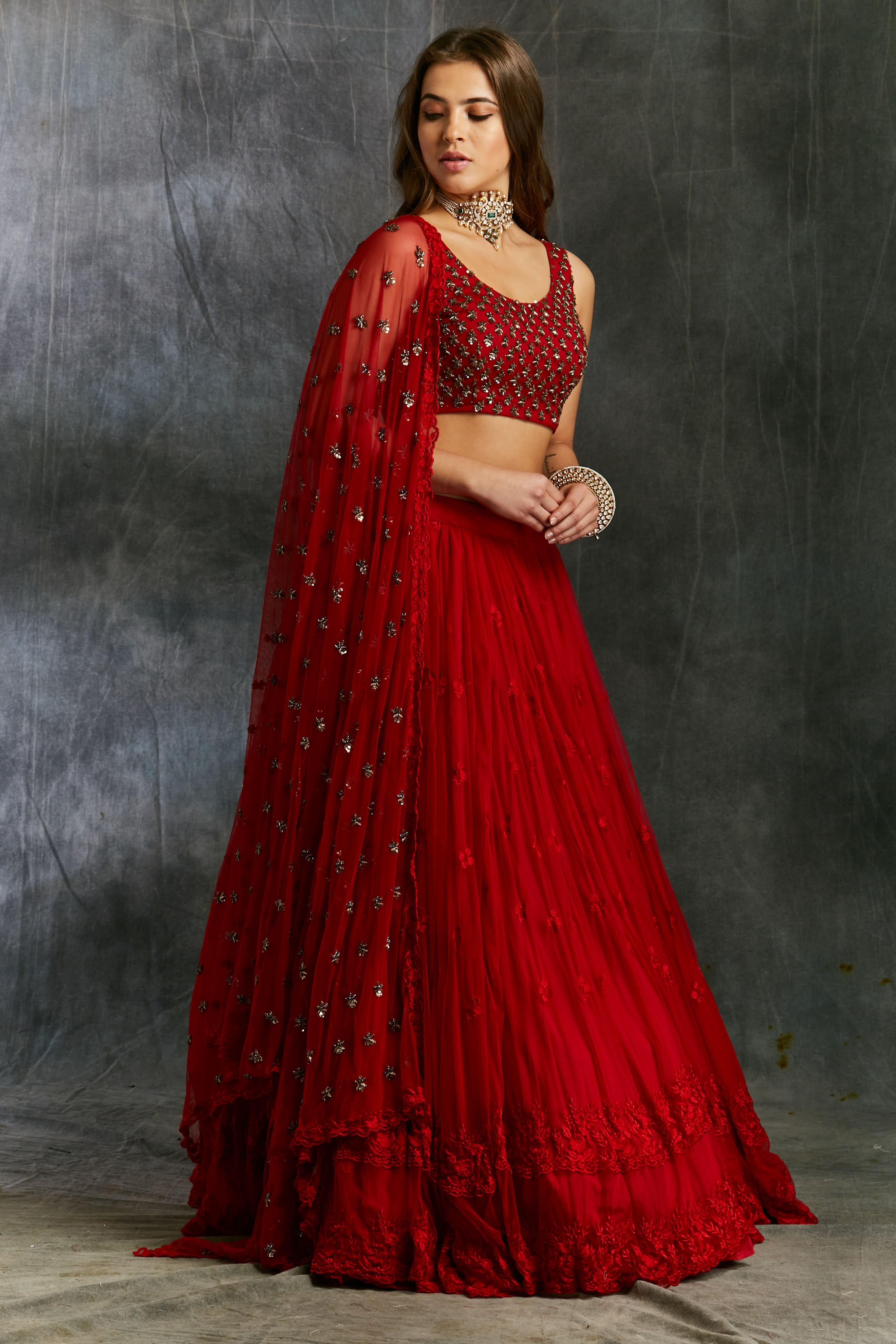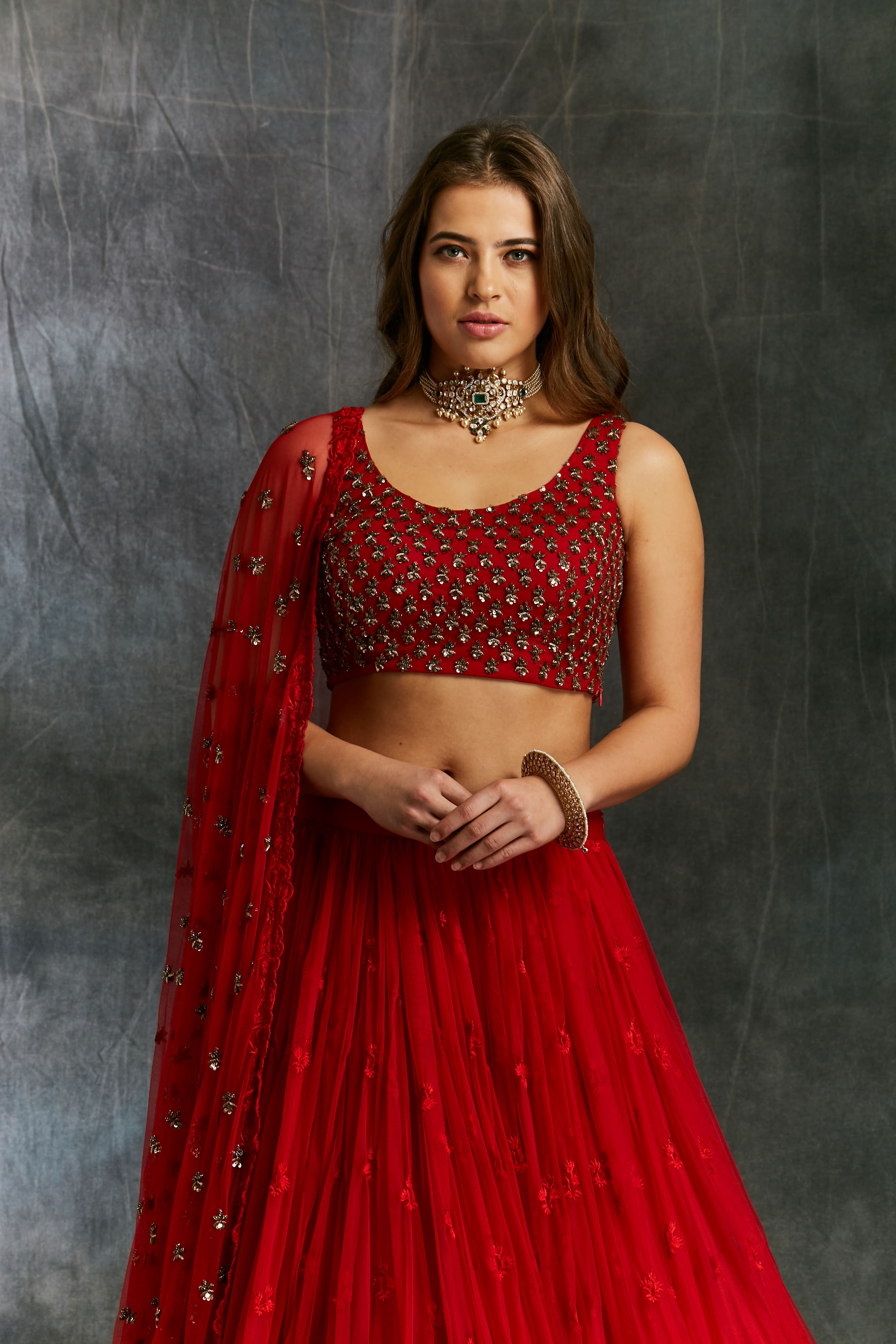 Featuring a RED THREADWORK LEHENGA WITH EMBELLISHED CHOLI IN NET.