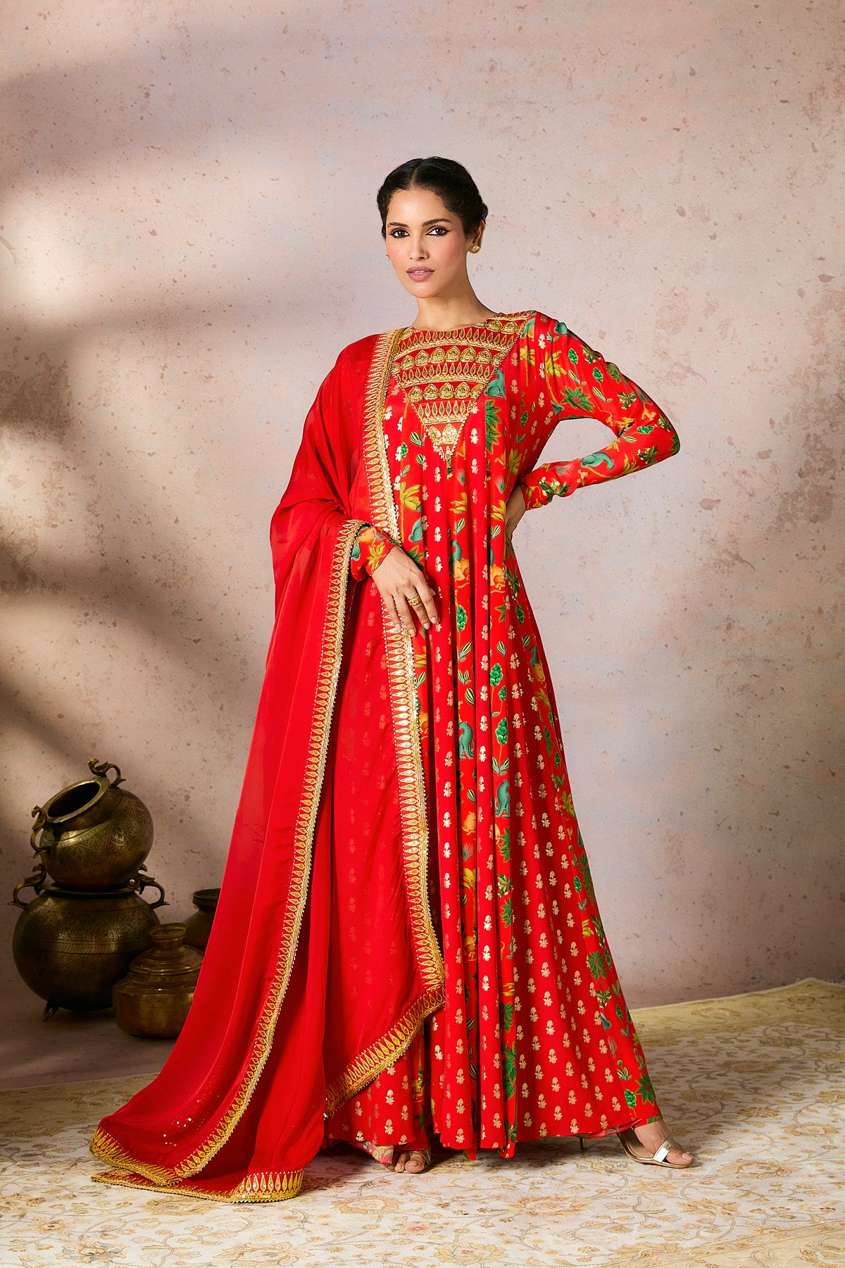 Anarkali- Beautiful foil printed anarkali embellished with embroidered yoke and kinari | Full sleeves | Round neckline | Center back opening Dupatta- Georgette dupatta is embellished with embroidered border and edged with kinari