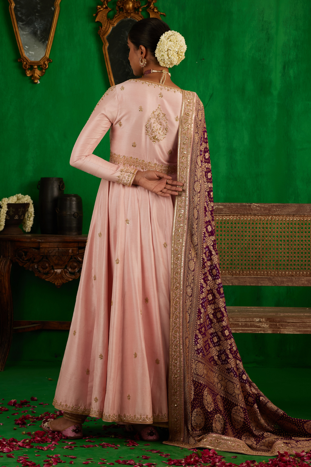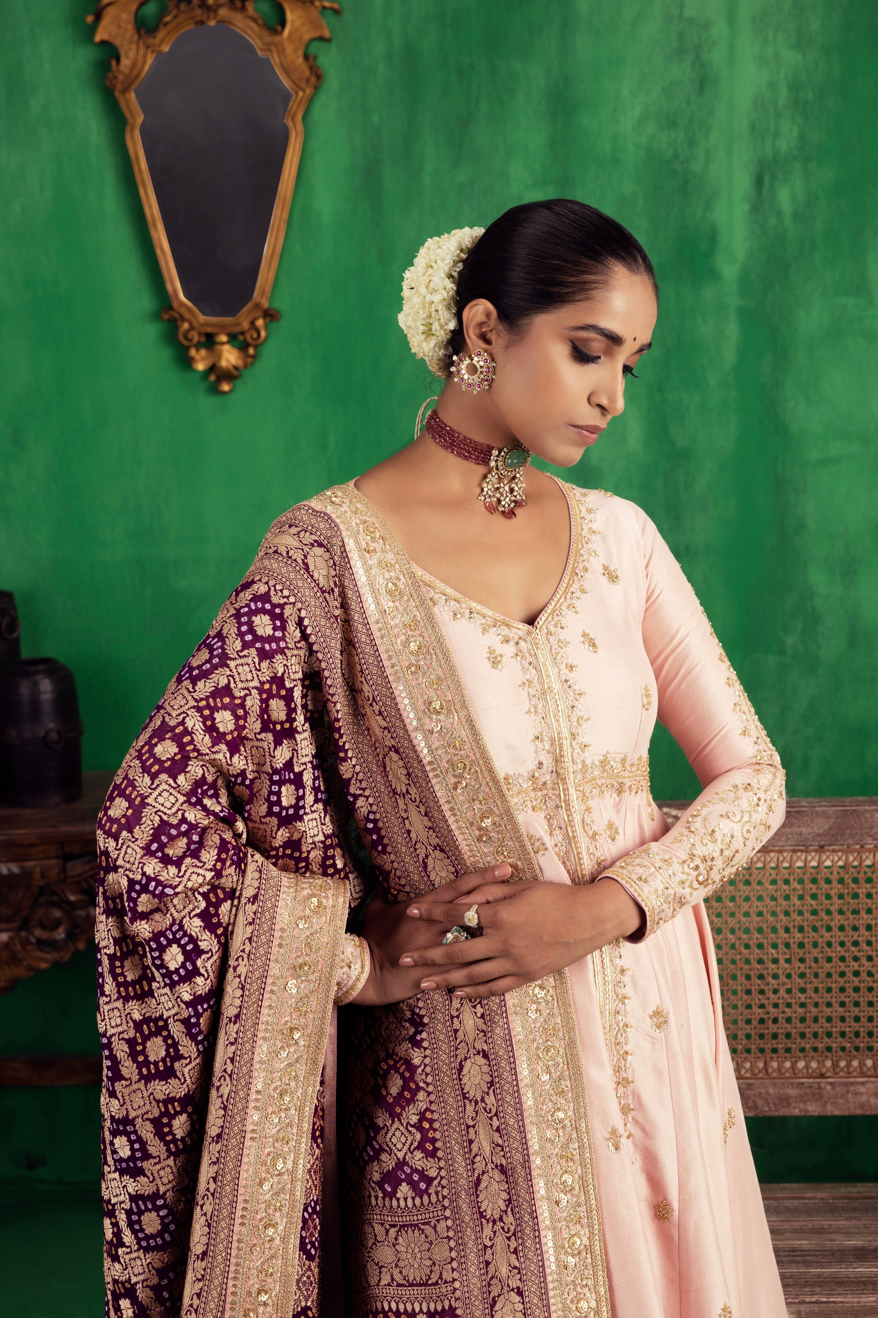 Featuring a baby pink Chanderi jacket paired with a pant and a Banarsi dupatta