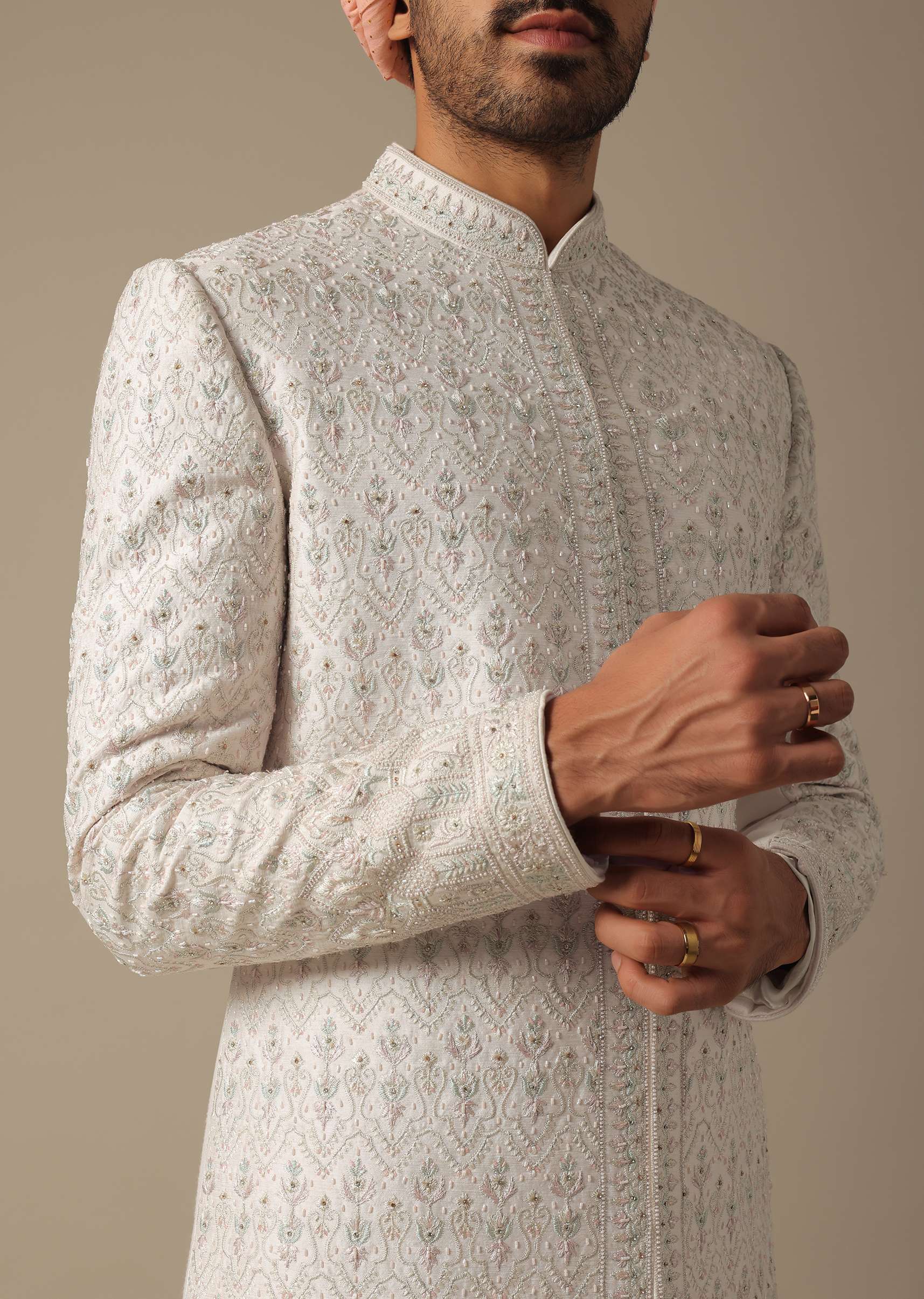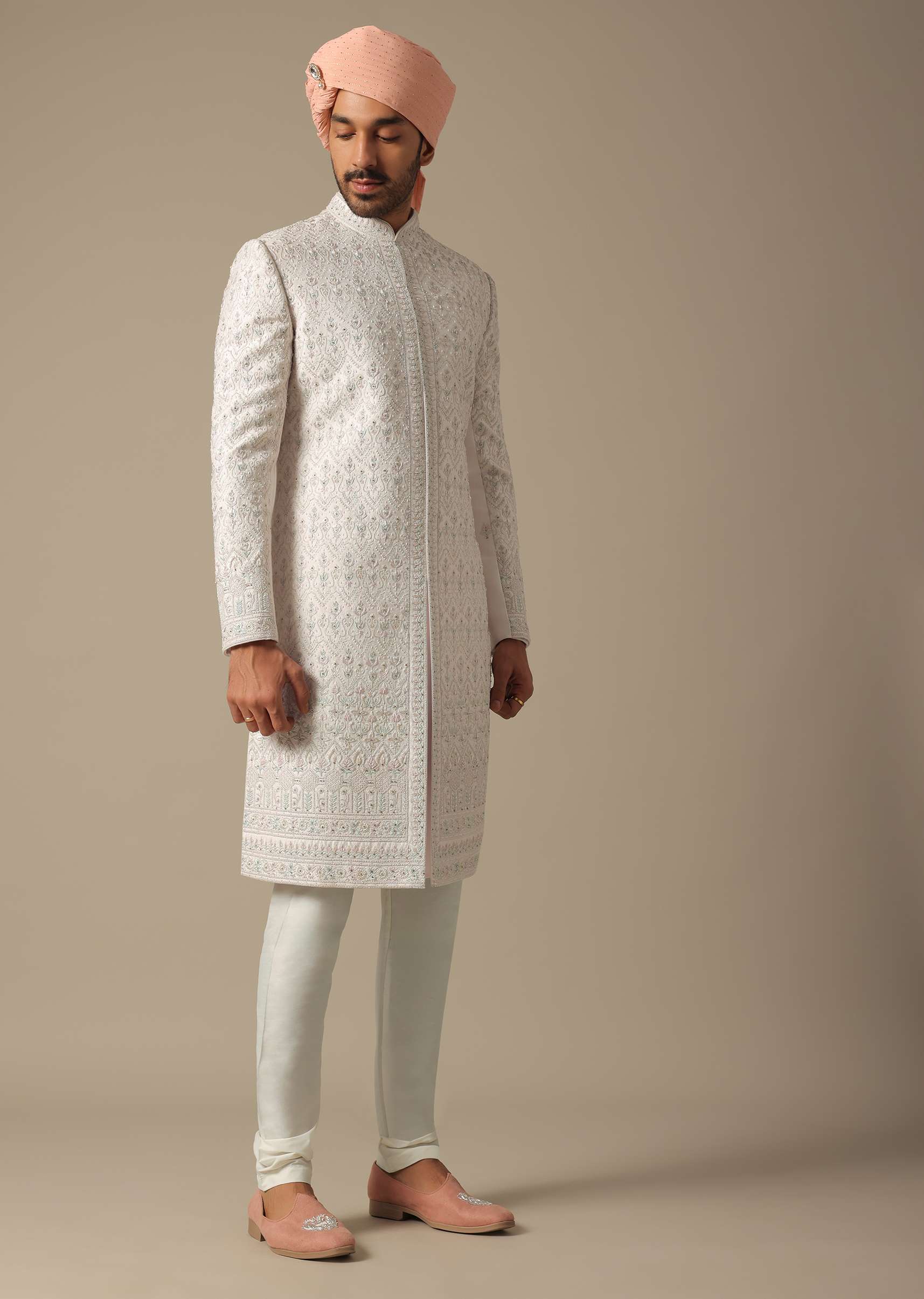- Paired with a mandarin collar and full sleeves, this ensemble includes a sherwani, kurta and churidar.