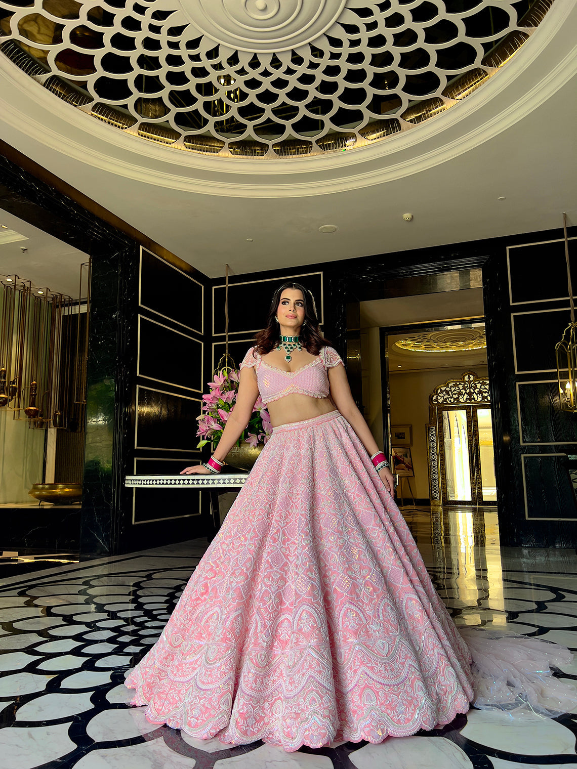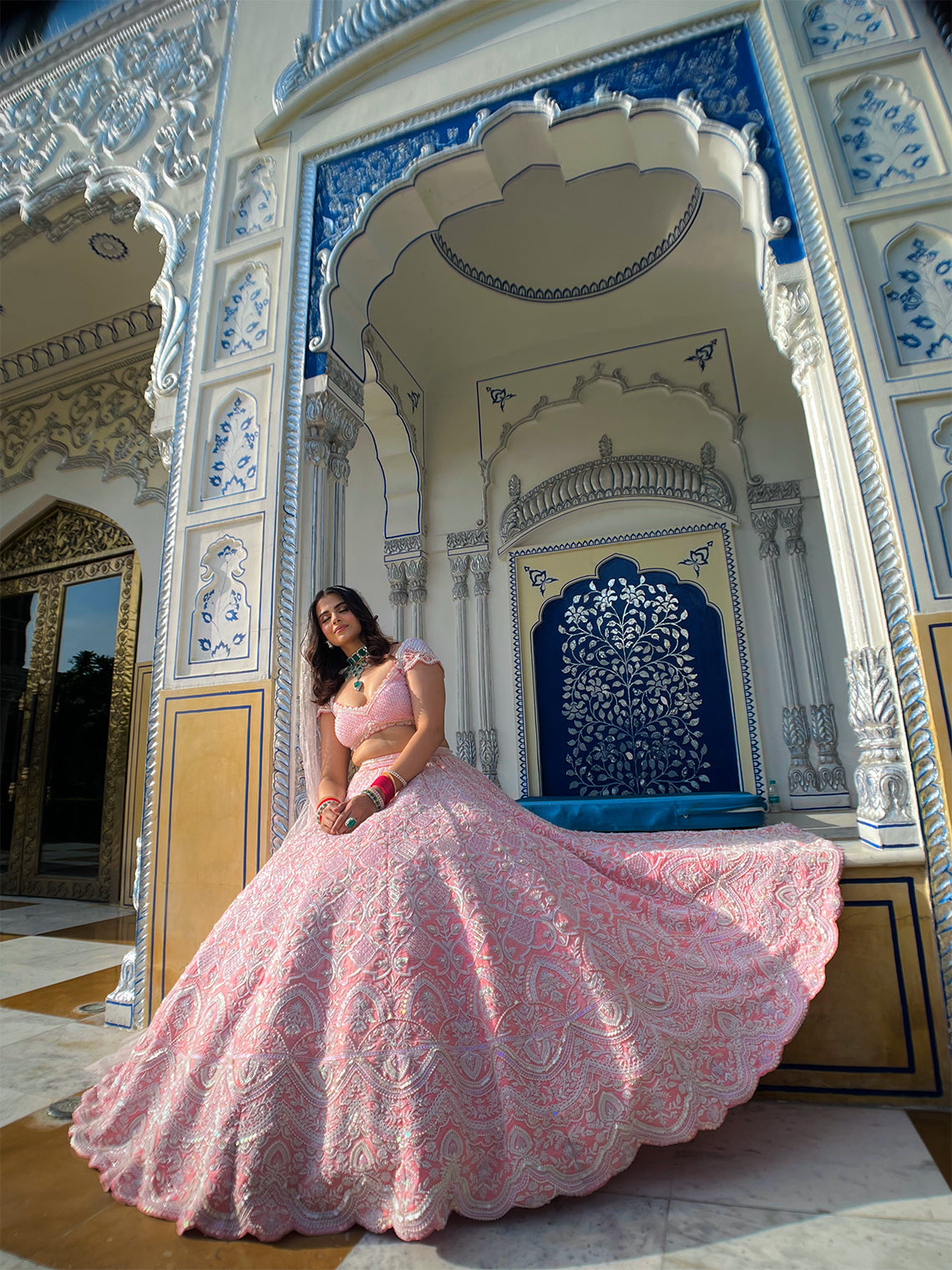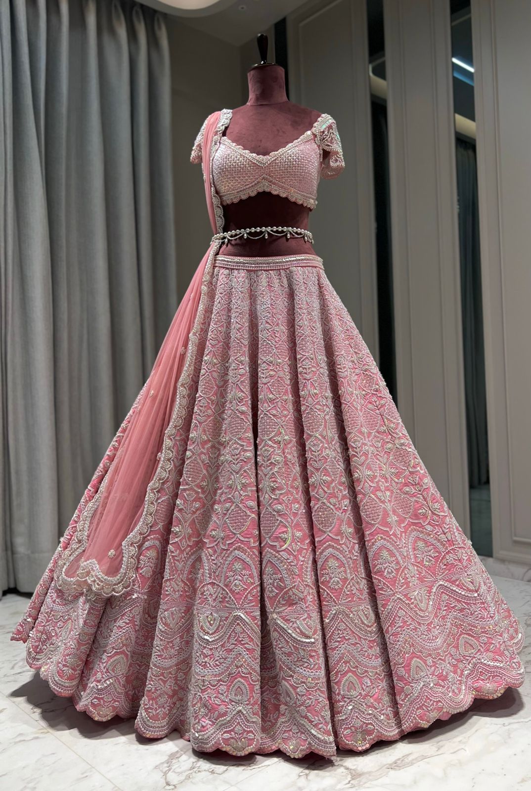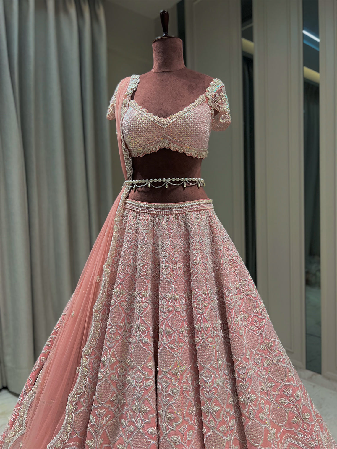 Reverie Bridal set is a stunning coral pink lehenga hand embroidered on pure raw silk fabric with signature glass crystals, pearls, sequins and bead and has scalloped edges on the lehenga. Its paired with a attractive hand embroidered blouse with cap sleeves on net fabric. It comes with a peachy pink soft net scalloped dupatta, a gorgeous soft net trail dupatta and pearl belt which enhances the entire look.