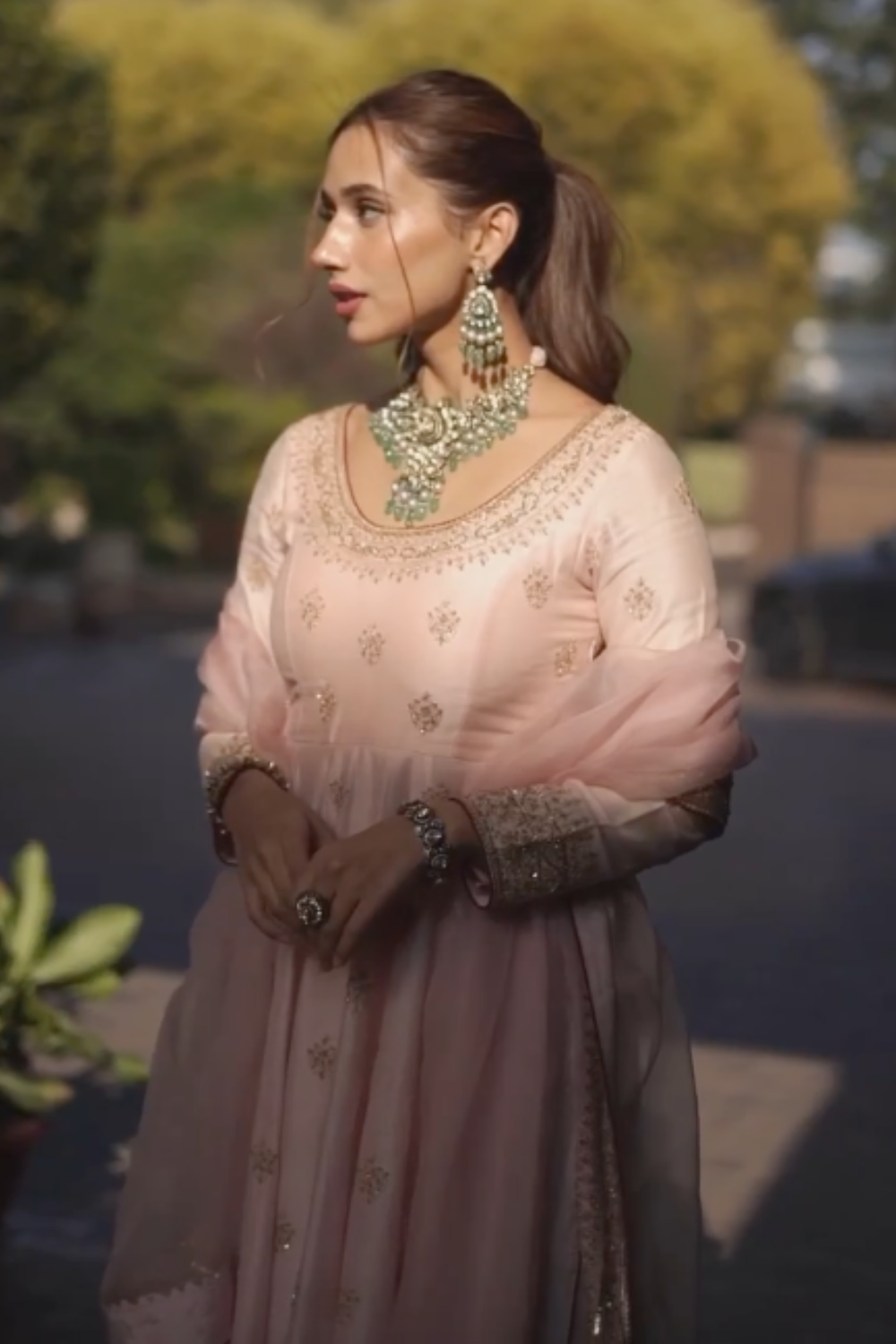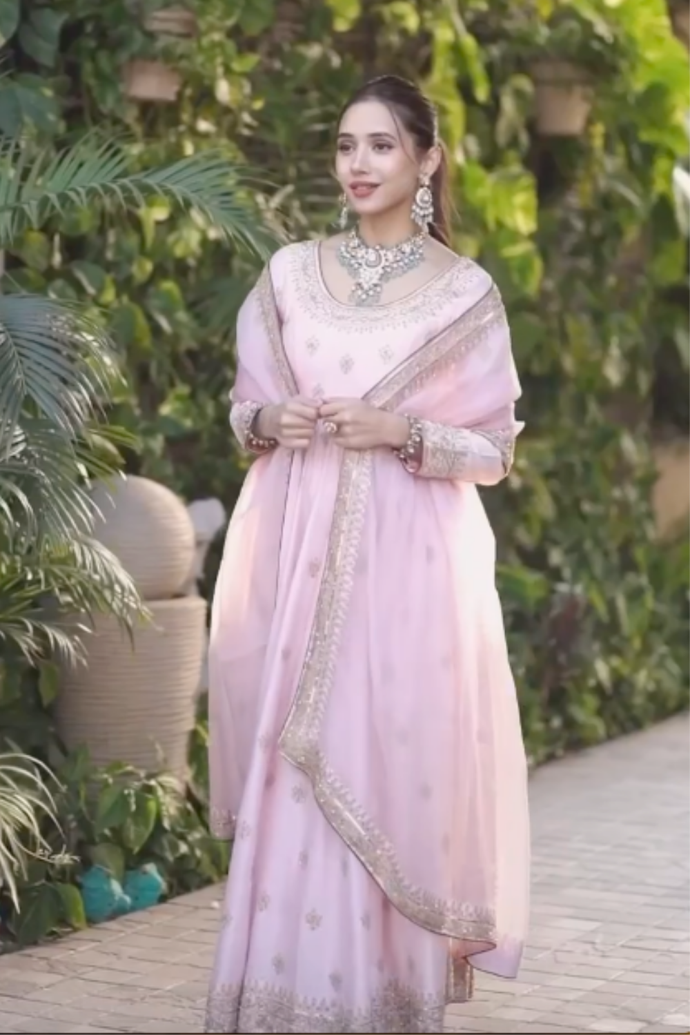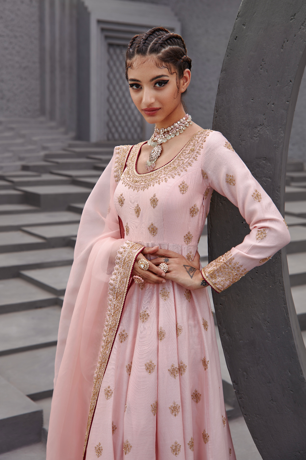 Featuring a pink Chanderi anarkali paired with a cotton silk churidar and an organza dupatta with gold dori and aari embroidery