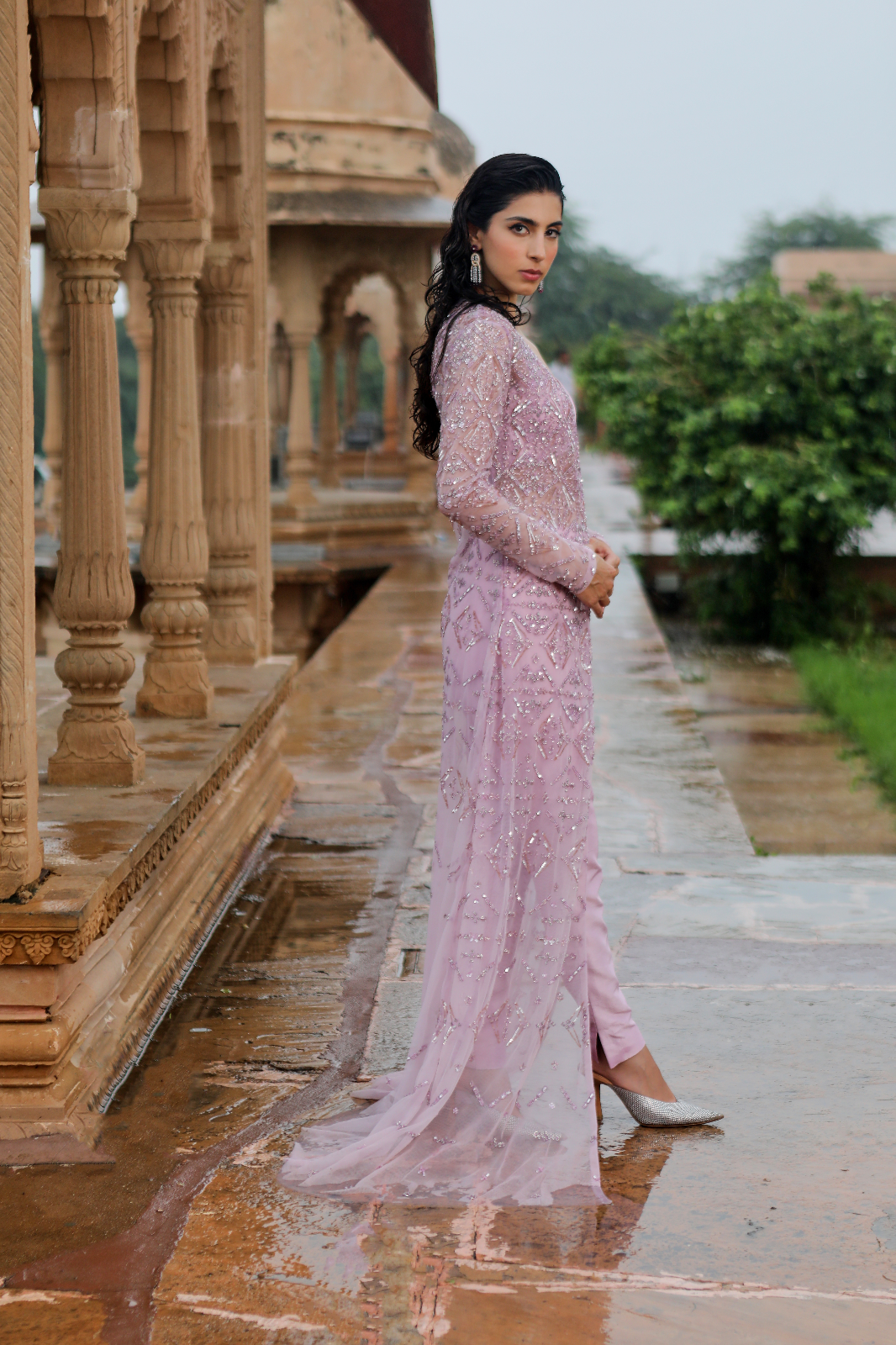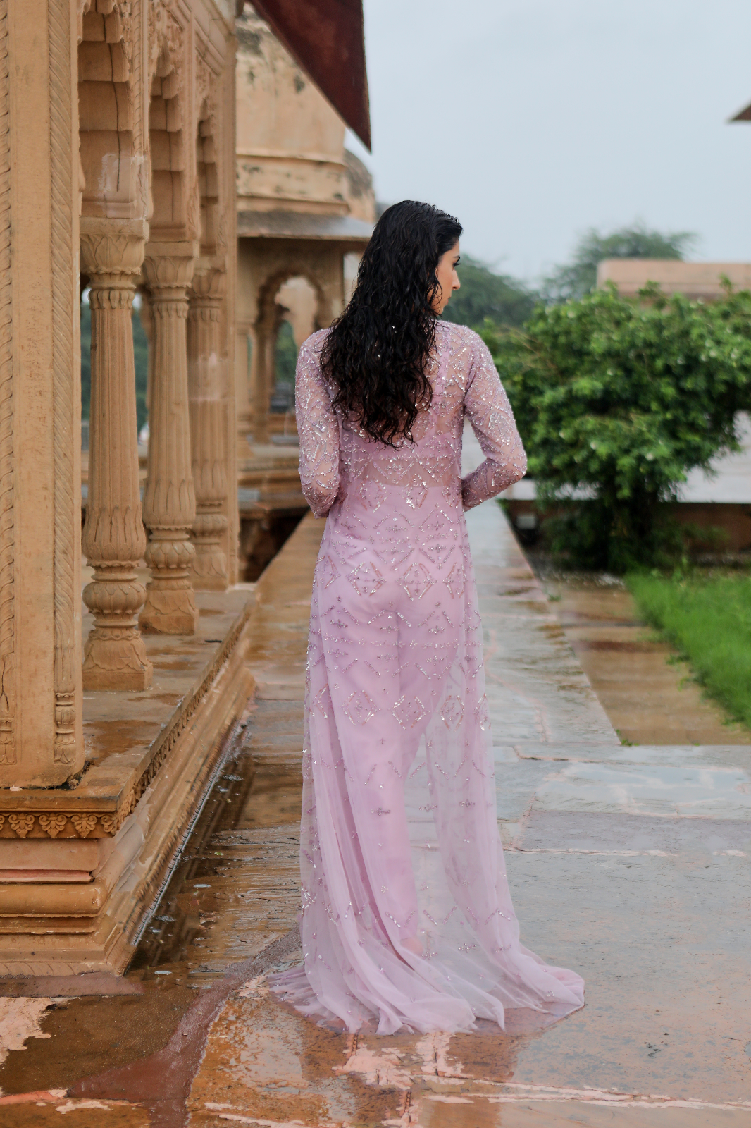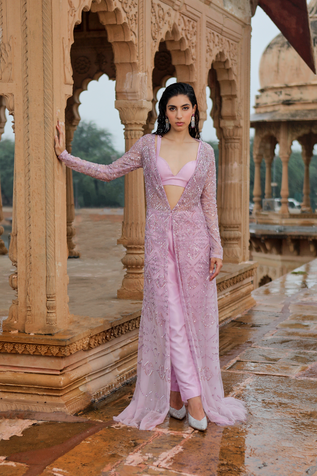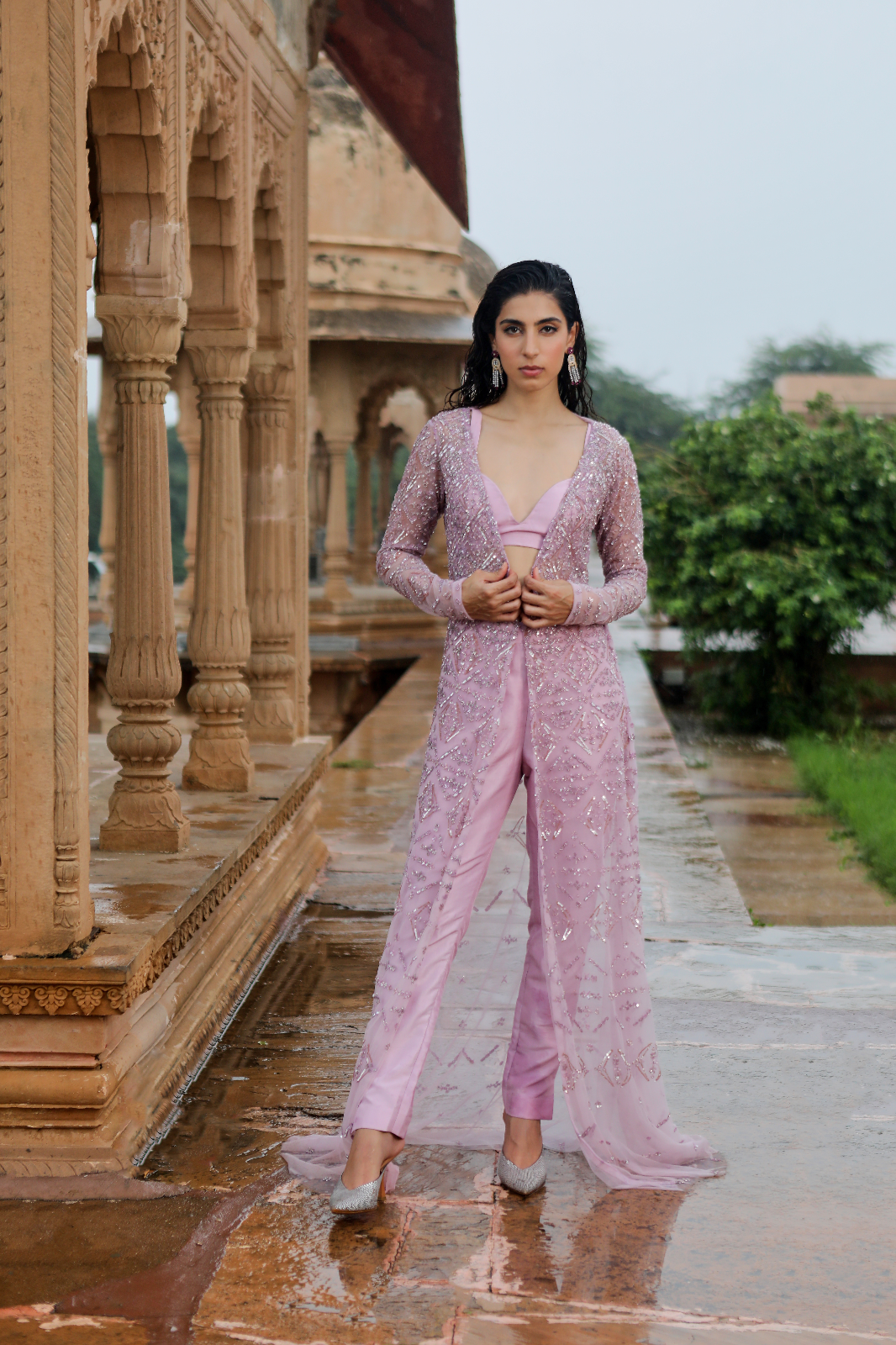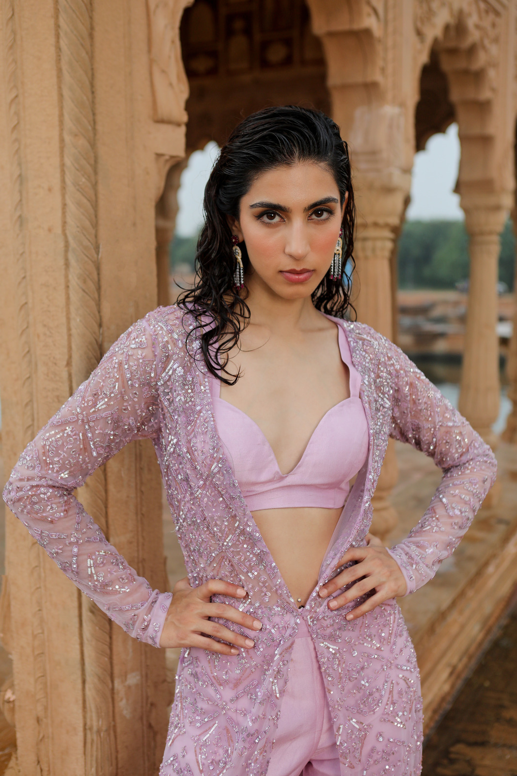 Featuring a lavender, tone-on-tone embellished jacket set paired with a bustier and pants