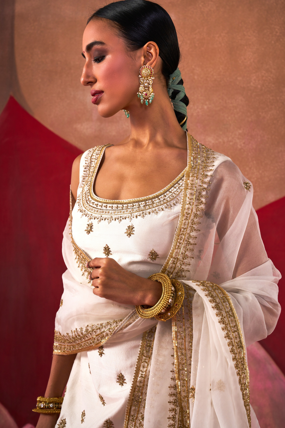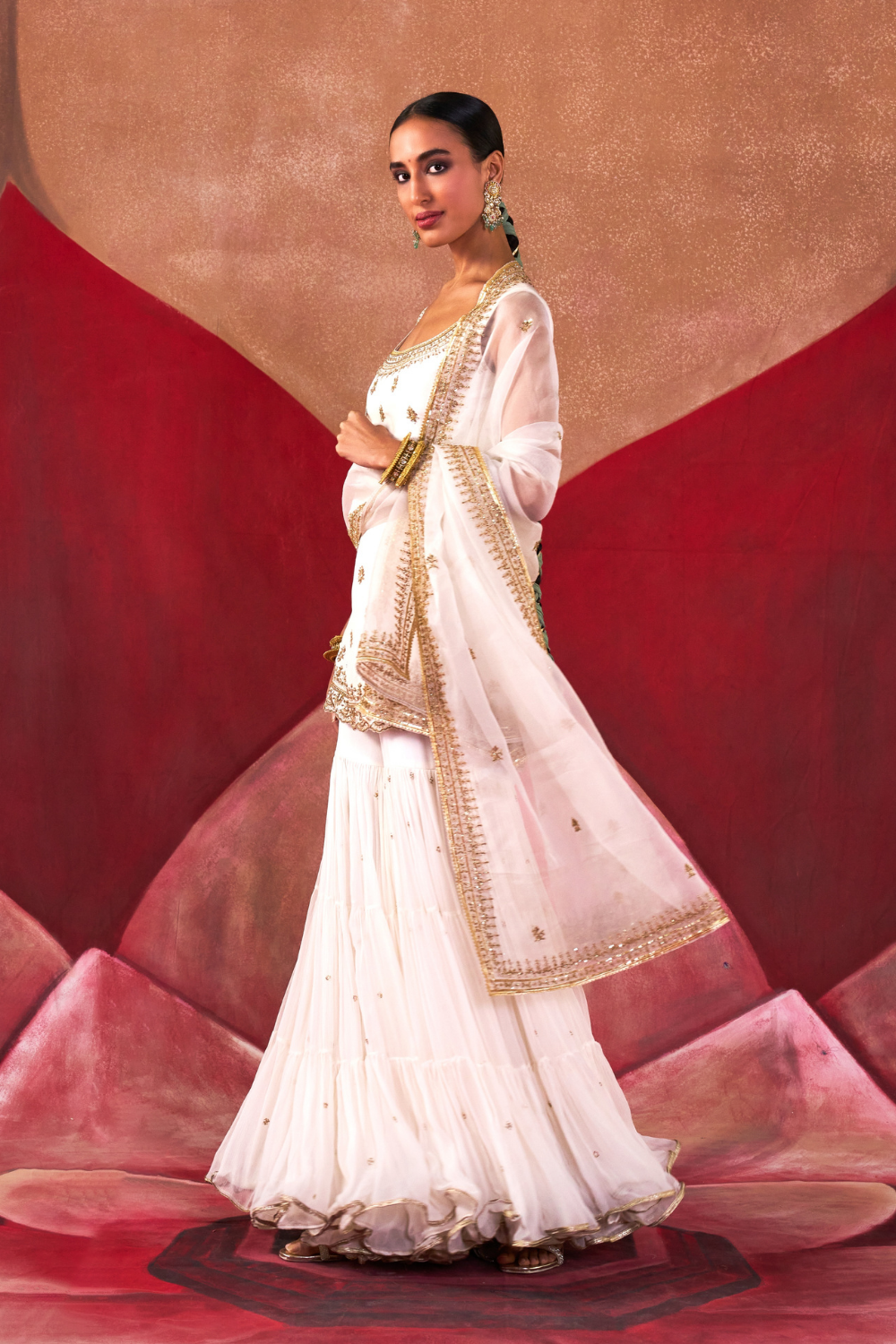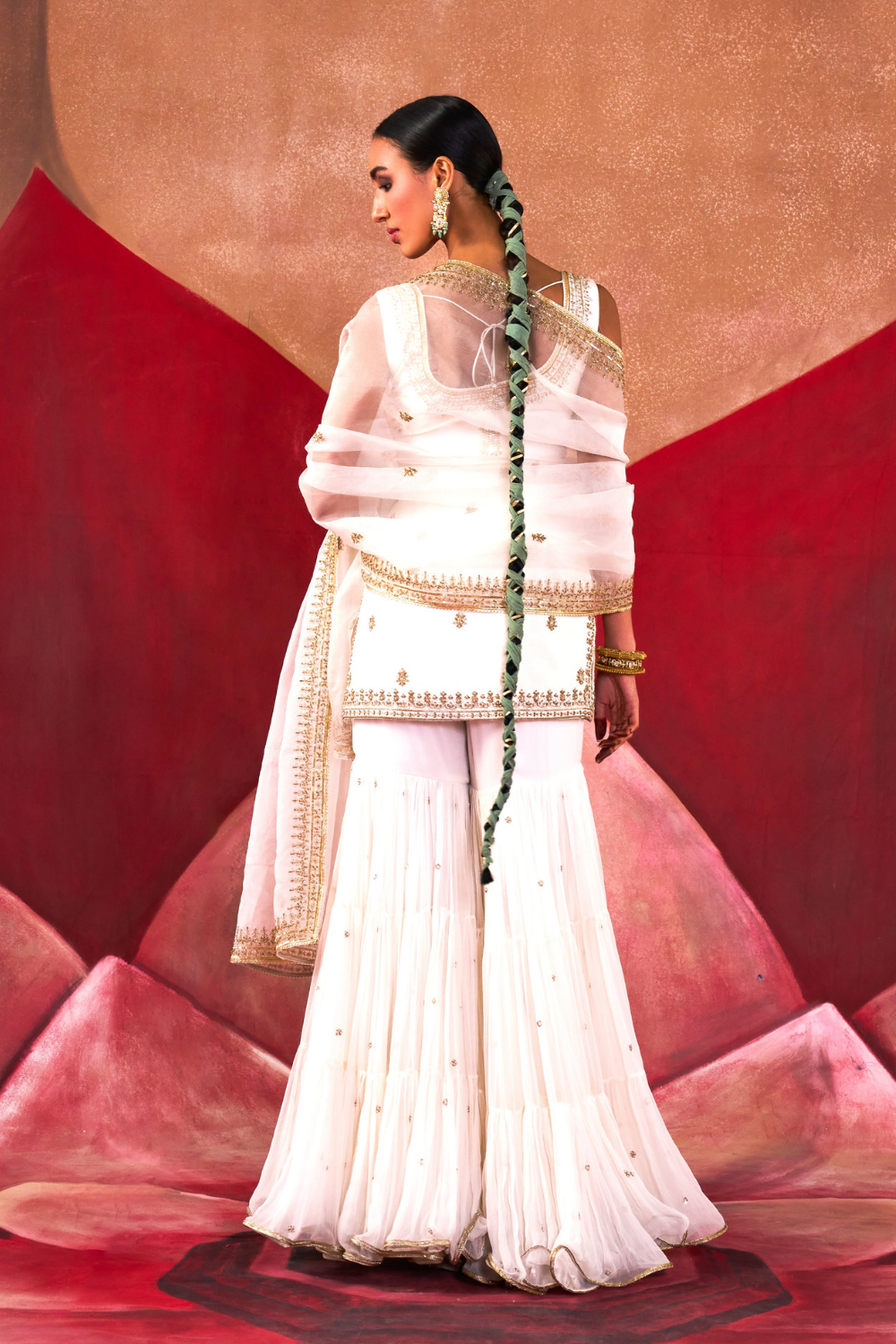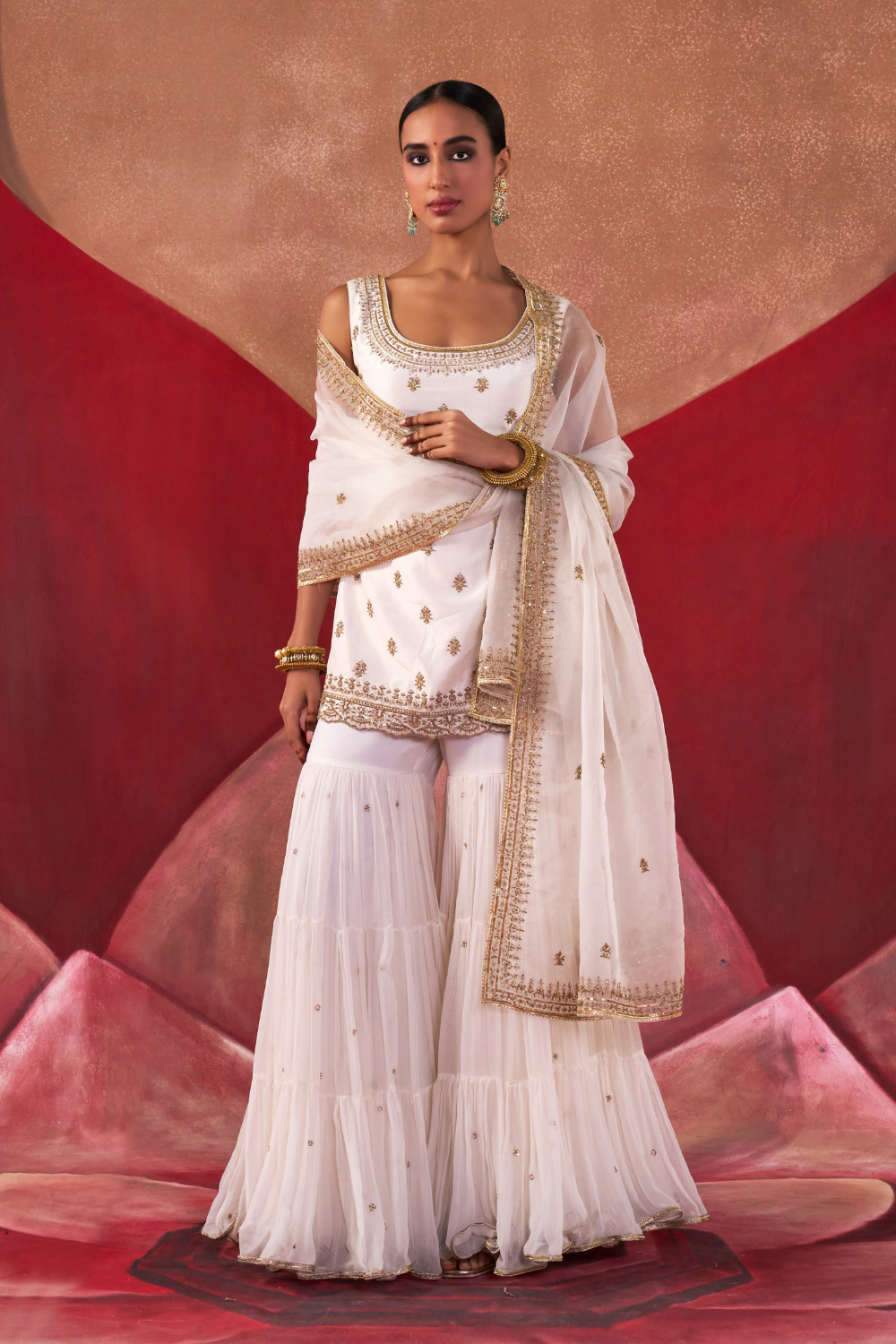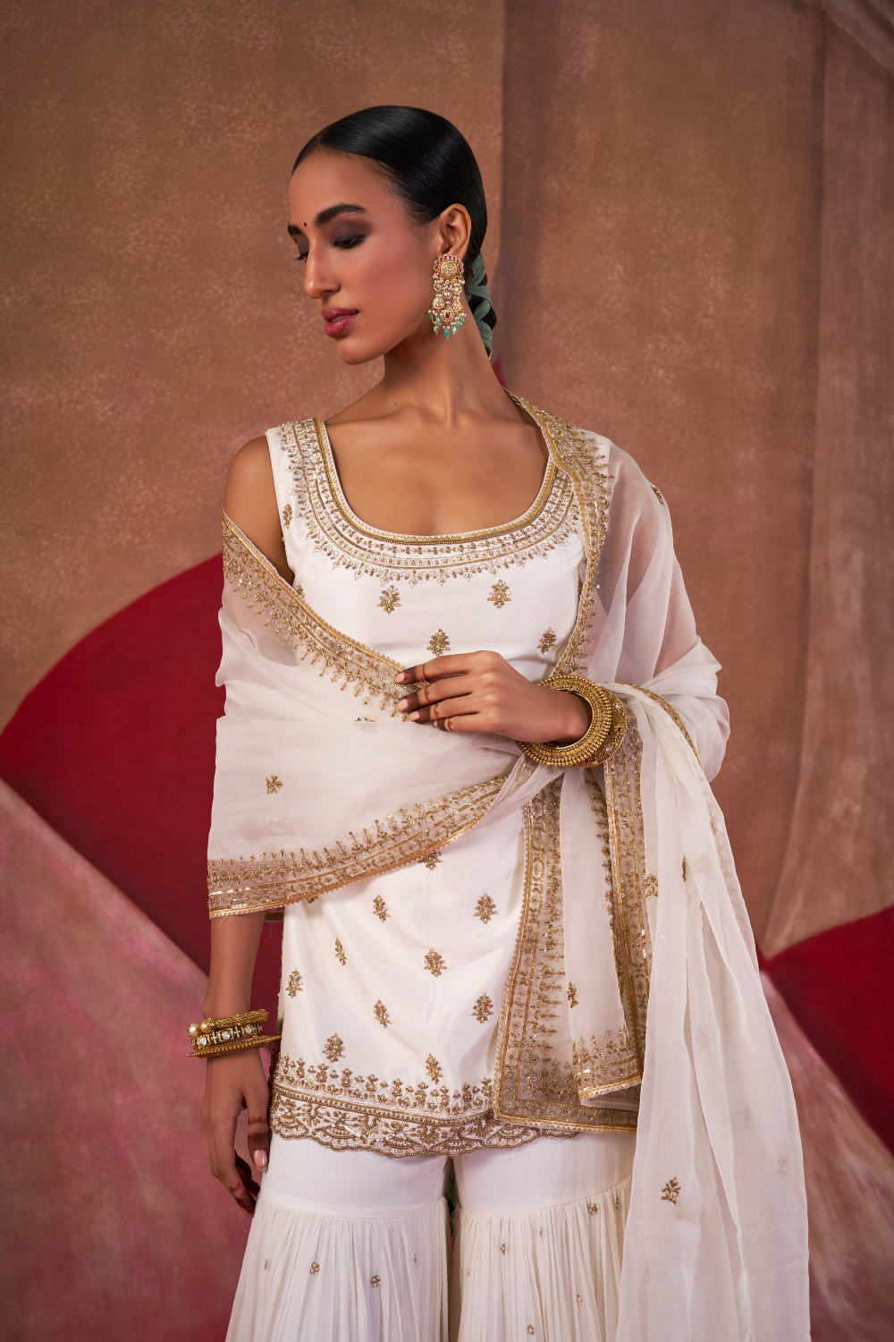 Featuring an off-white dupion silk kurta & chinon gharara set paired with an organza base dupatta with embellished hand embroidery.