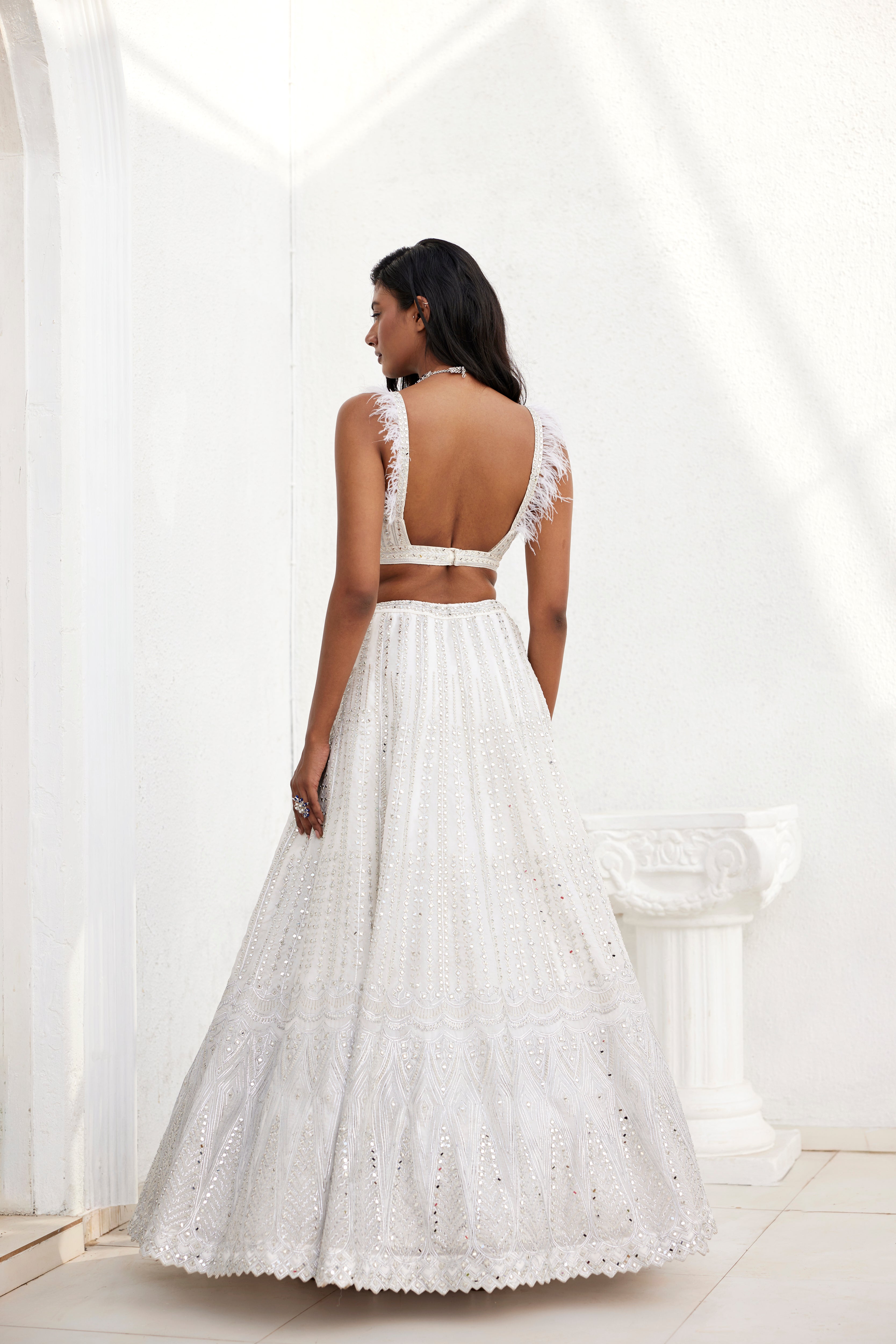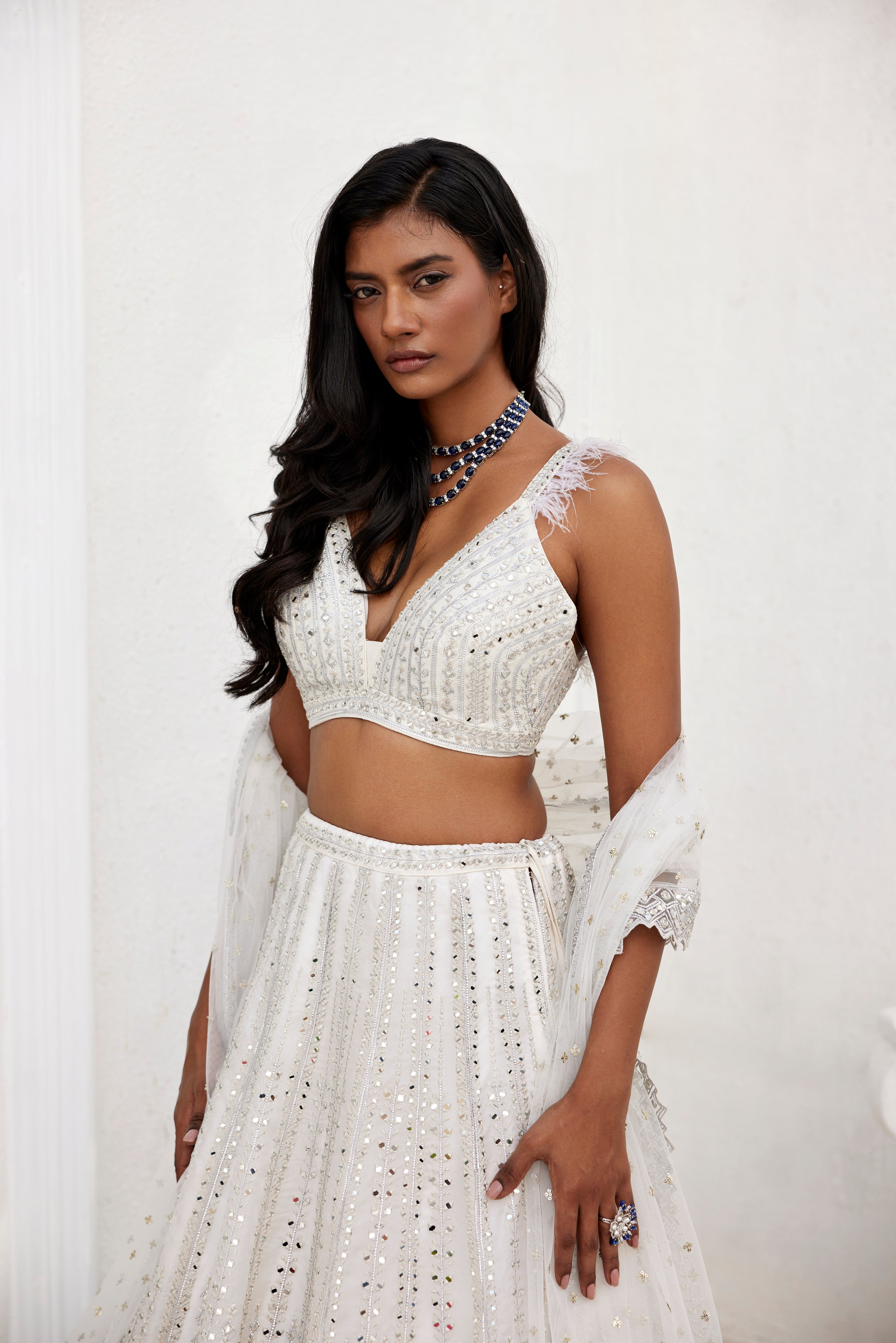 Ivory geometric mirror and silver thread work embroidered skirt, paired with an embroidered blouse with feather detailing on the staps and tulle dupatta with sequince floral buttis and geometric embroidered border.