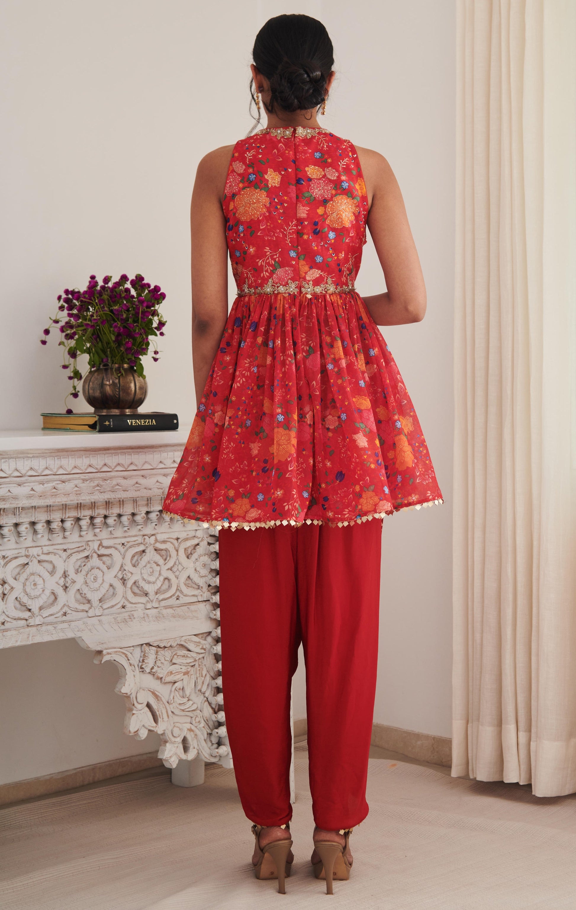 Bright red floral printed cut sleeves kurta with hand embellished golden and silver