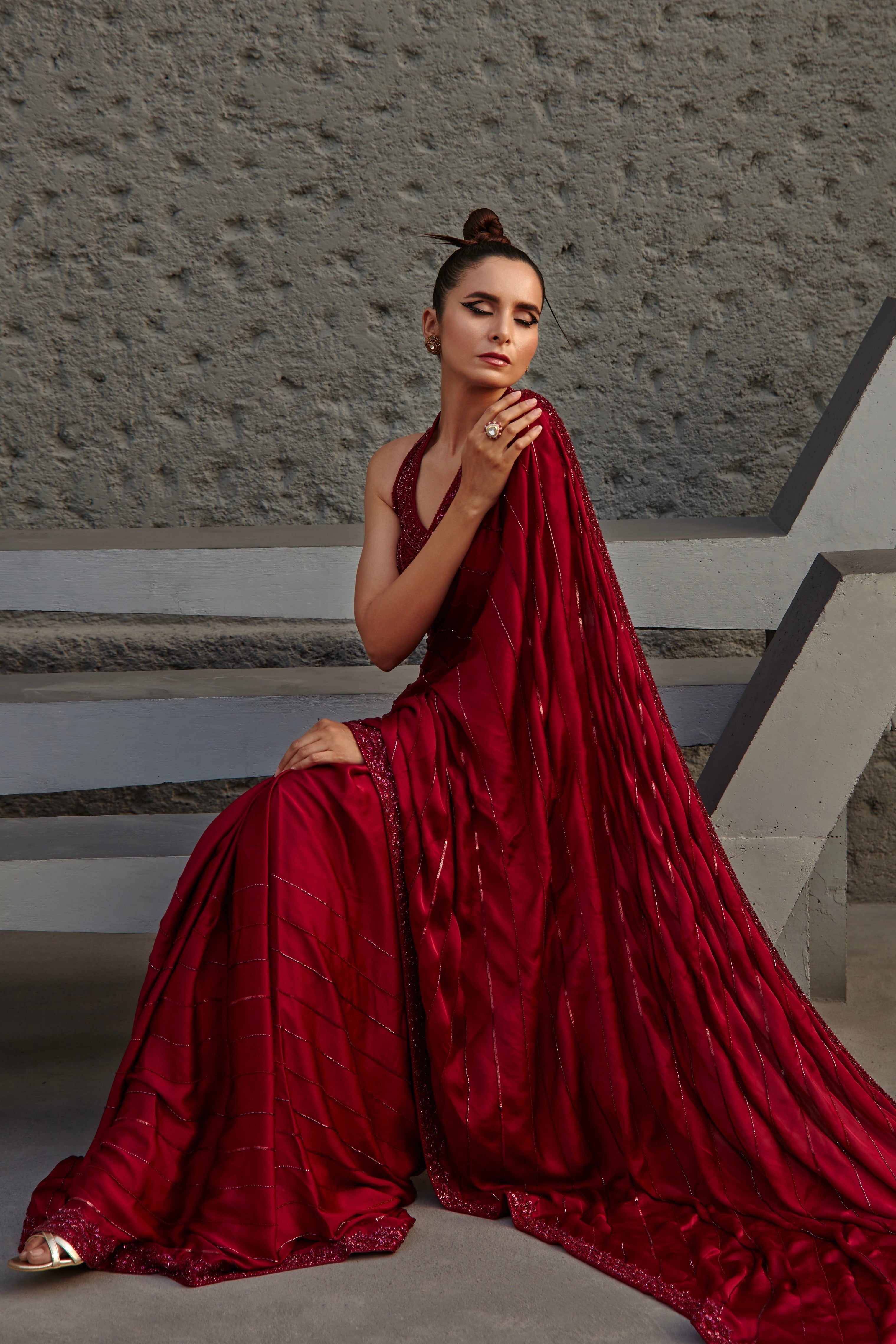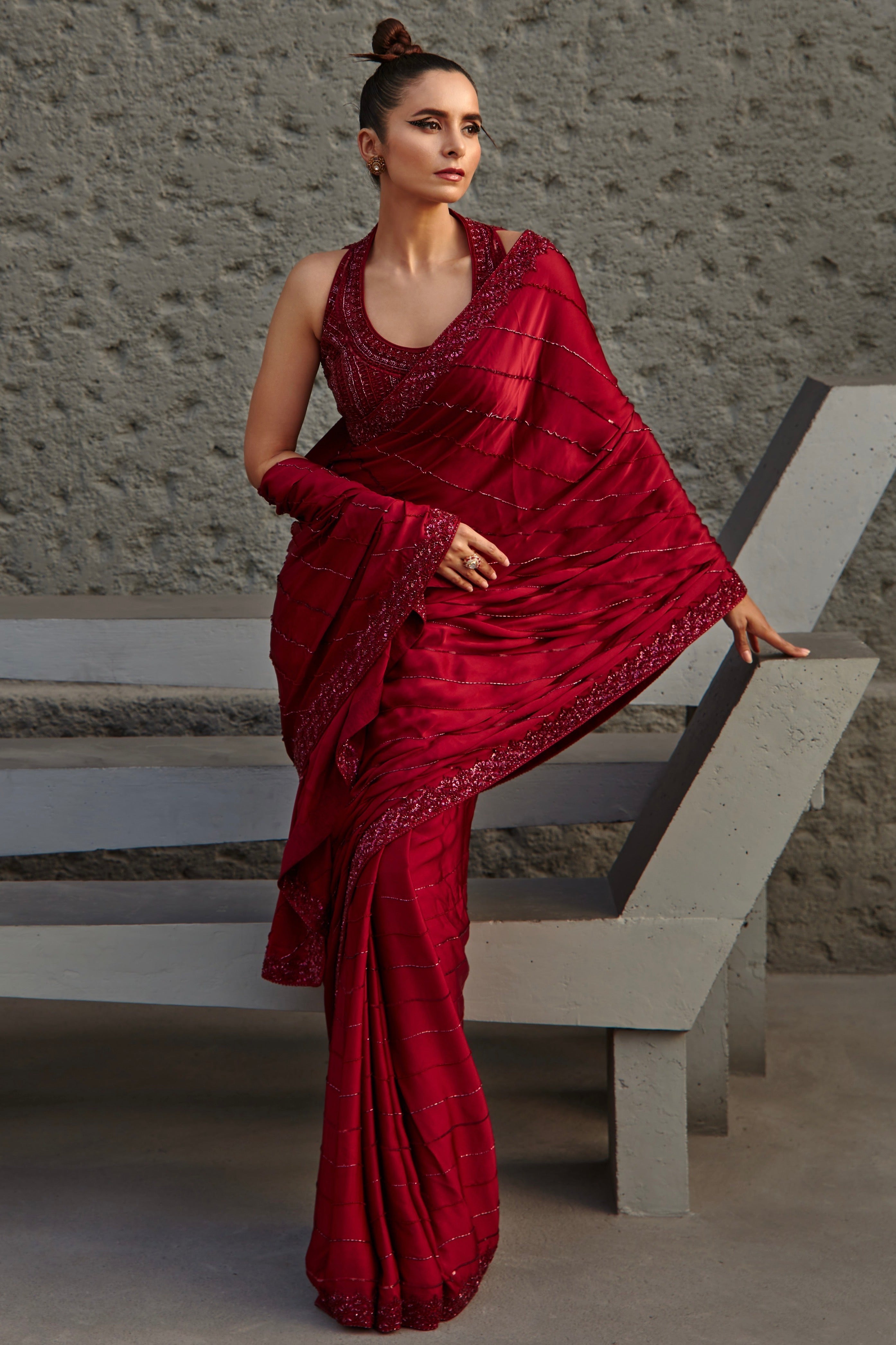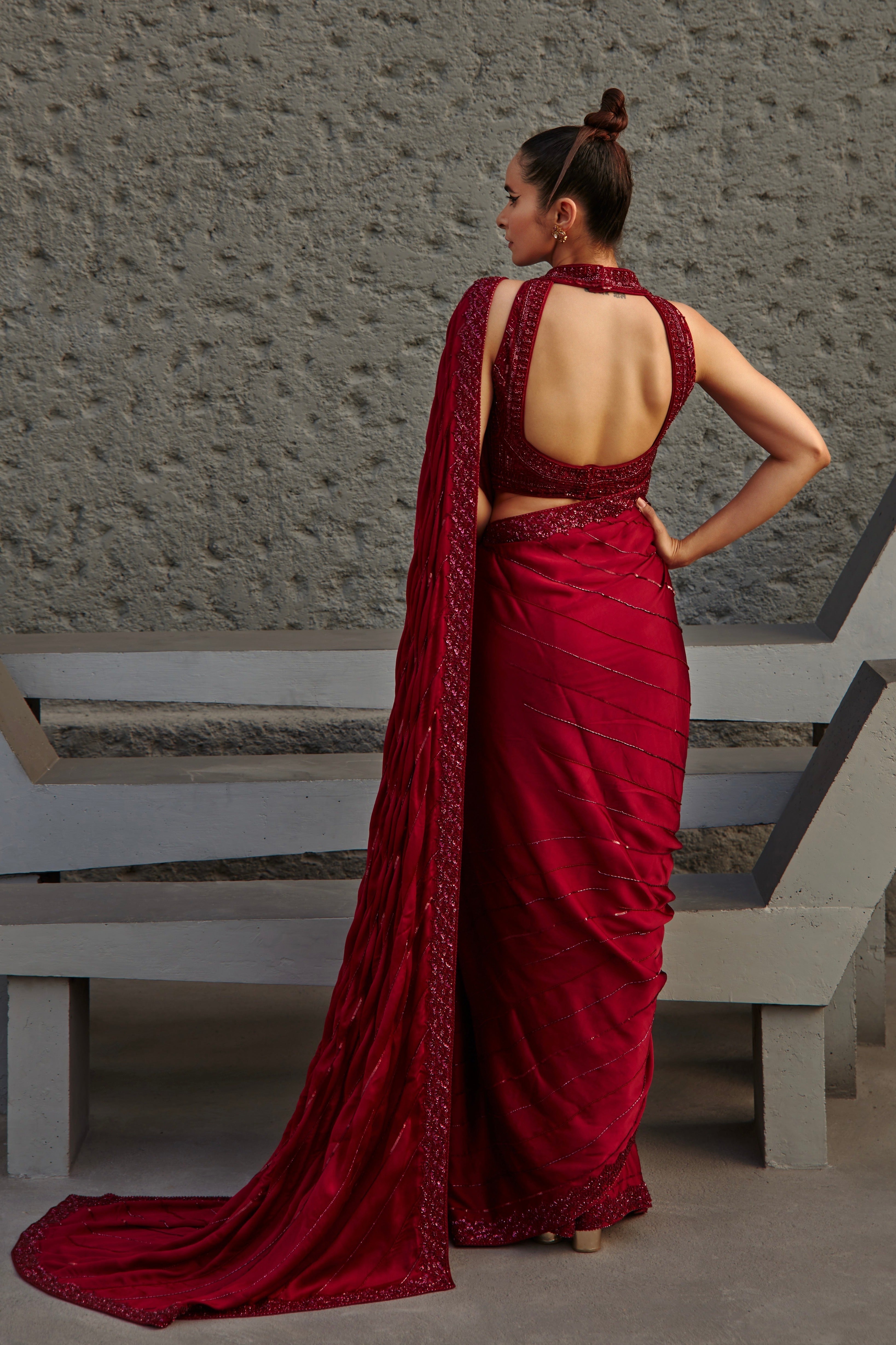 Featuring a wine coloured satin georgette saree paired with a net blouse with tone on tone sequin embroidery