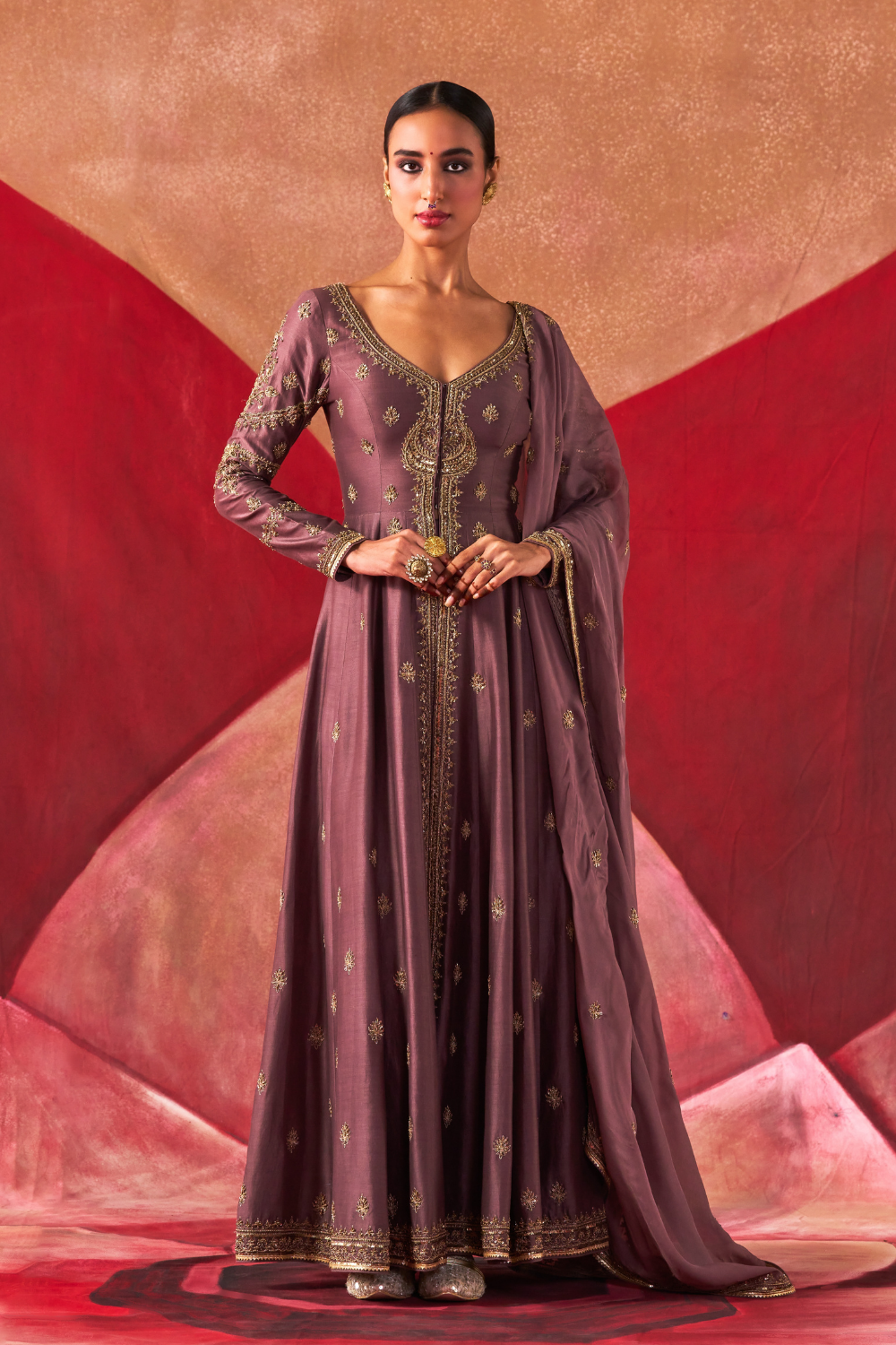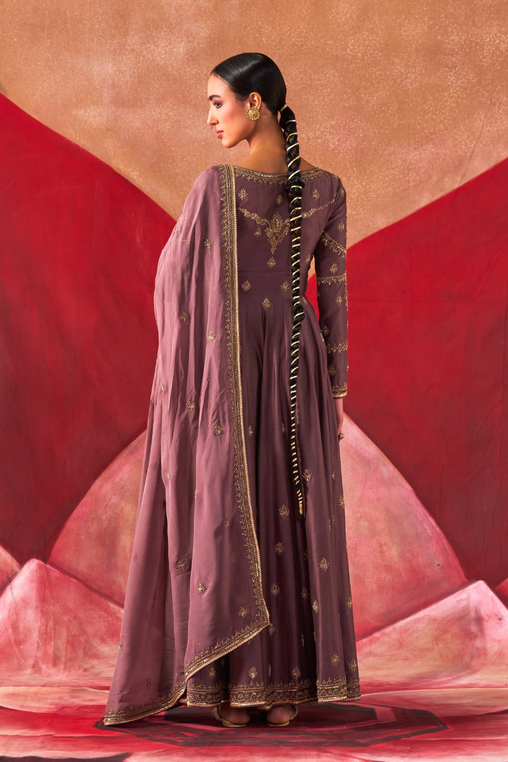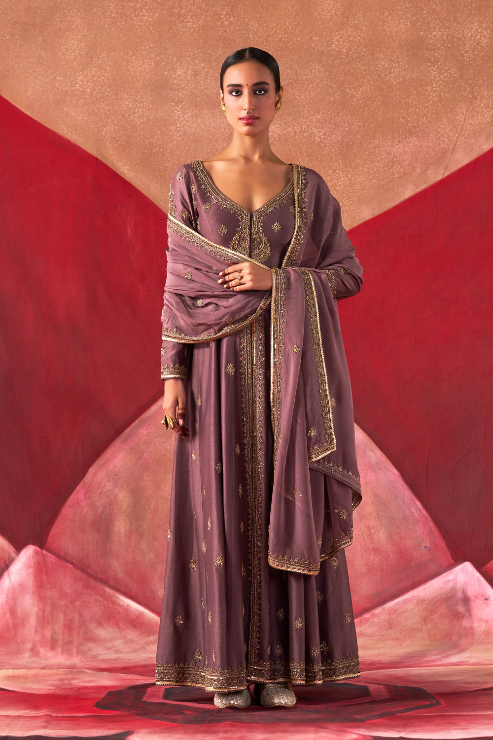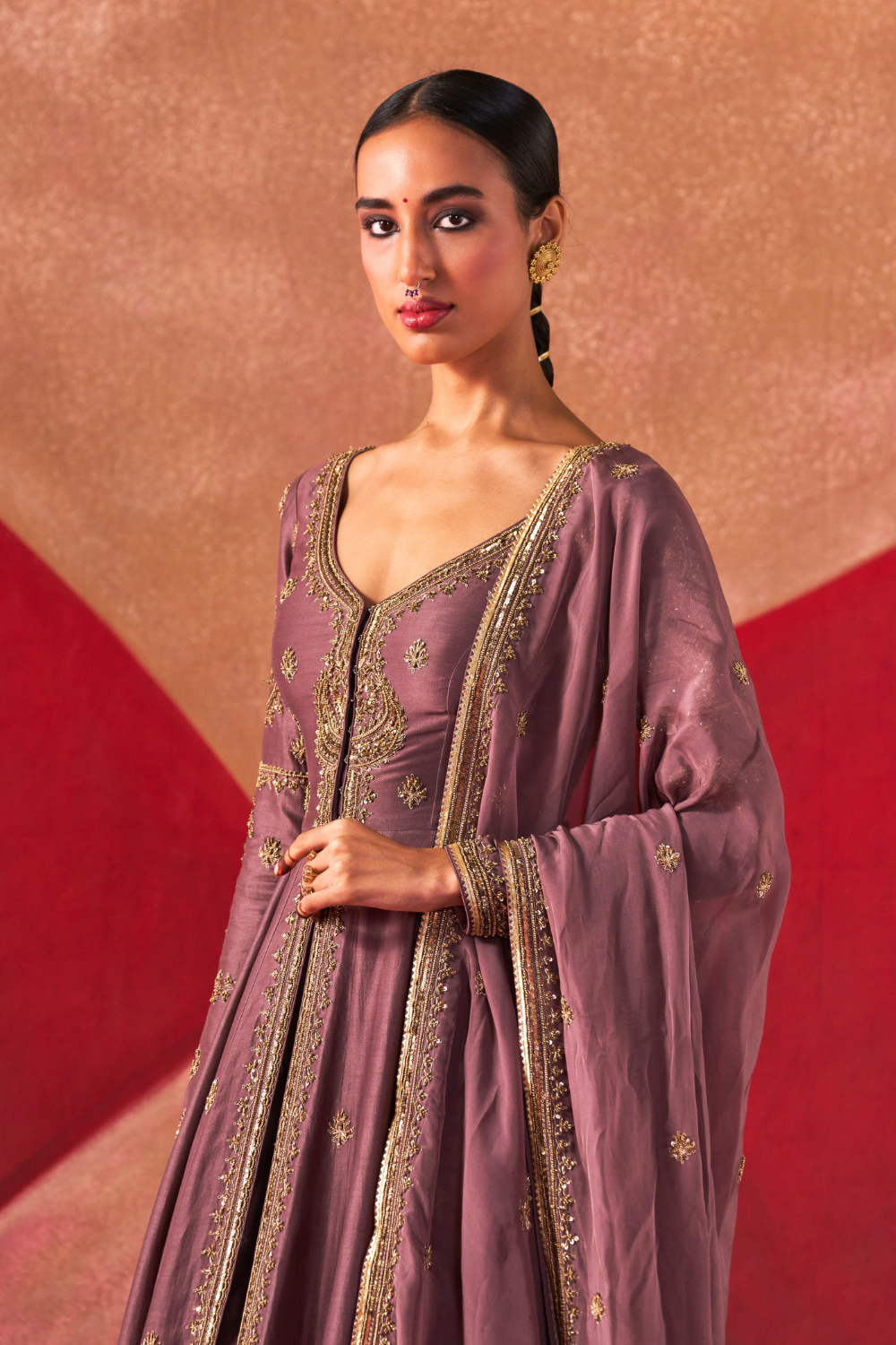 Featuring an antique voilet chanderi silk jacket set paired with an organza base dupatta with antique gold dori and embellished hand embroidery..