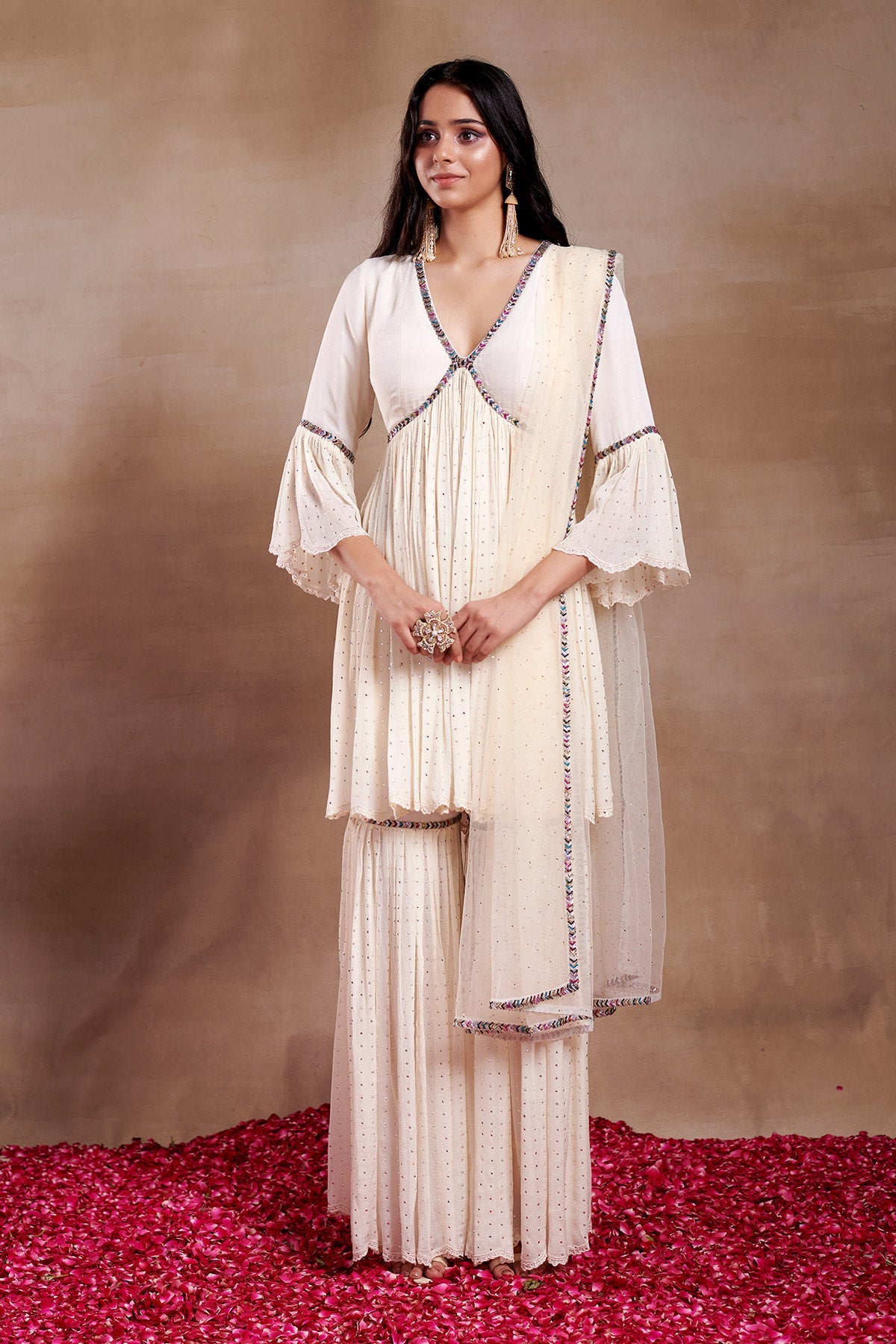 LIGHT FLAYERD CHINNON PEPLUM WITH MININAL EMROIDERED SHARARA AND AN ELEGANT DUPATTA
