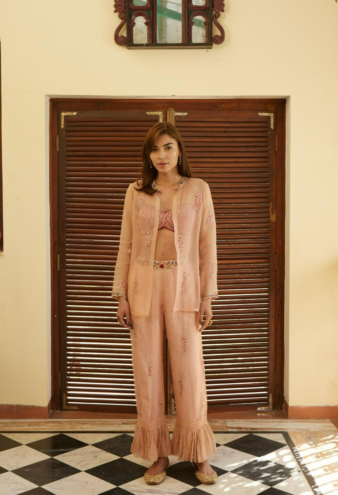 Showcasing Organza based rose pink jacket, with floral and geometric pattern. Handcrafted with multicolored, and mix-material embroidery. Paired with rose pink organza trousers and Chamundi silk wine bralette.