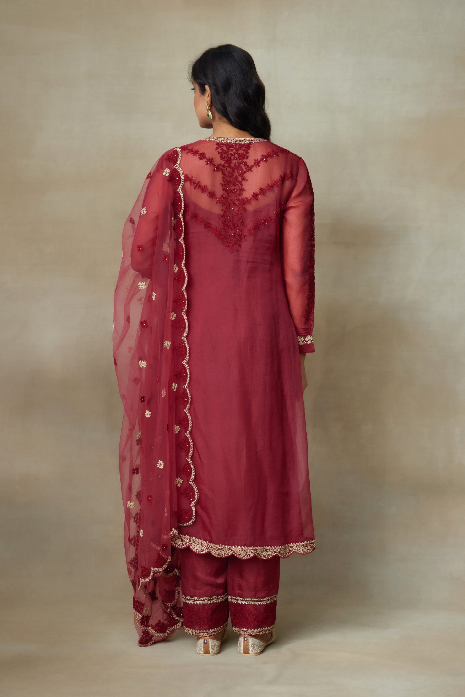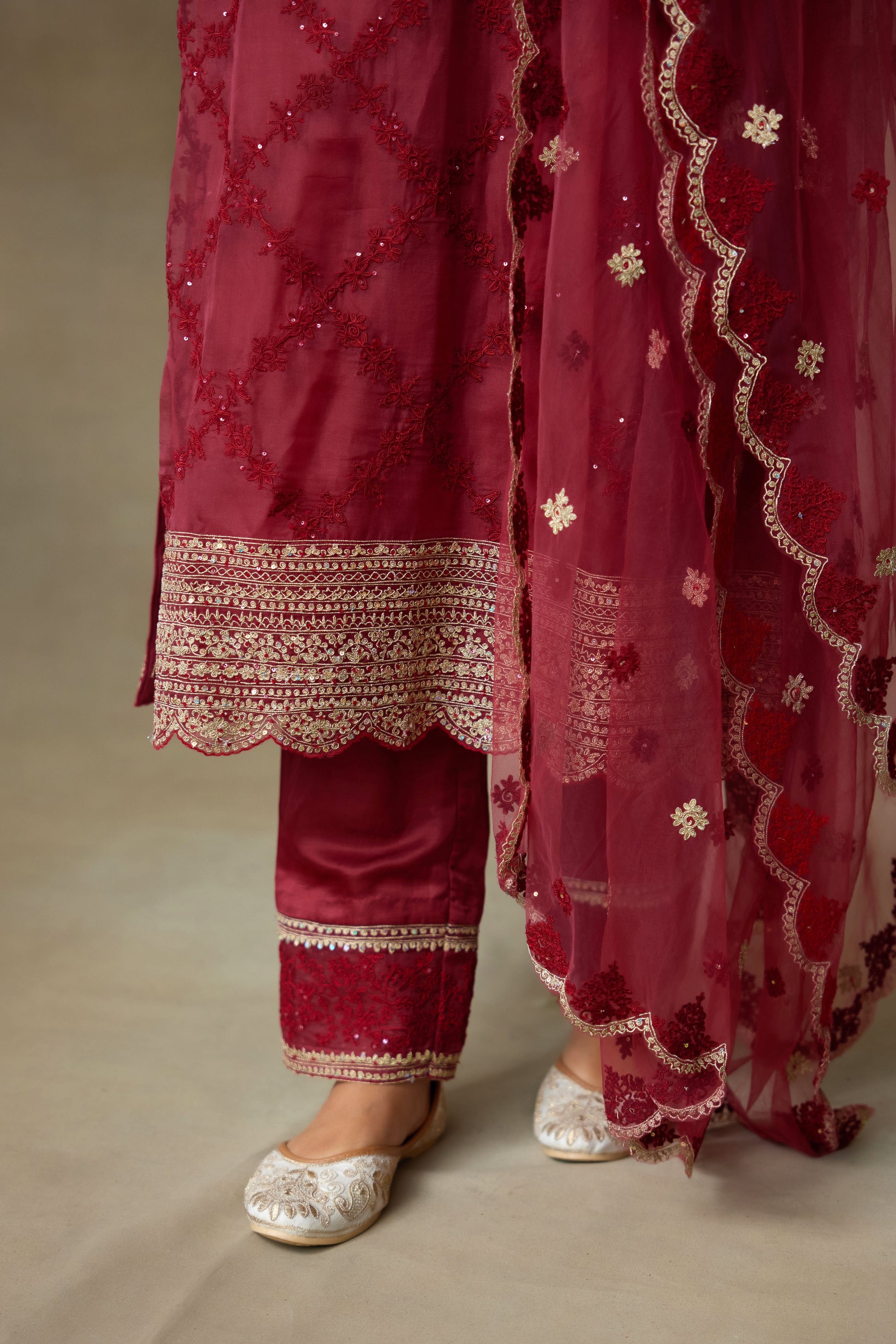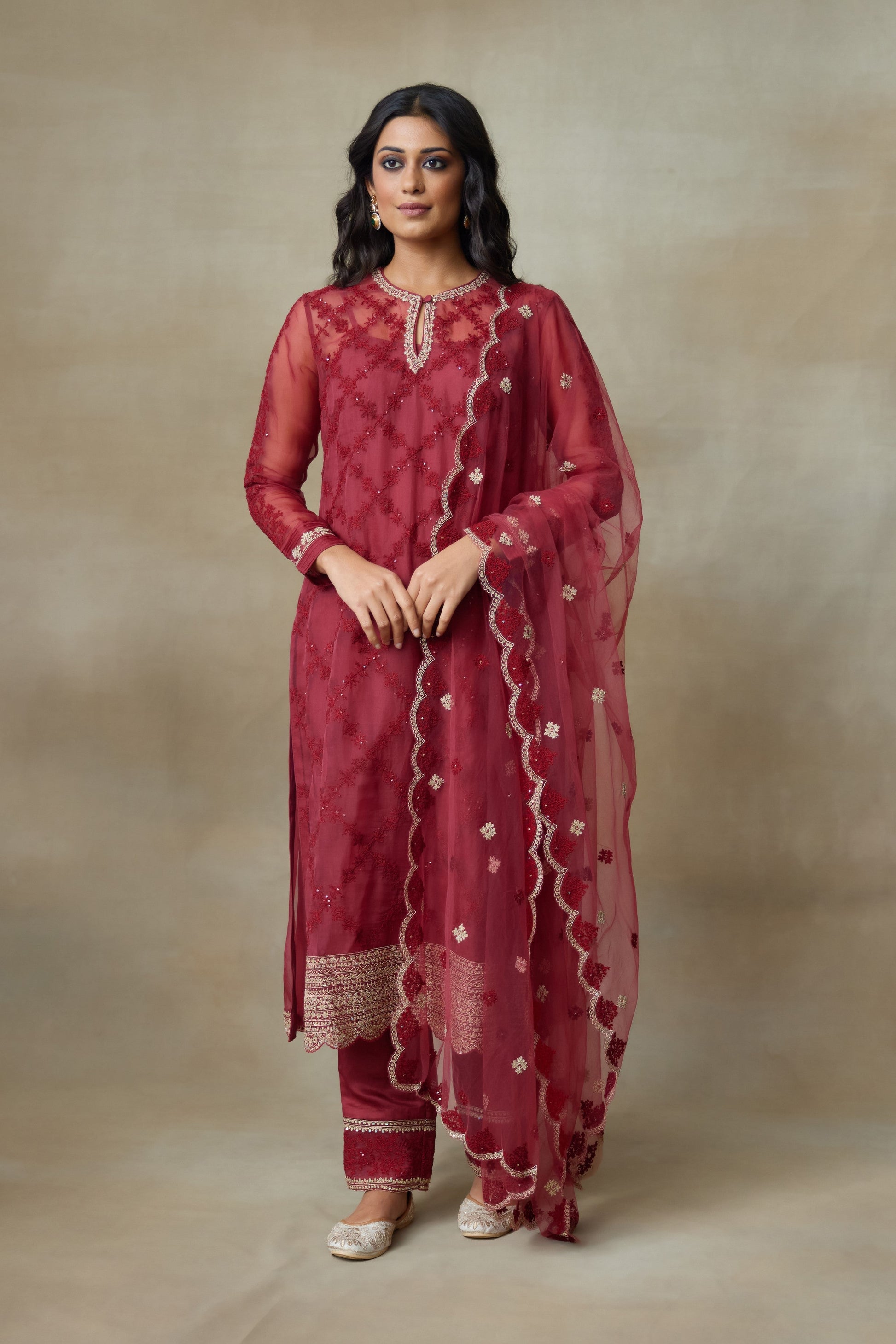 Our Silk Organza Red Kurta Set Is Paired With Chamundi Silk Pants And Organza Dupatta Having Resham Work Filling With Sequence Highlighting Diamond Shaped Golden Artwork Making It A Enchanting Ensemble.