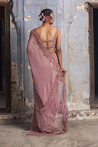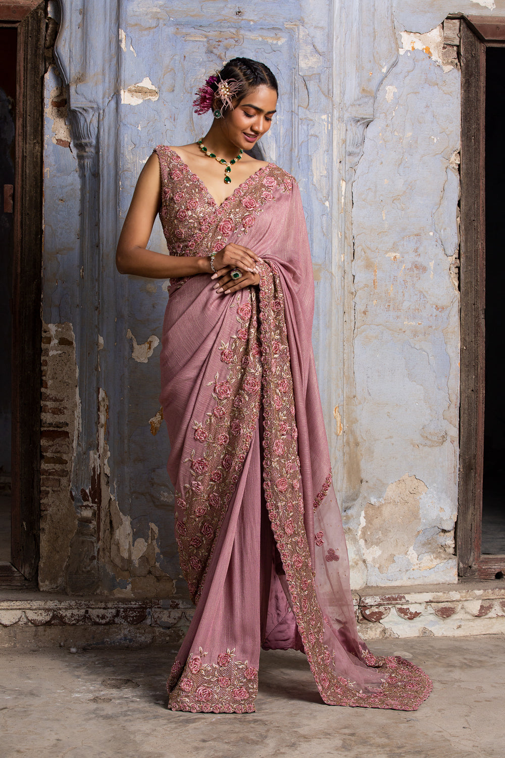 Rose Pink Lurex Georgette Saree with organza blouse and palla with 3D resham embroidery with tonal and gold sequins, and beadwork.