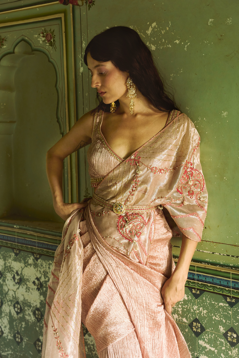 This rose crushed silk, in pre-stitched saree features a flattering fish-cut silhouette that beautifully contours the body while ensuring effortless movement. Its pure tissue pallu shimmers with delicate thread work, dori, gota, and soft sequins, adding a hint of refined glamour. Paired with a subtly embroidered crushed silk blouse, the ensemble embodies an elegant blend of contemporary charm and timeless grace.