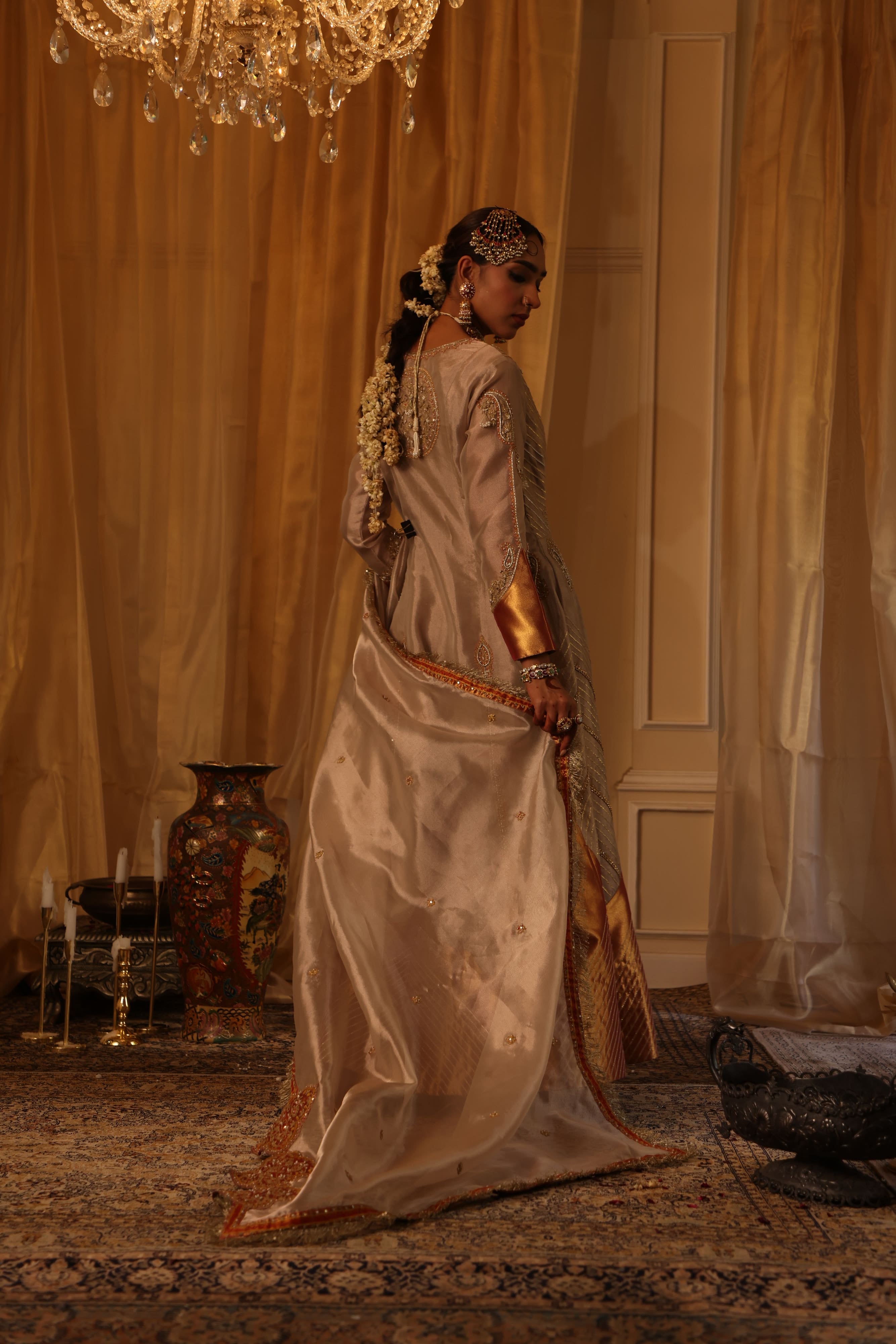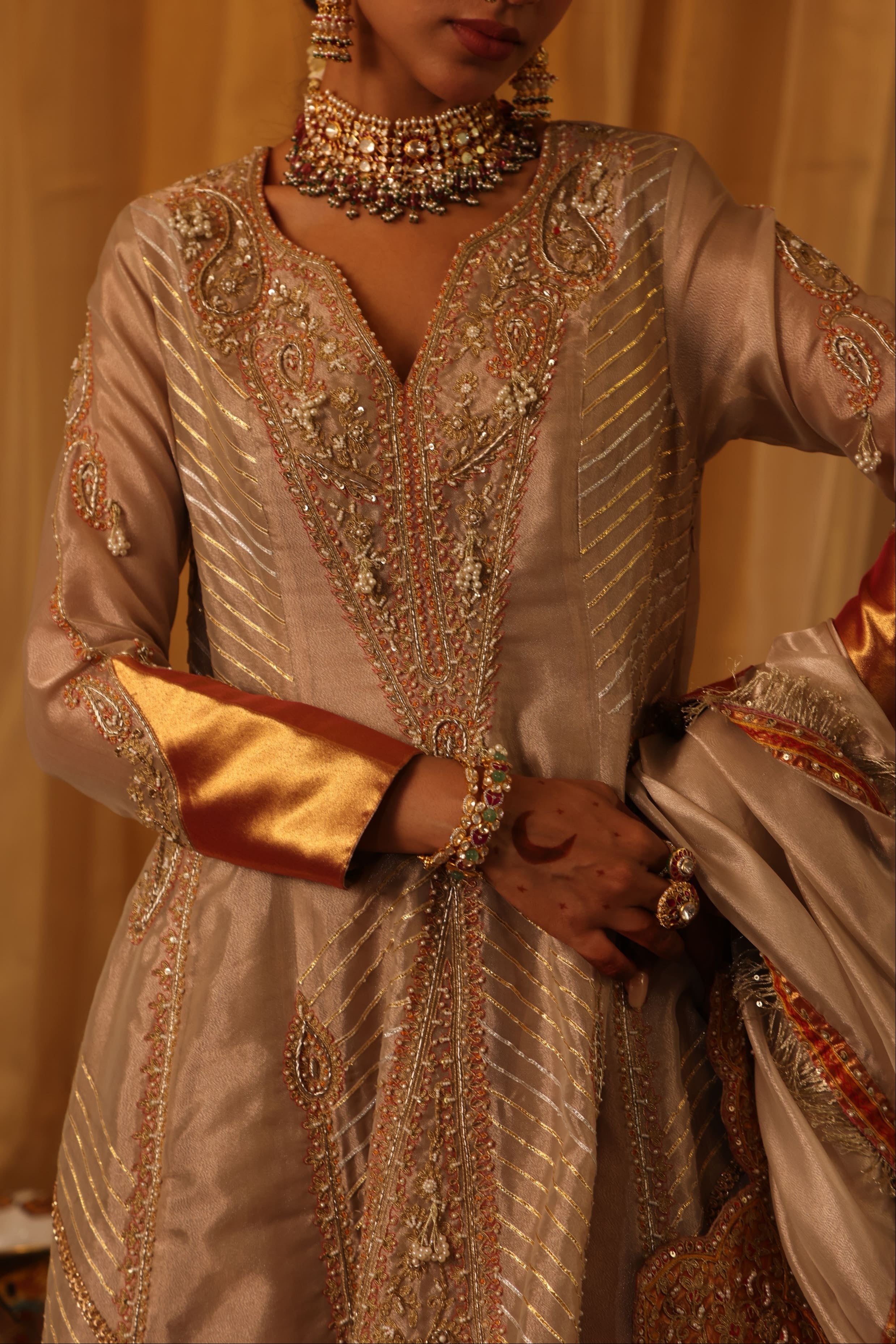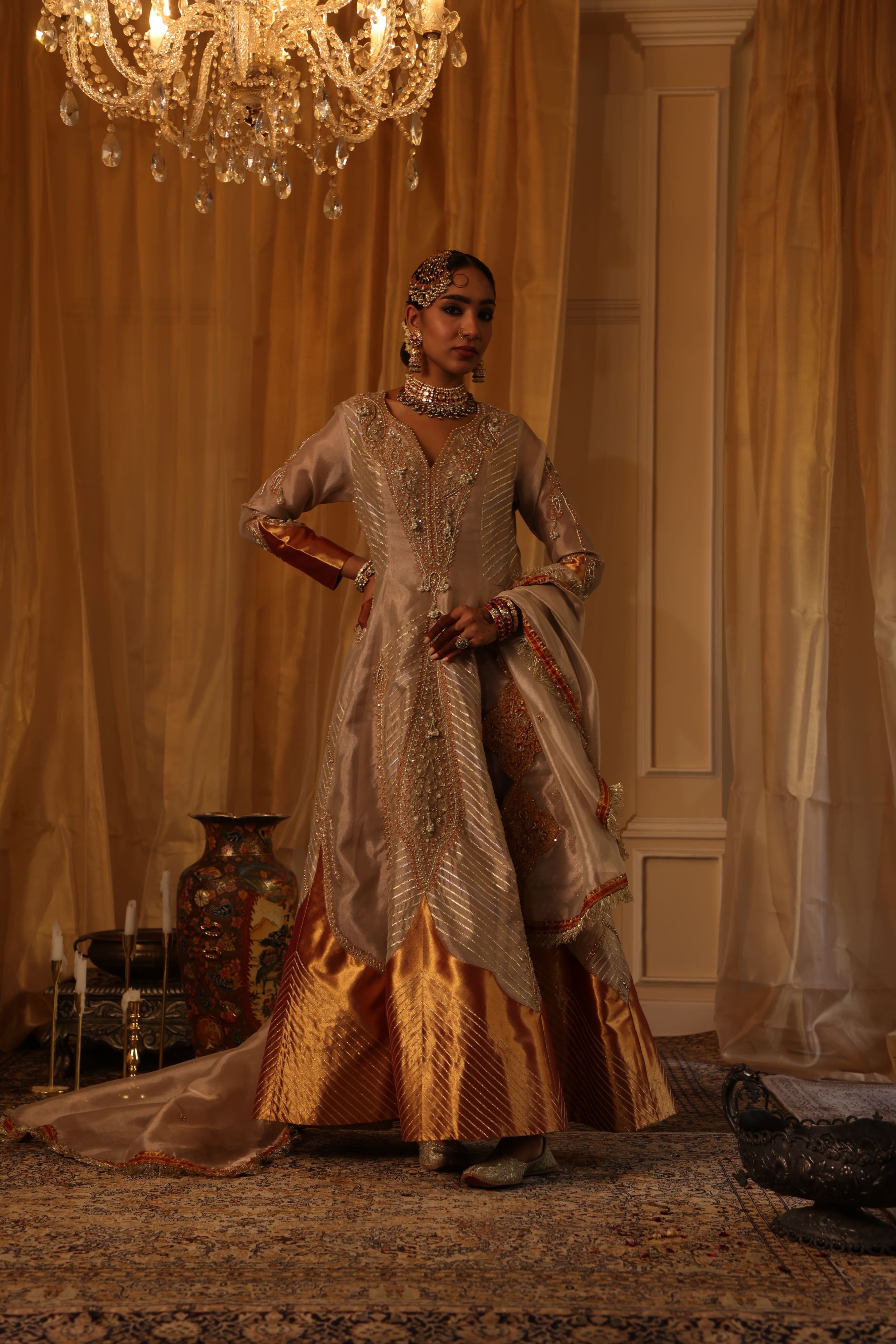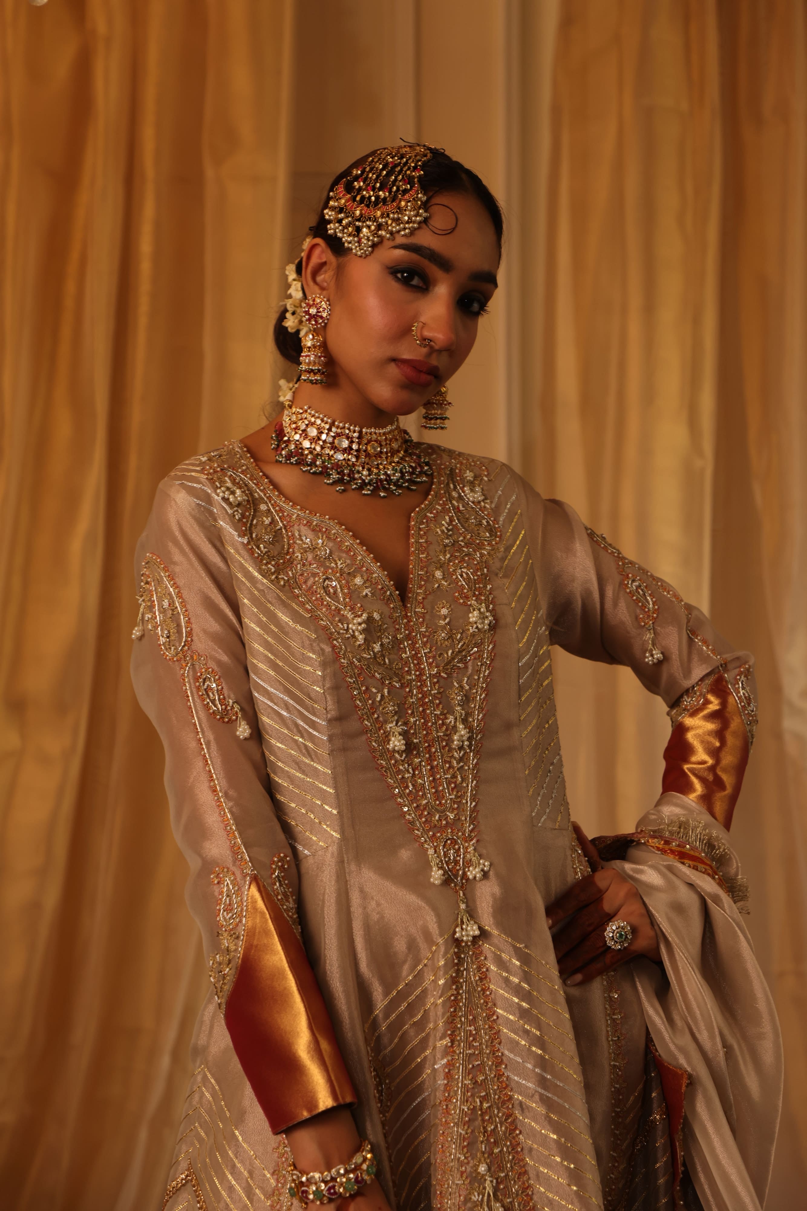 This rose gold pure zari tissue Anarkali set is a masterpiece of intricate detailing, featuring elongated paisley motifs with zari, dori, thread, pearl work, and hand embroidery. The hot pink Banarasi hemline adds a striking contrast, while the rose gold tissue dupatta with scalloped edges, fringe detailing, and embroidery. Fabric: Zari tissue |