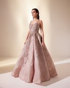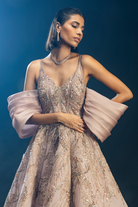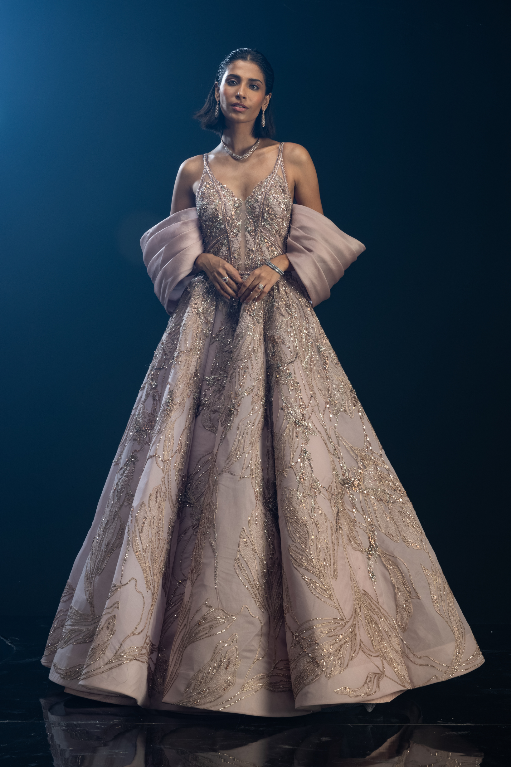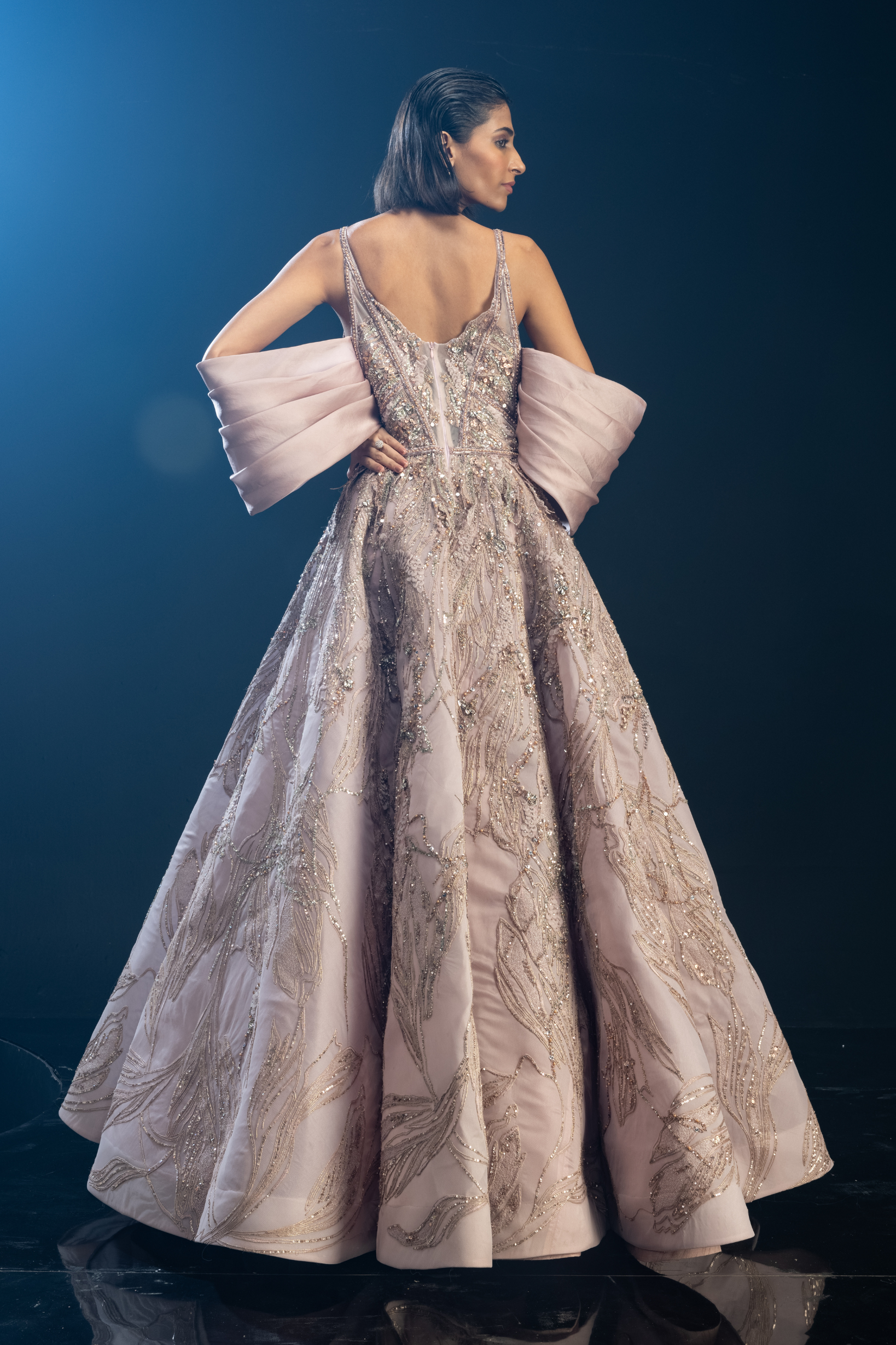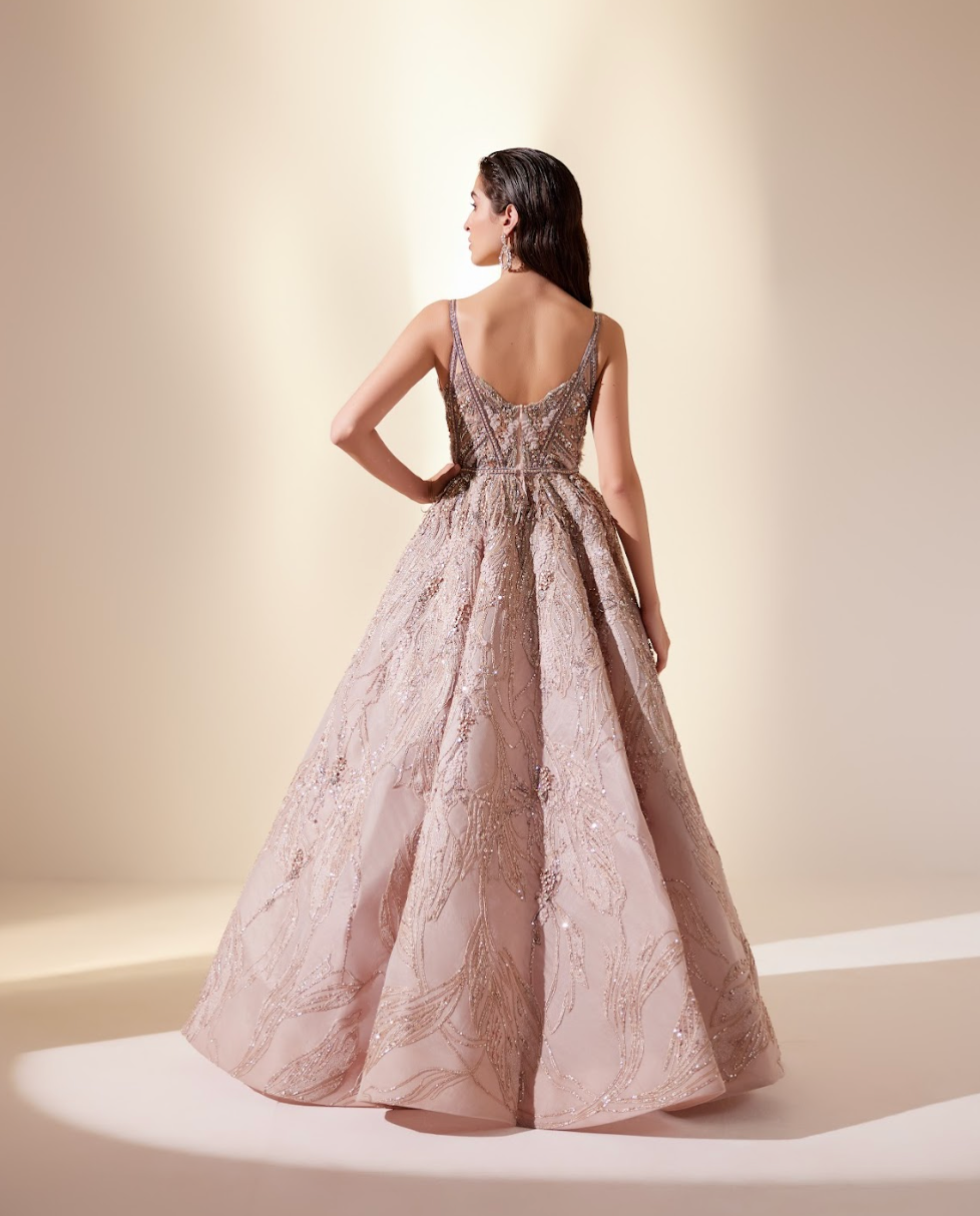 Rose gold cloudart gown having elegant, deep neckline, accentuated with gleaming rhythmic embroidery.