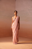 Blush shimmer satin pre-draped saree with a 3-D floral embroidered halter cut blouse in resham and stone work.
