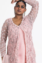 Rose Pink Net Jacket And Dupatta Embroidered In Tonal Sequins, Beads, And Crystals With 3-D Flowers, Paired With A Georgette Slip And Sharara.