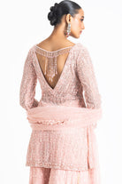 Georgette Rose Pink Sharara Set With A Fully Embroidered Upper And Self-Embroidered Georgette Sharara, Along With A Net Dupatta Featuring Sequin Frills On The Dupatta'S Edges.