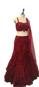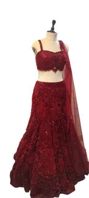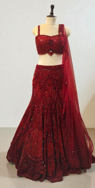 This luxurious, deep ruby-red lehenga choli is a masterpiece of craftsmanship, featuring elaborate 3D floral appliqués and dense all-over sequin and cutdana embroidery that catches the light beautifully. A perfect blend of traditional luxury and modern design.