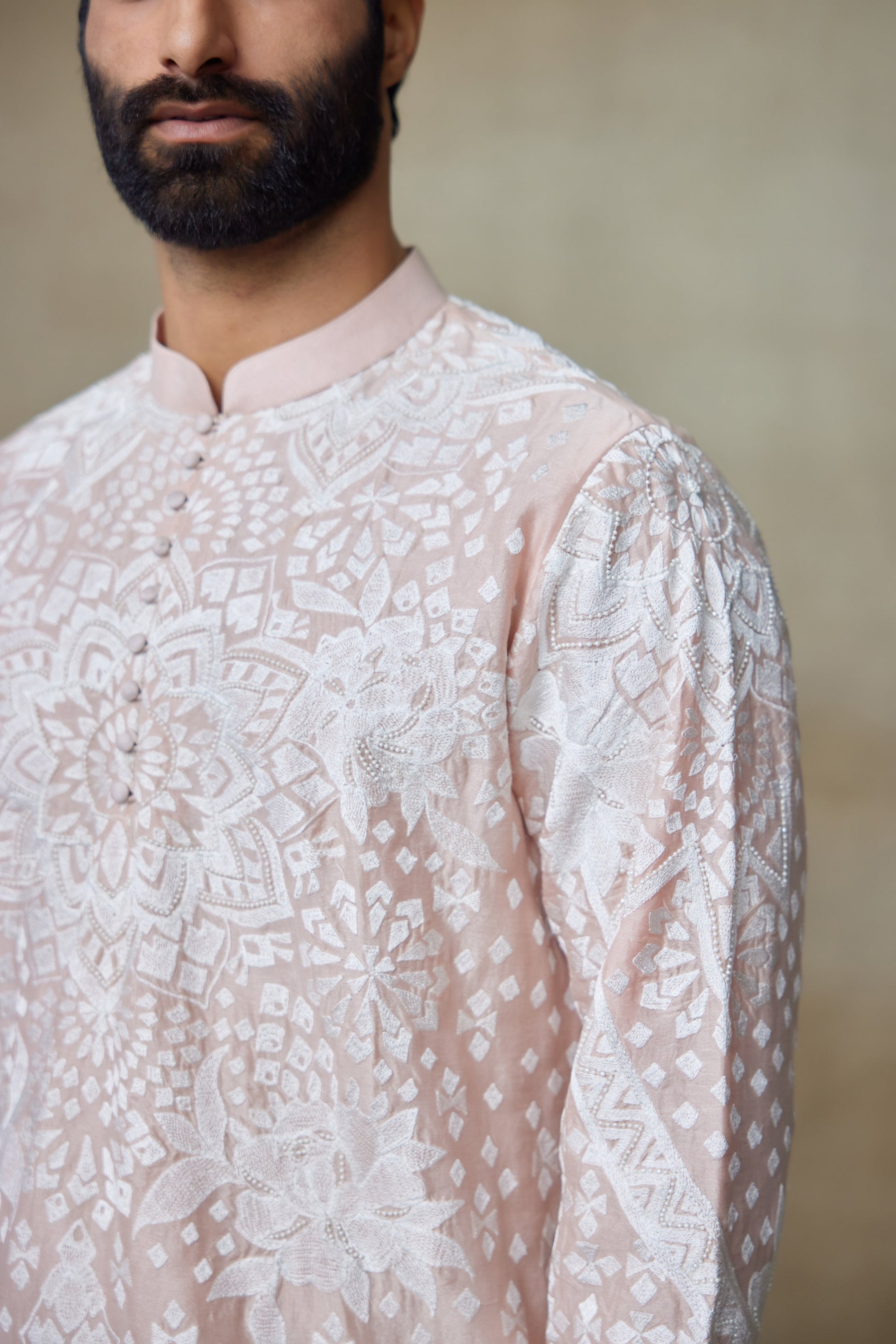 Our Beautiful Tonal Geometric And Floral Embroidered Silk Resham Work All Over Hand Embroidered With Tonal Pearls Embellishment.