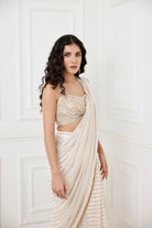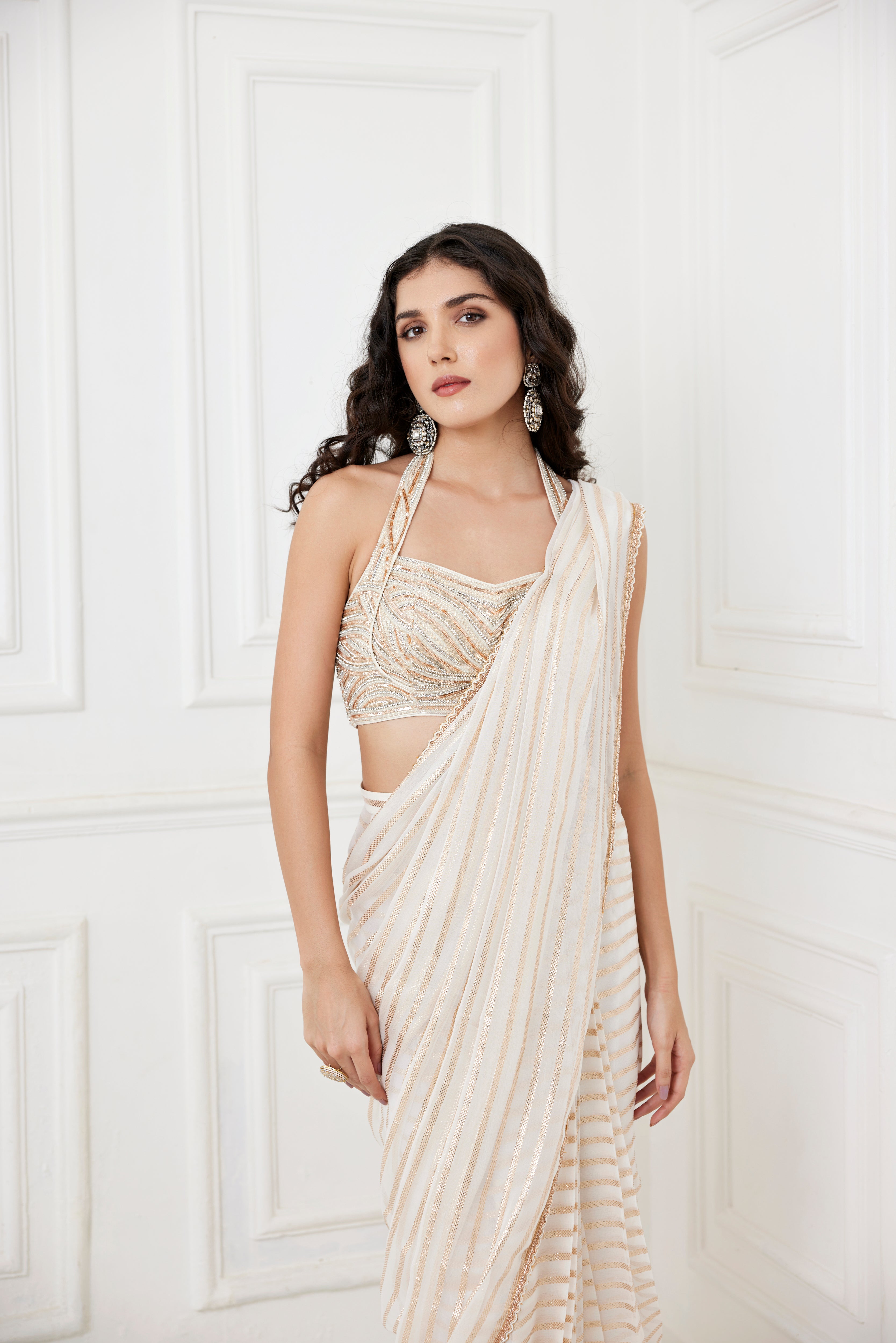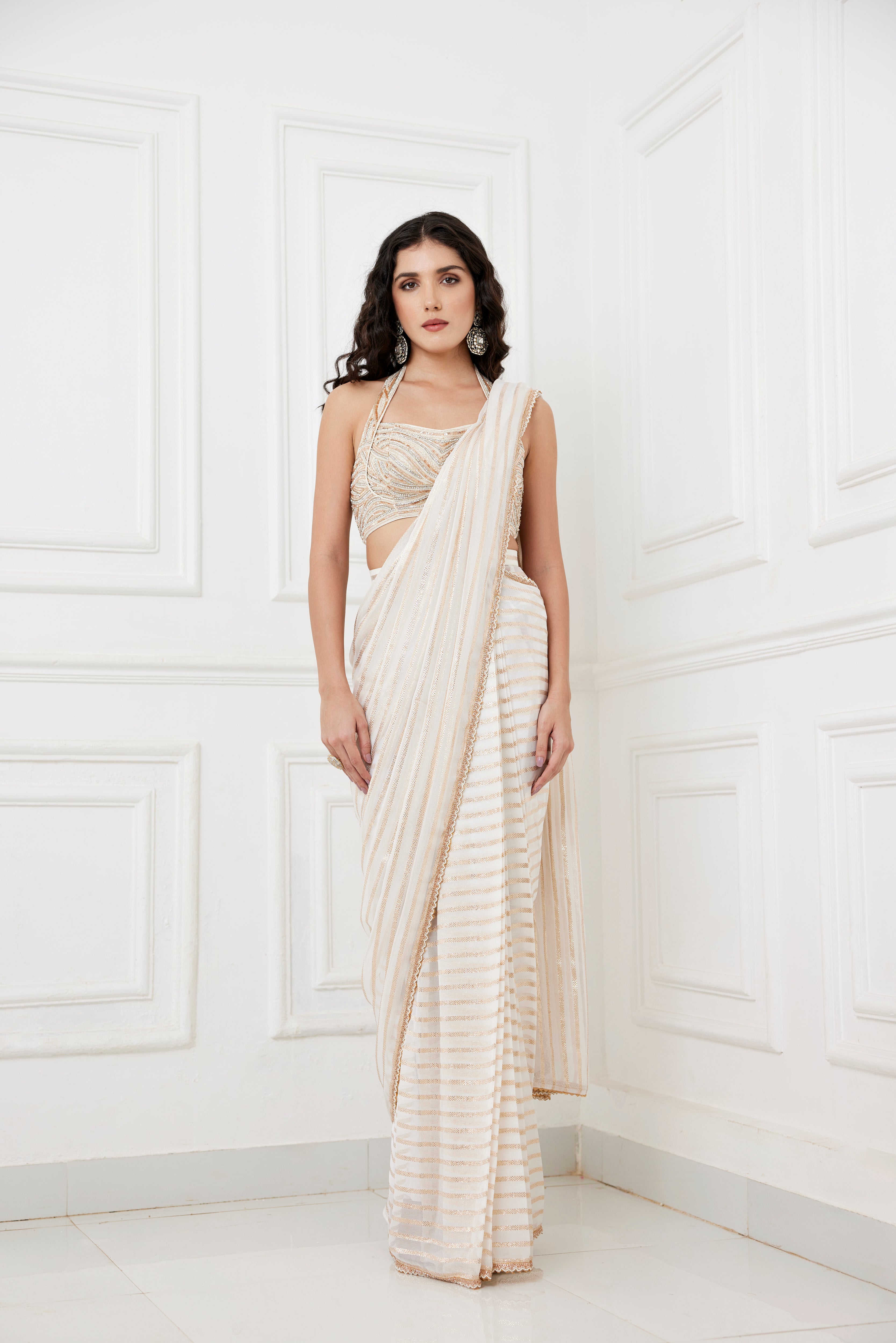 Ivory georgette saree with zari lines paired with heavily embroidered glass beads and sequins work halter neck blouse.