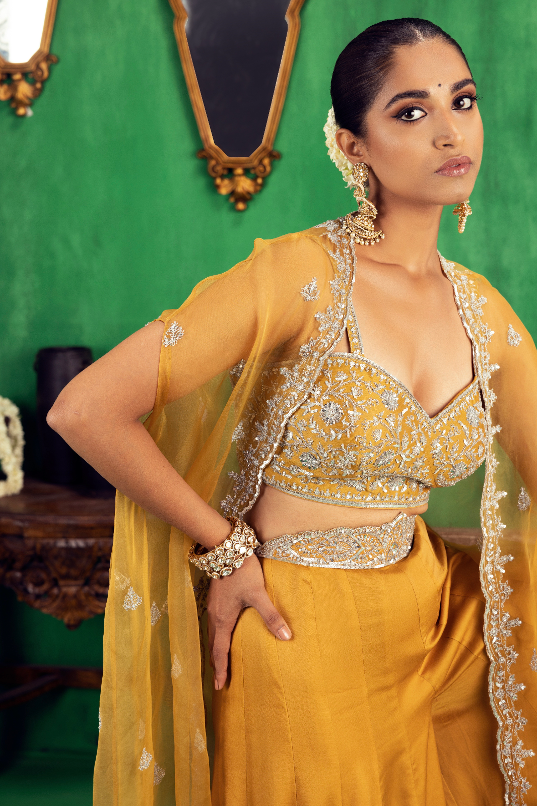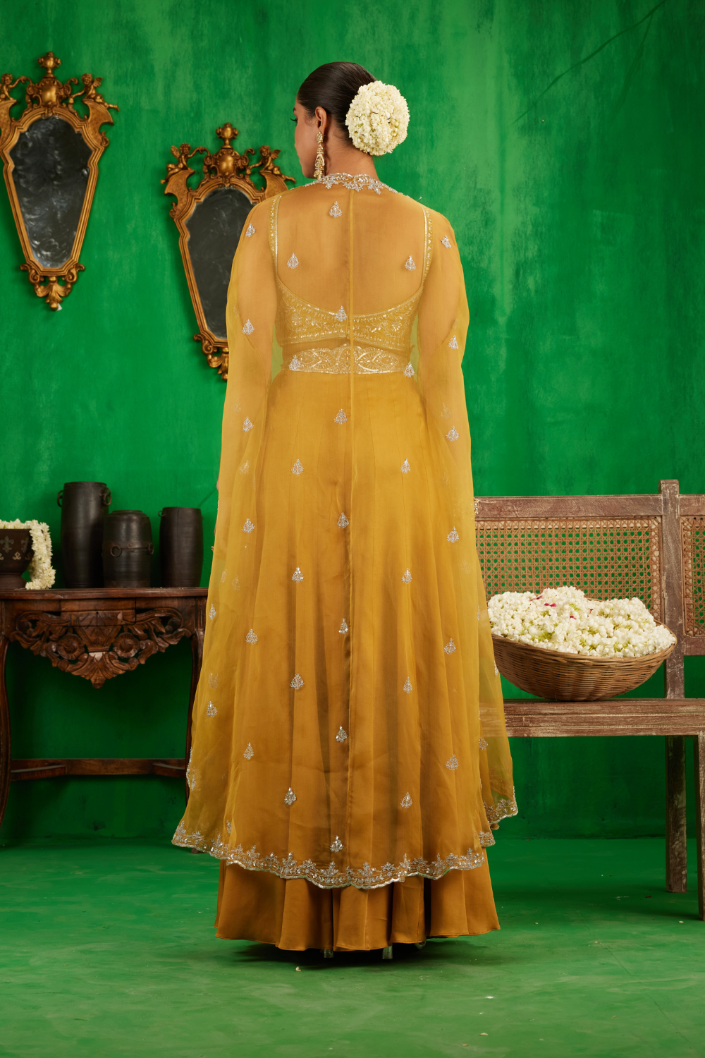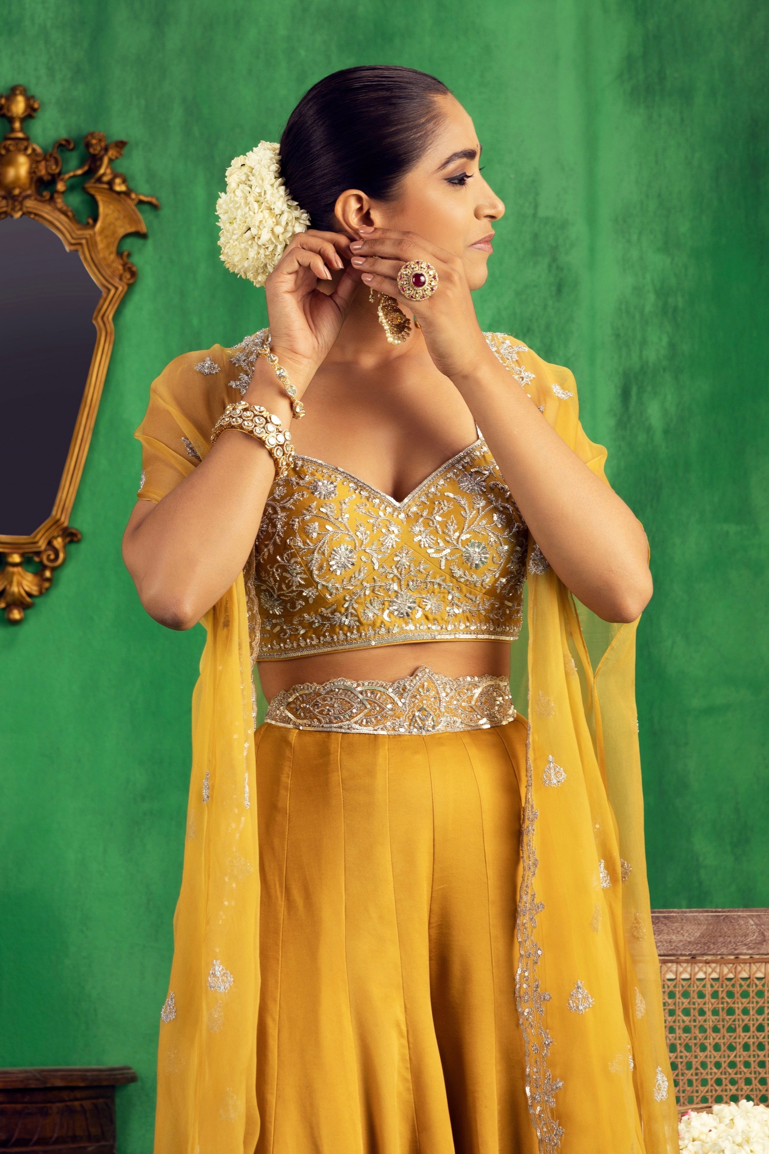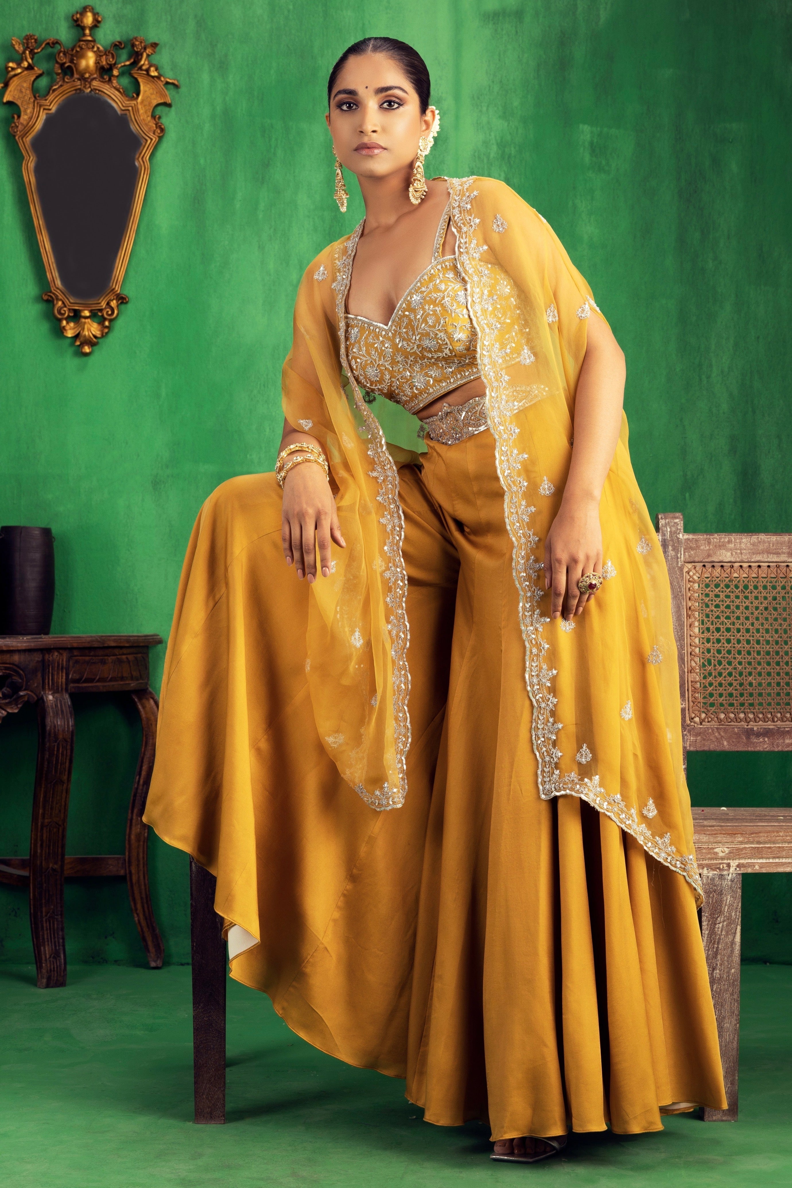 Featuring a mustard coloured Chanderi bustier and Satin Georgette sharara set paired with an organza cape with dull silver aari and zari embroidery