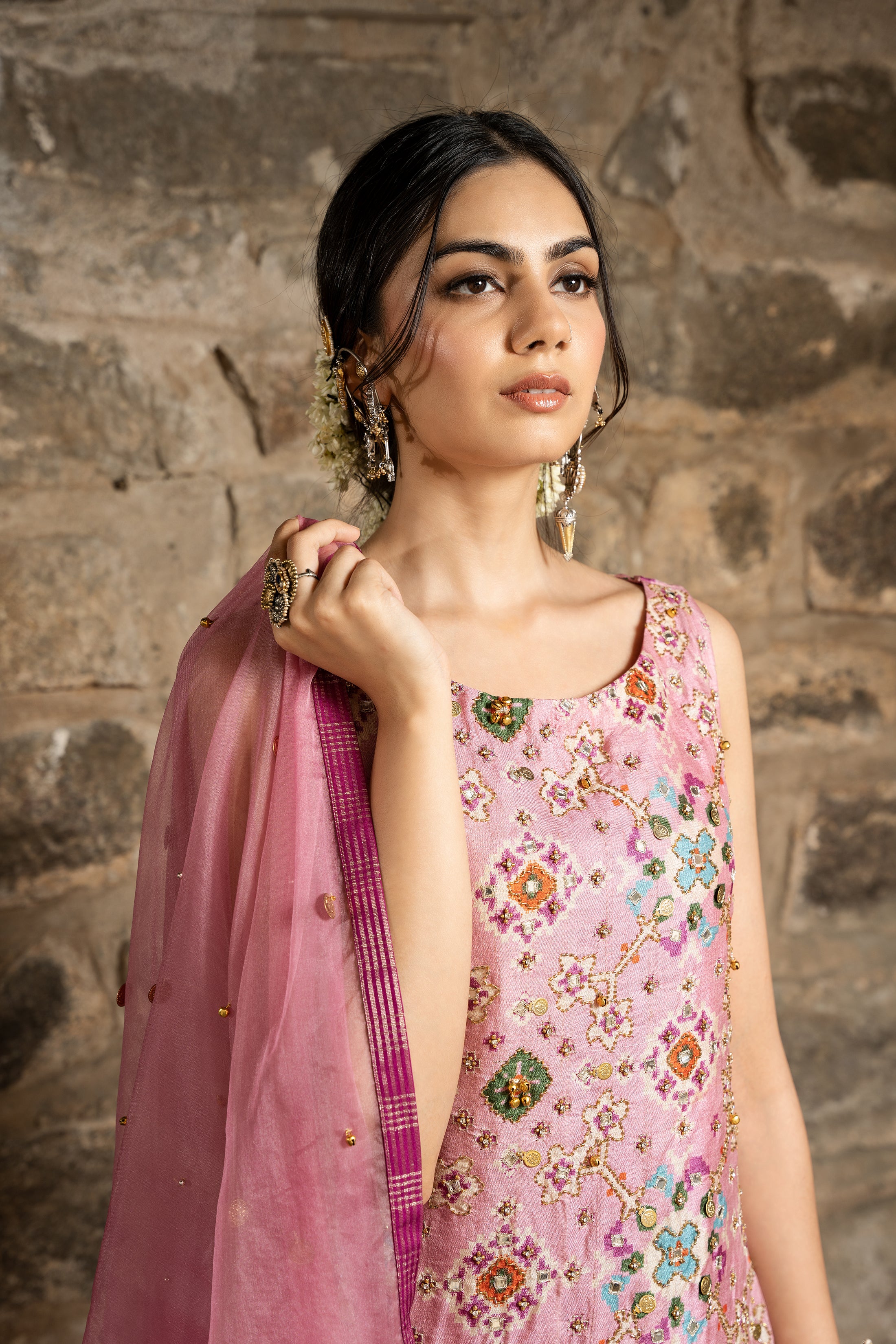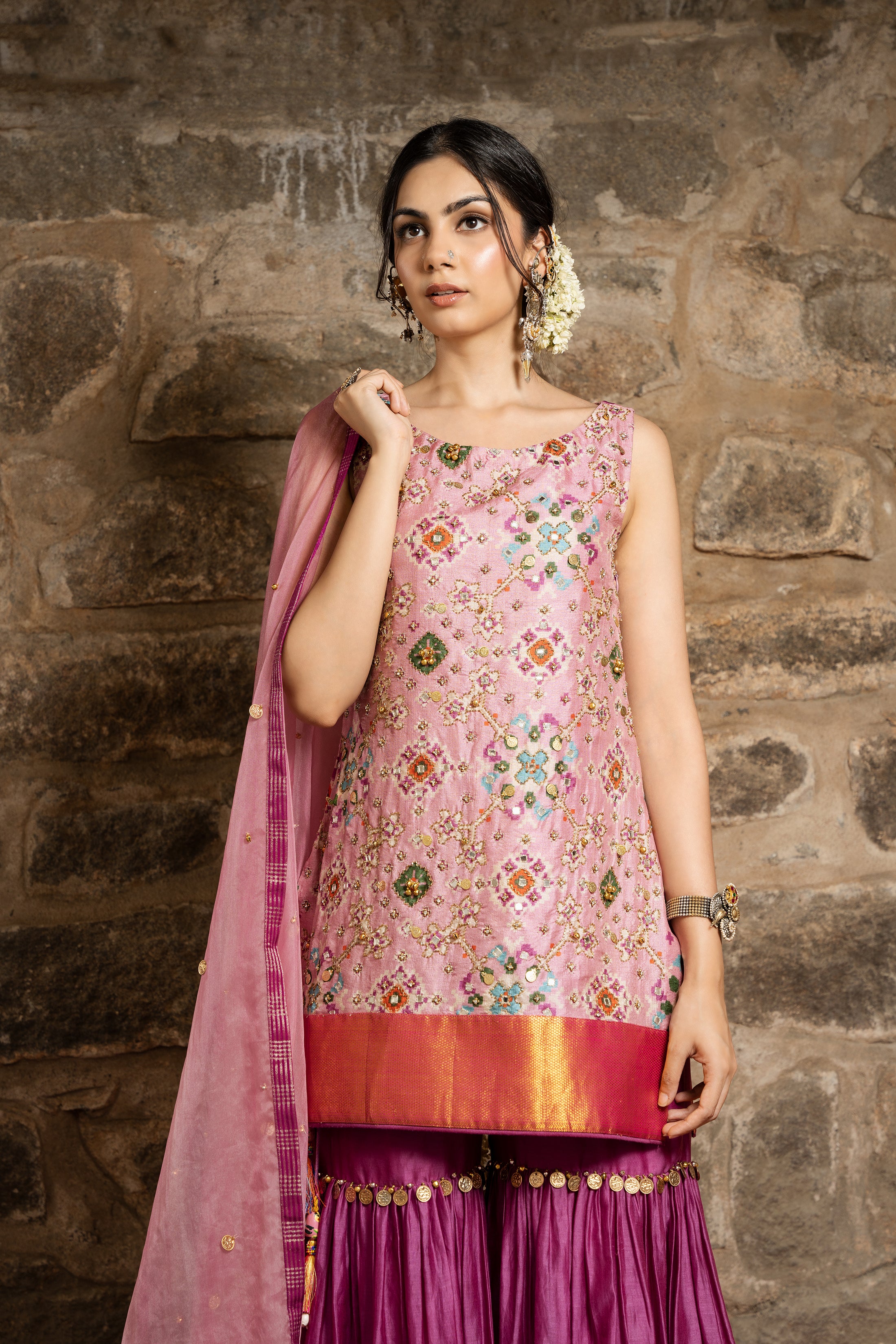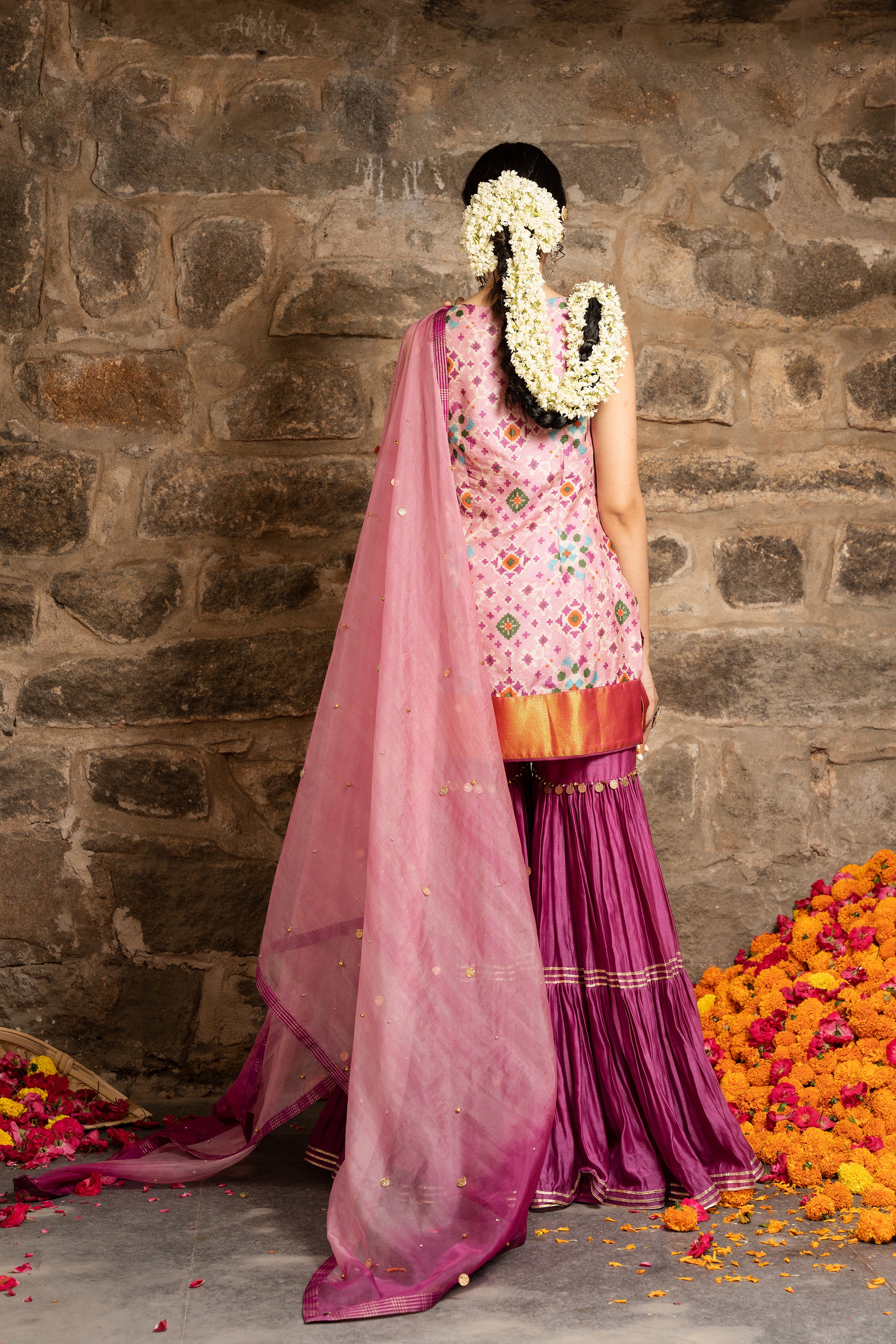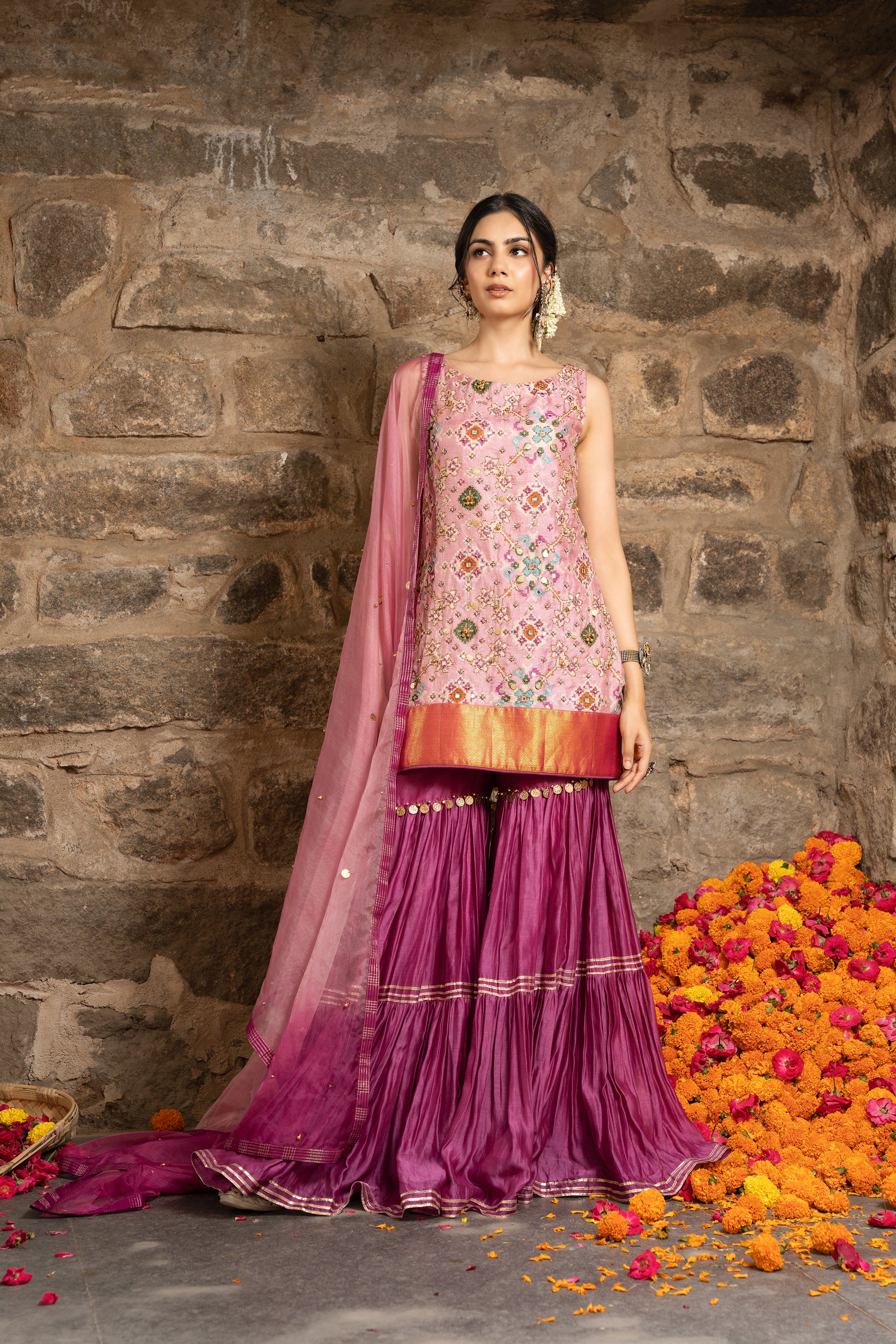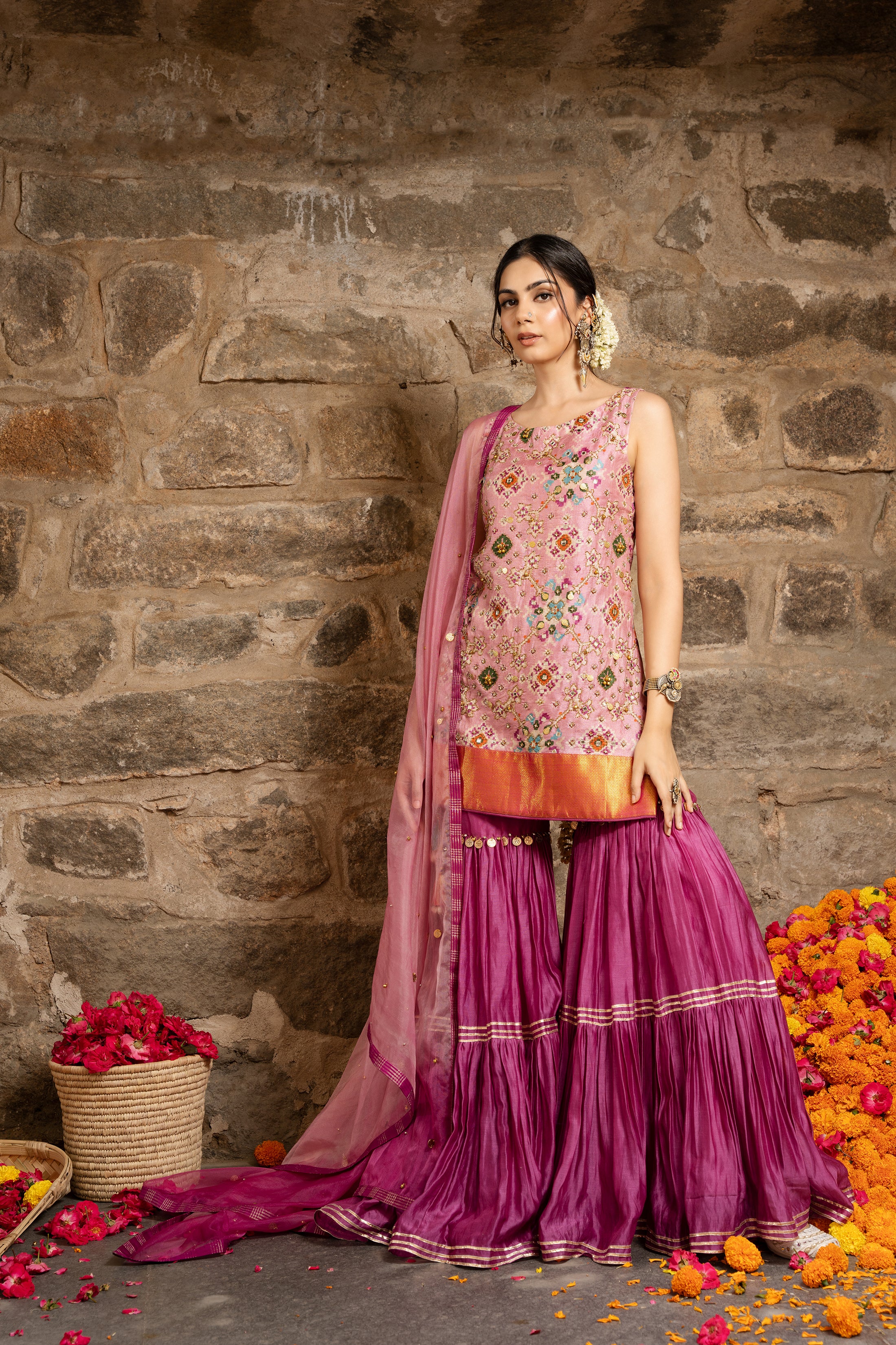 Blossom pink sharara set, paired with organza dupatta, is a mesmerizing ensemble with mettalic hues. It radiates beauty and elegance with is exquisite design, perfect for celebrations.