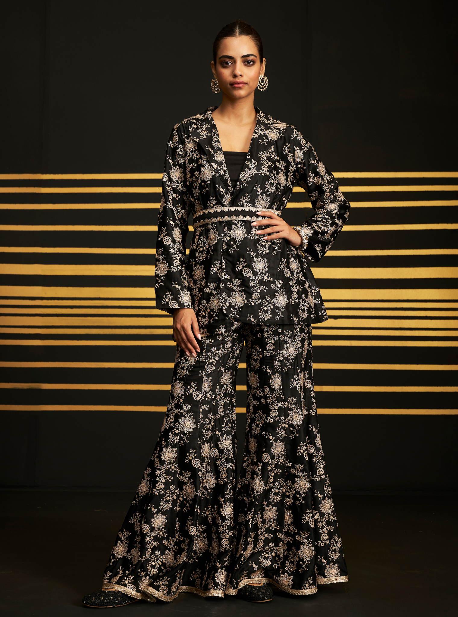 Contact Us For CustomizationThis vibrant co-ord set radiates festive charm with its striking fuchsia base, adorned with intricate gold thread floral motifs. The V-neckline and cinched waist create a flattering silhouette, while the flared pants add a touch of drama to the ensemble. Perfect for a sangeet or a lively wedding function, this outfit balances tradition with a modern twist. The detailed embroidery and flowing fabric make it a show-stopping choice for any celebration, ensuring you stand out in style and elegance.
